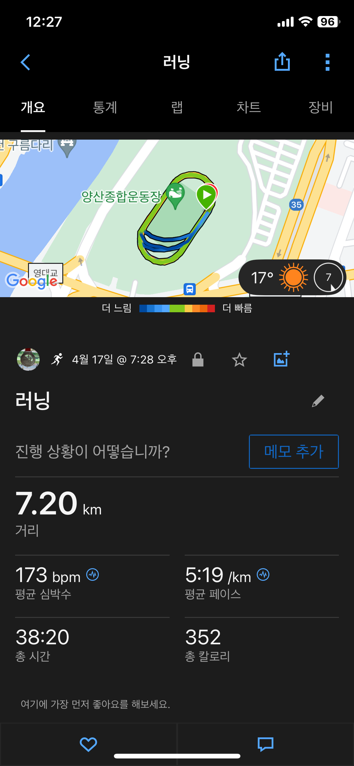 그래도 포기 하지 않고 6회 인터벌 마무리! 평소처럼 조깅하고 마지막에만 80%질주 하면서 심박을 안정시키라는 서브3 동료가 조언해줬다. 다음 조깅부터는 그렇게 해야겠다.