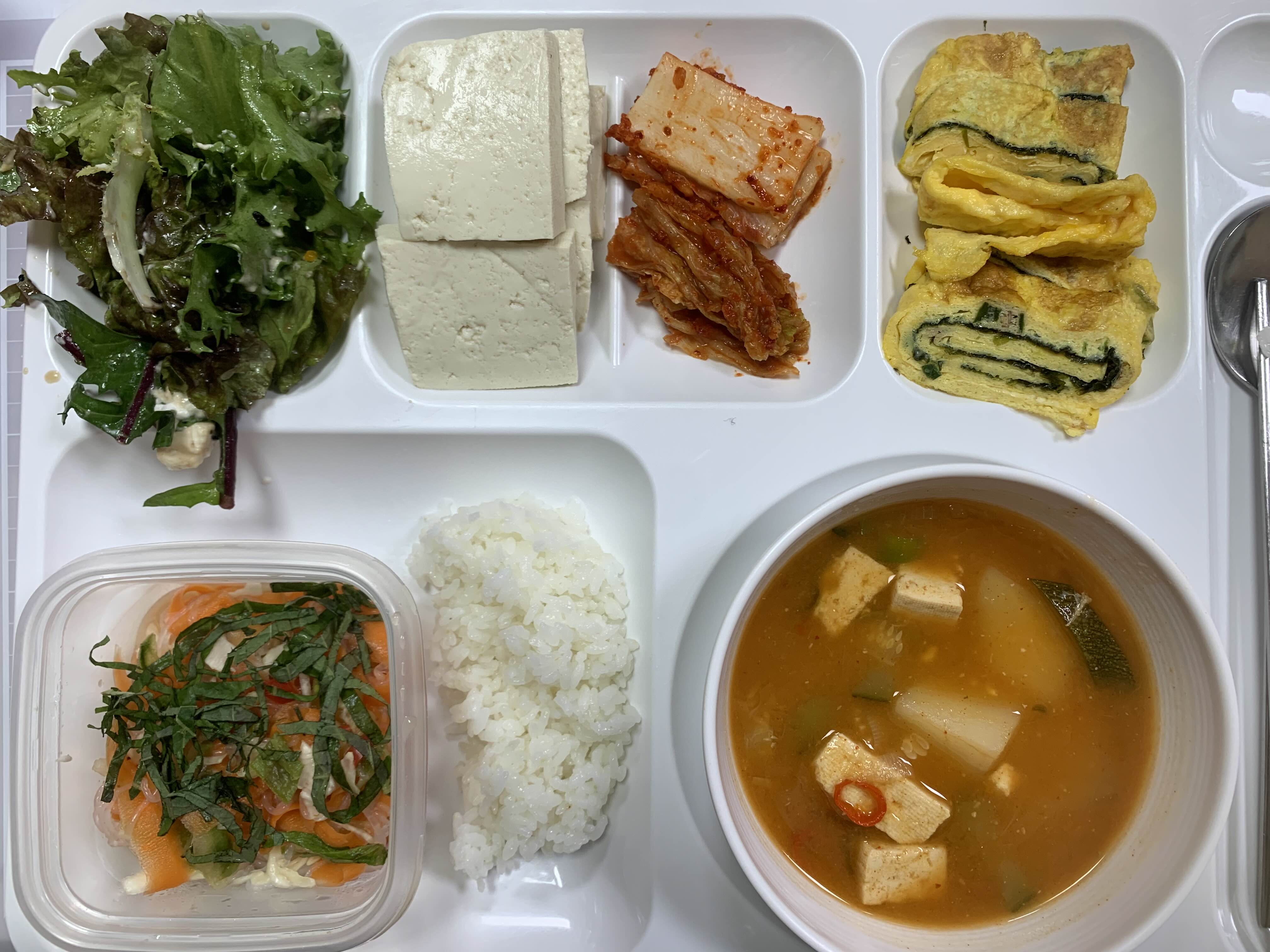 오늘은 단백질 폭탄 급식이다. 볶음 김치가 있었는데 생김치를 가져 왔다. 나는 다이어터러 나름 제한했다.