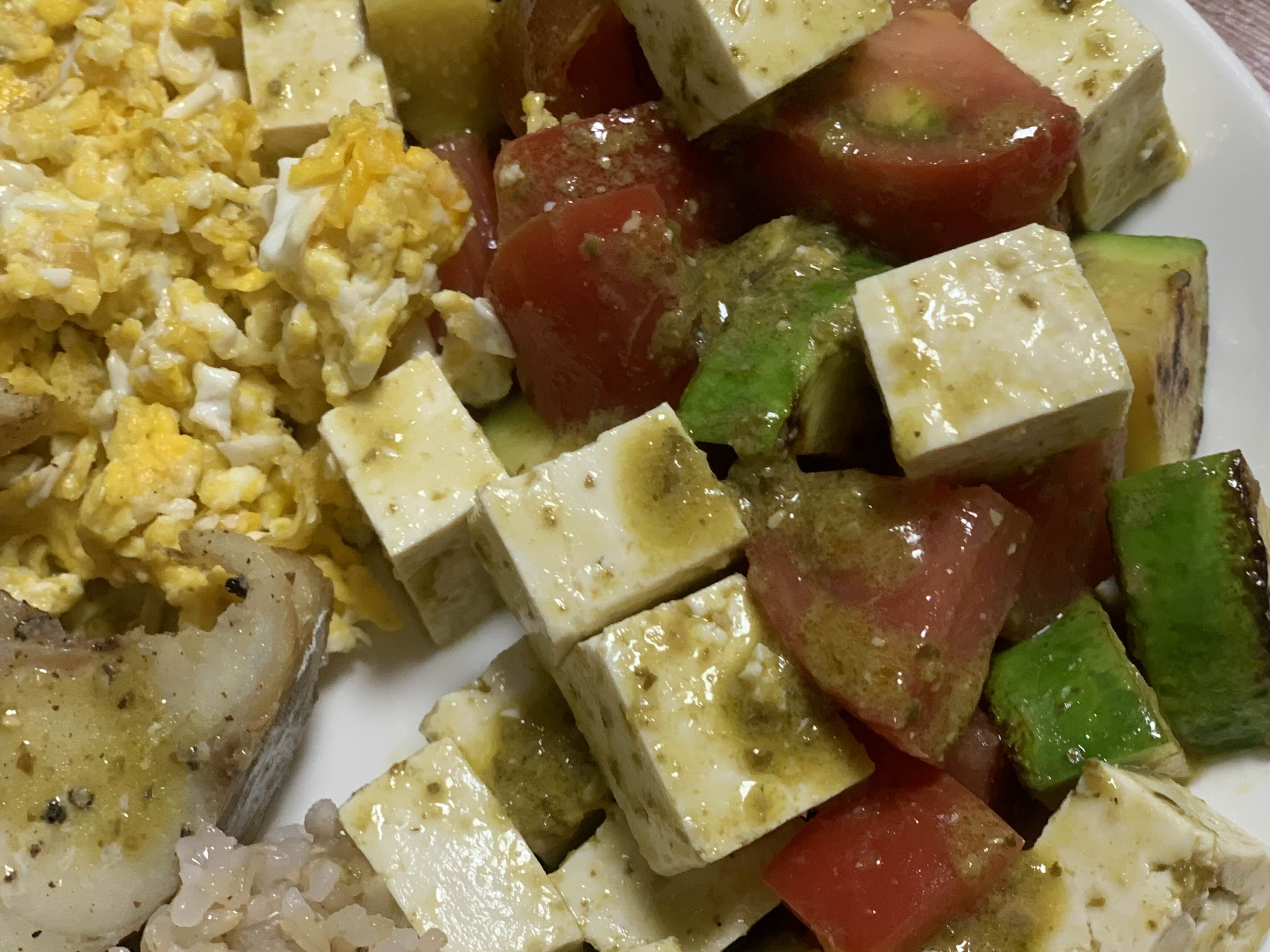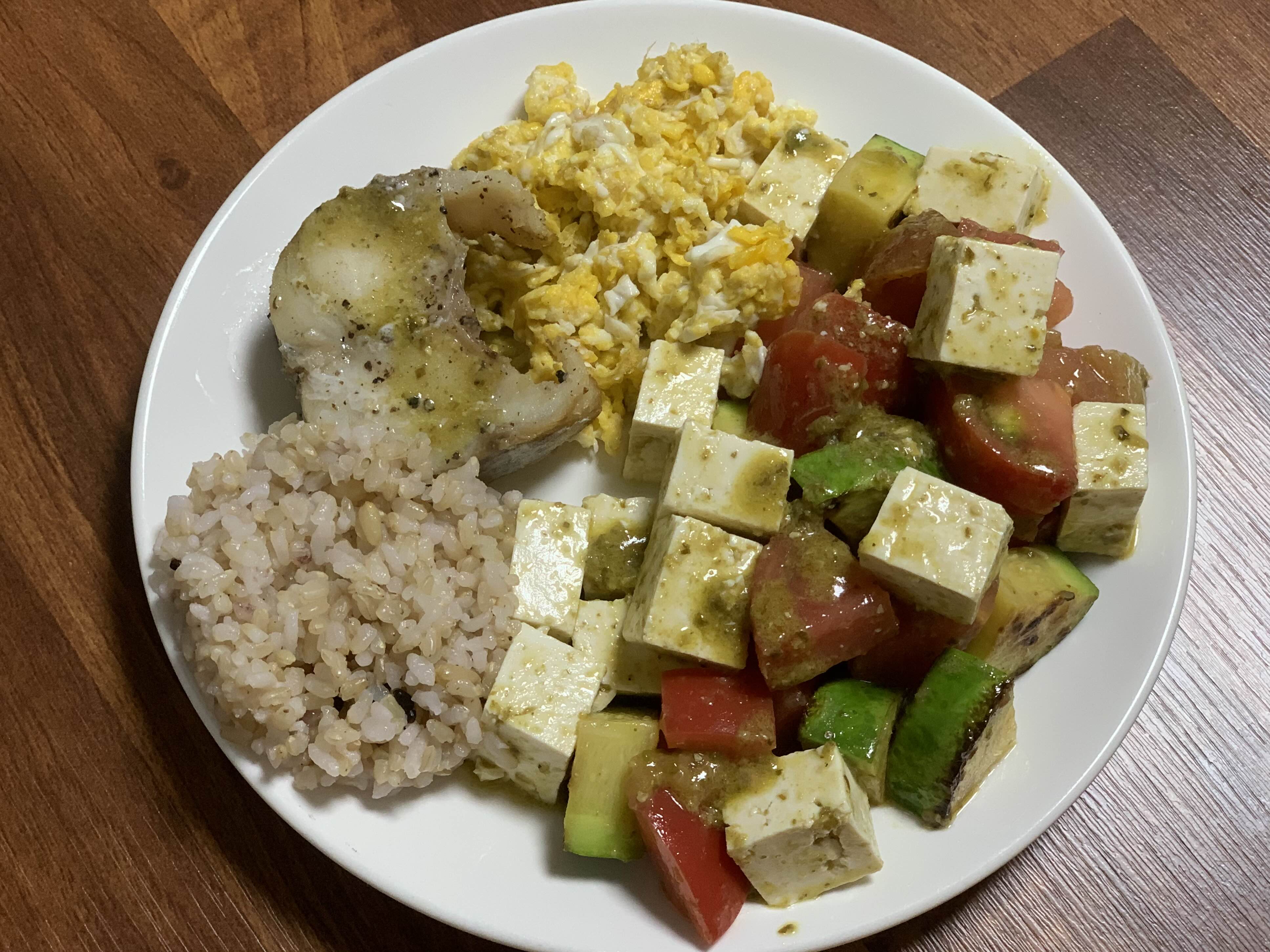 구운 애호박, 생두부, 토마토에 바질페스토 소스 뿌렸다. 단백질 조금 아쉬워서 계란 하나 스크램블 하고, 현미밥 60g