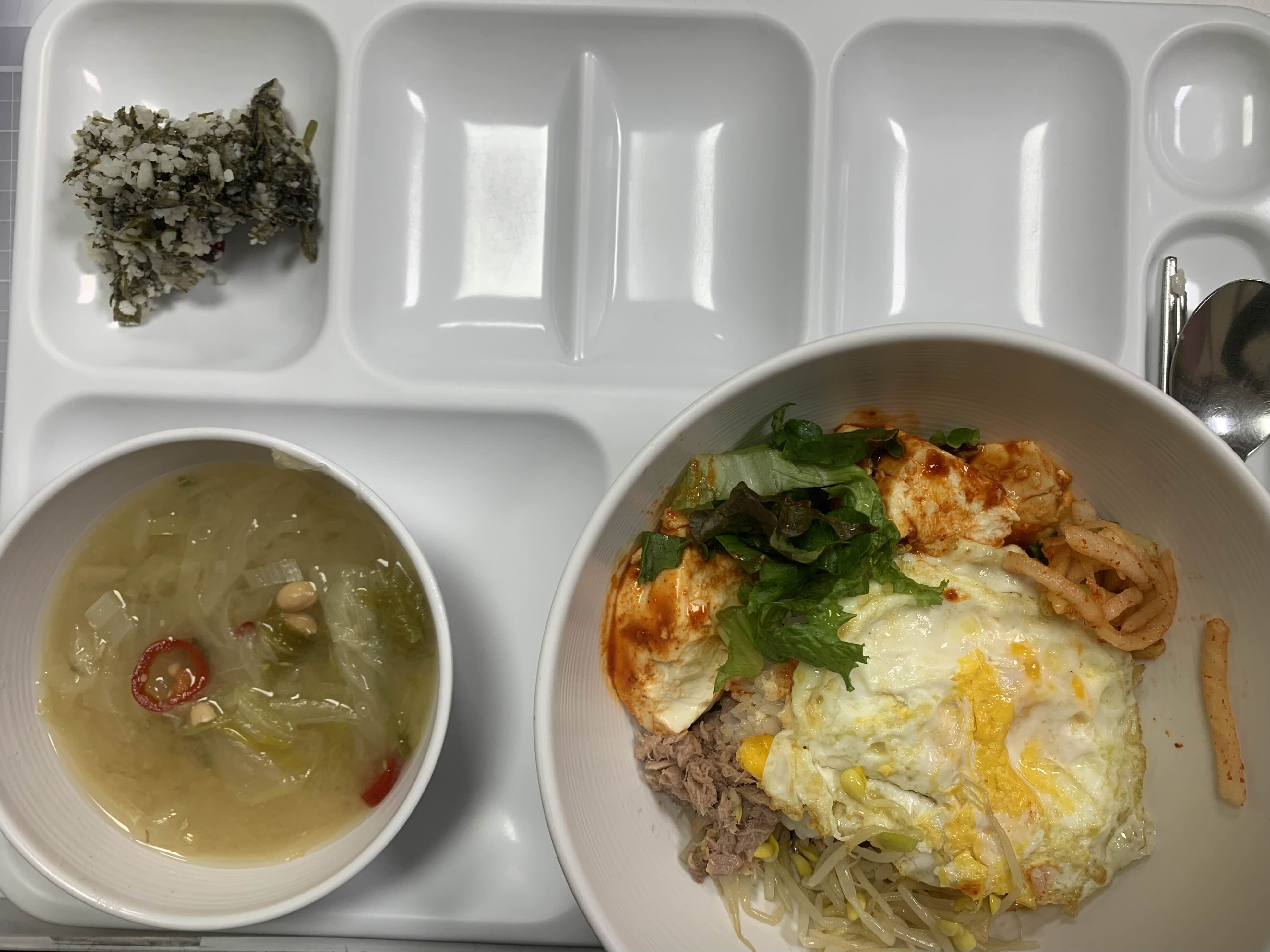 참치, 계란에 단백질도 있고 다이어트비빔밥으로 괜찮다. 밀가루라면 안먹었을텐데 쌀가루로 찐 쑥버무리라서 가지고 왔다. 그런데 너무 설탕맛이 나서 반만 먹었다. 국은 먹더기만 먹었다.