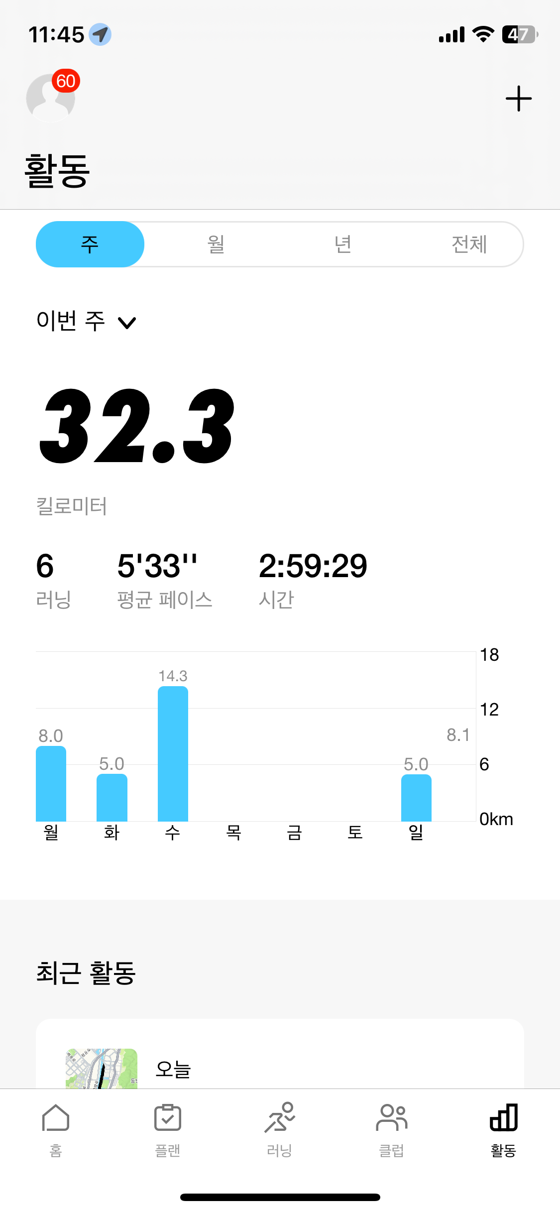 이번주 러닝 마일리지 32k달성