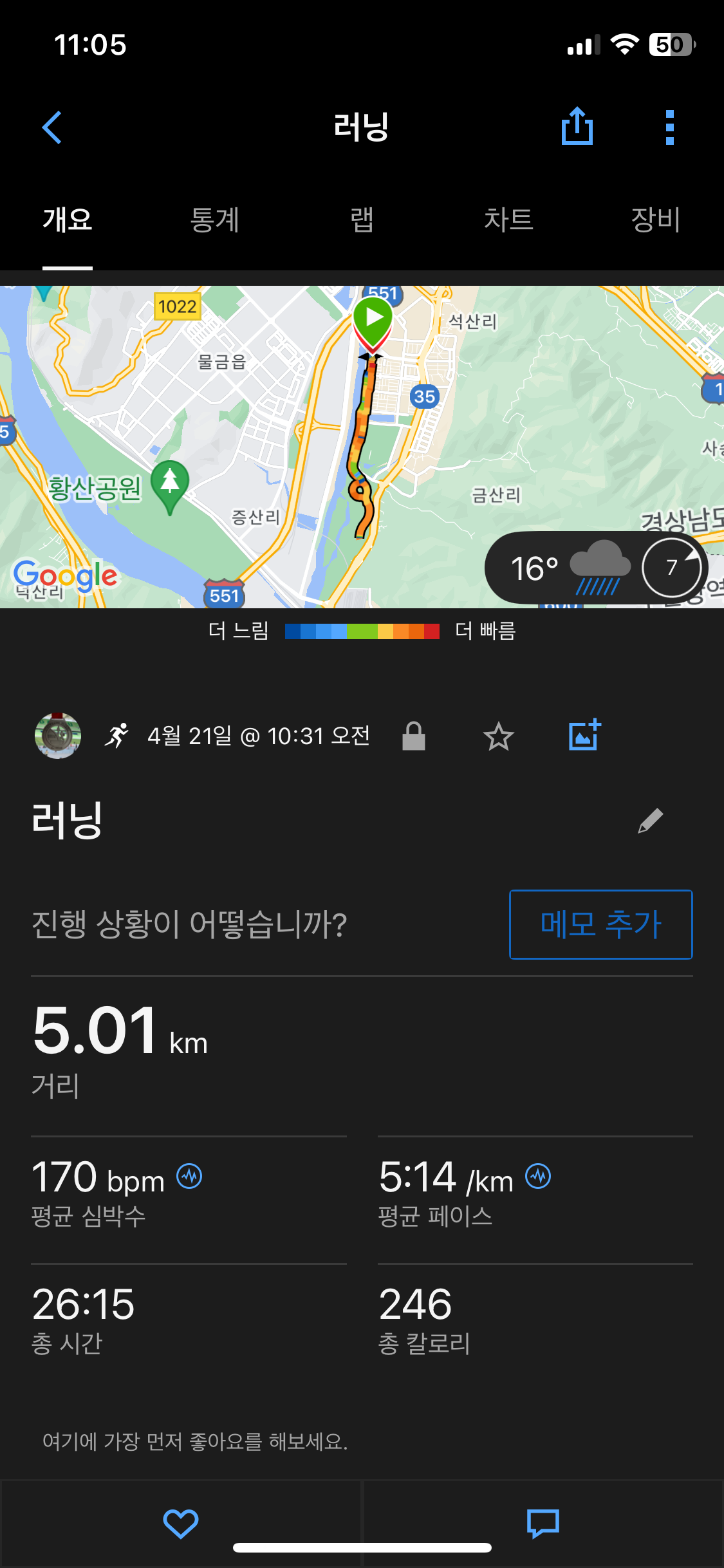 비 핑계로 조깅하러 갈지 쉴지 계속 고민하다가 비오기 직전 선선하고 달리기하기 너무 좋은 날씨라 일단 운동복부터 갈아 입고 나왔다.