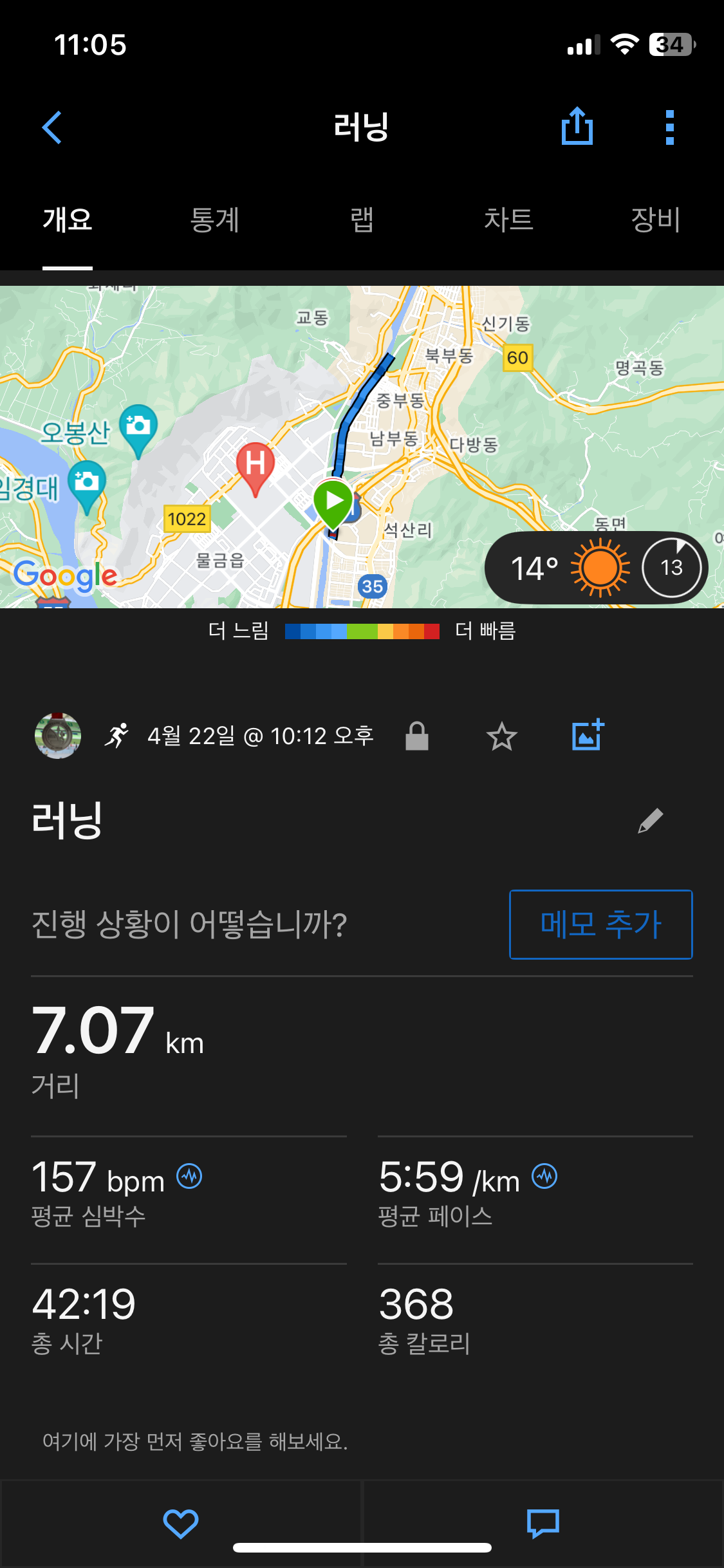 레슨만듣고 오늘도 양산천 조깅하러 왔다.