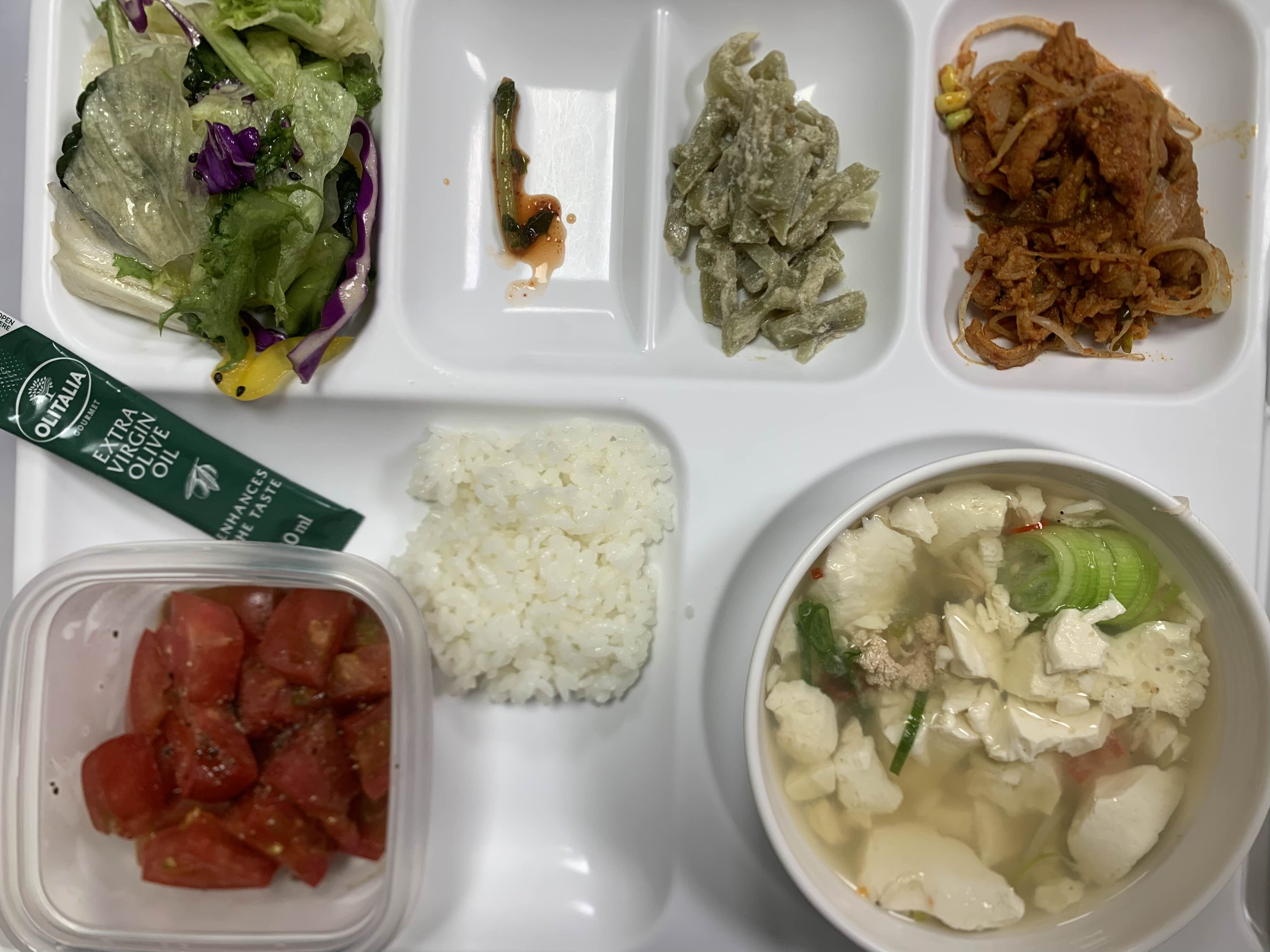 올리브오일에 절인 토마토, 밥조금, 순두부탕, 우동면 샐러드인데 우동은 한가닥, 콩나물제육볶음, 궁채무침