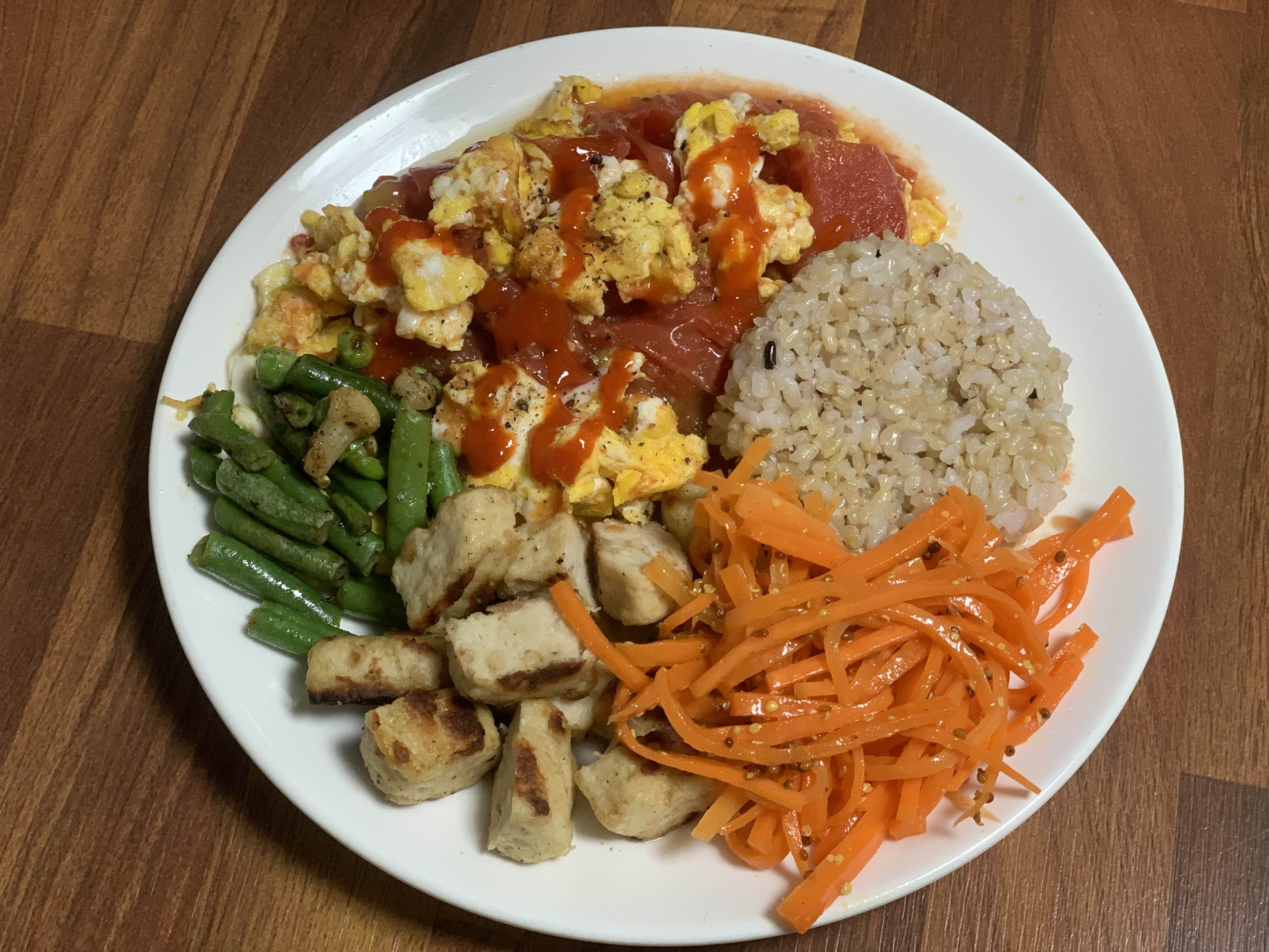 현미밥 50g, 계란 두개 넣은 토마토달걀볶음, 그린빈, 닭가슴살50g, 당근라페샐러드