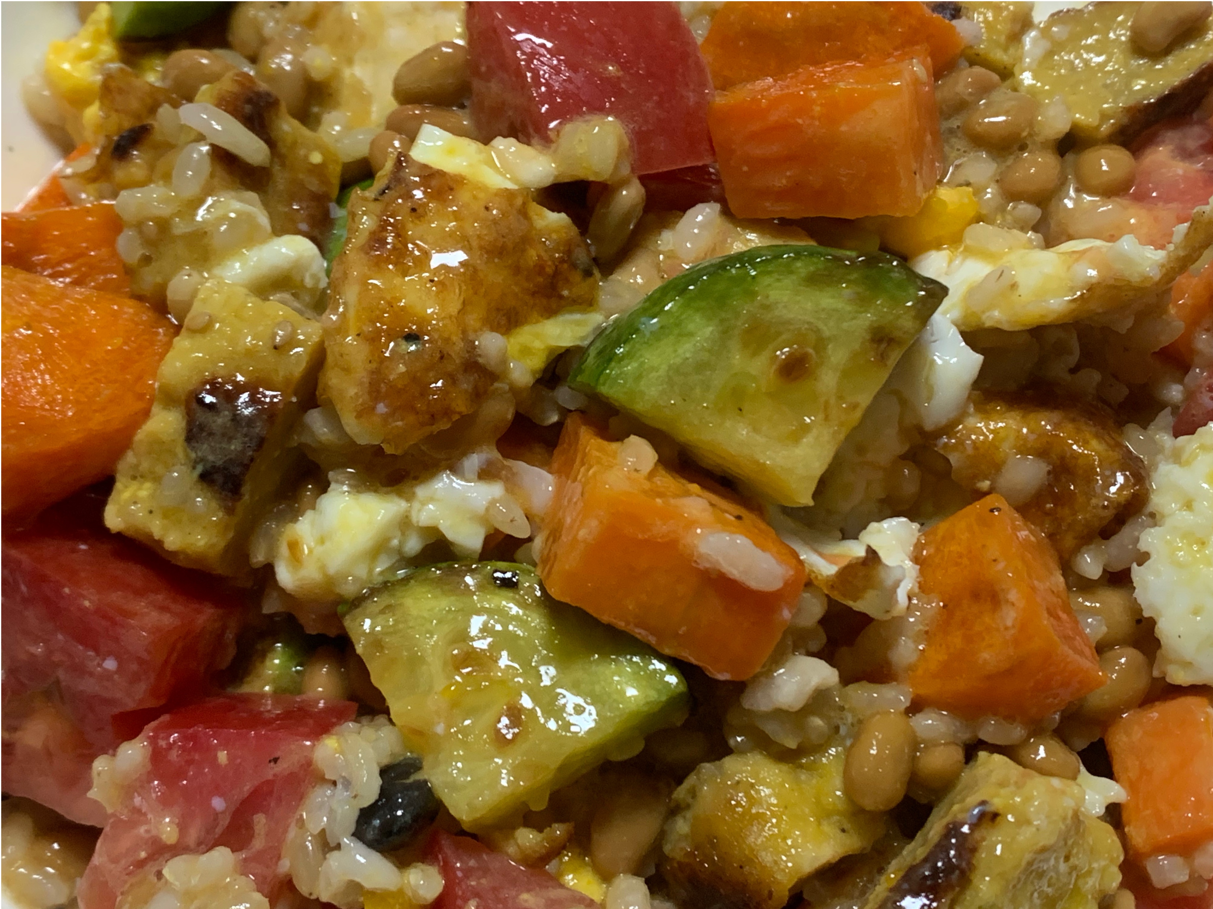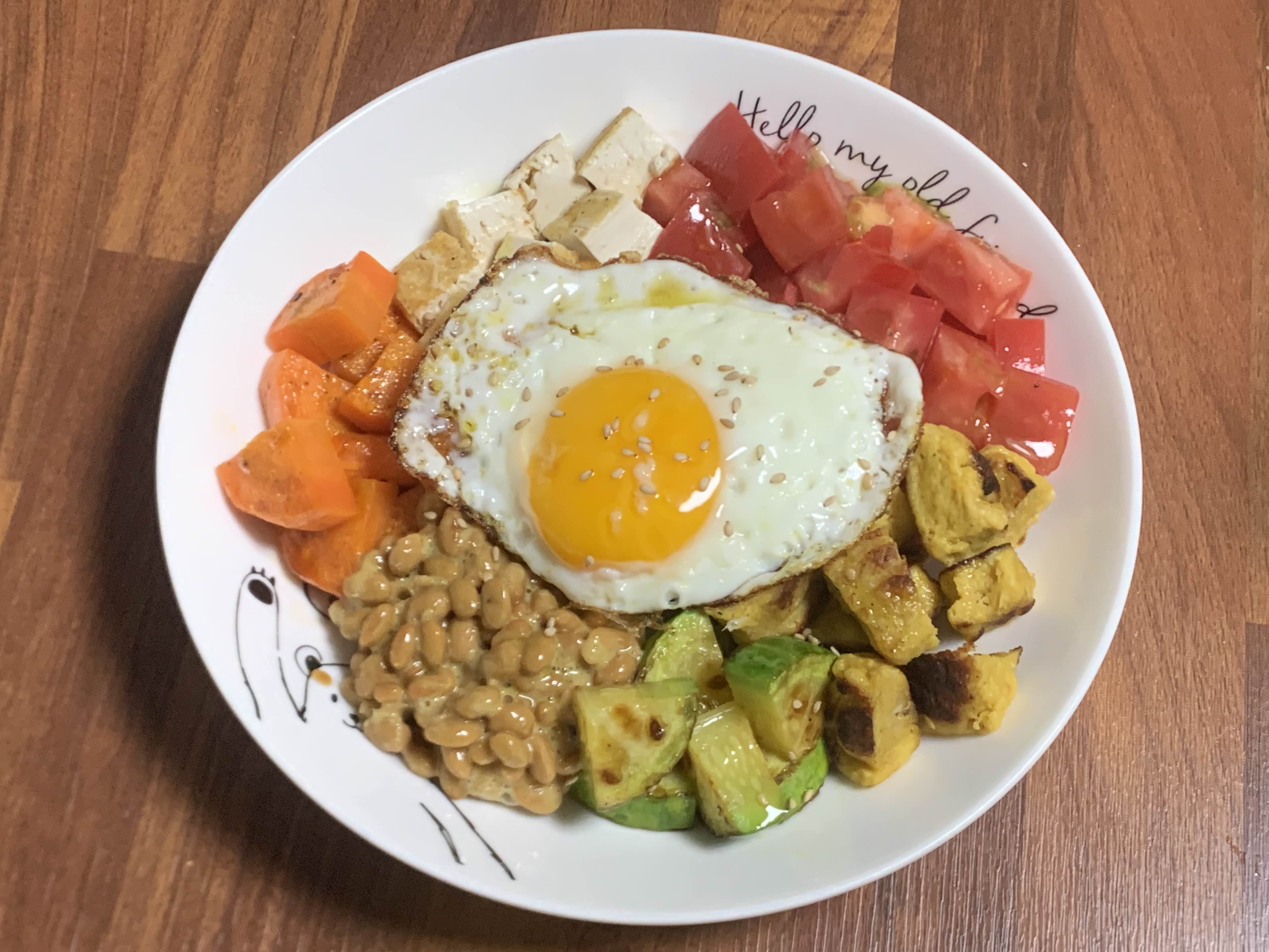 현미밥 50g, 냉장고 갖은 야채, 단백질은 랠리큐브닭가슴살 단호박맛 50g 계란 두부 낫또