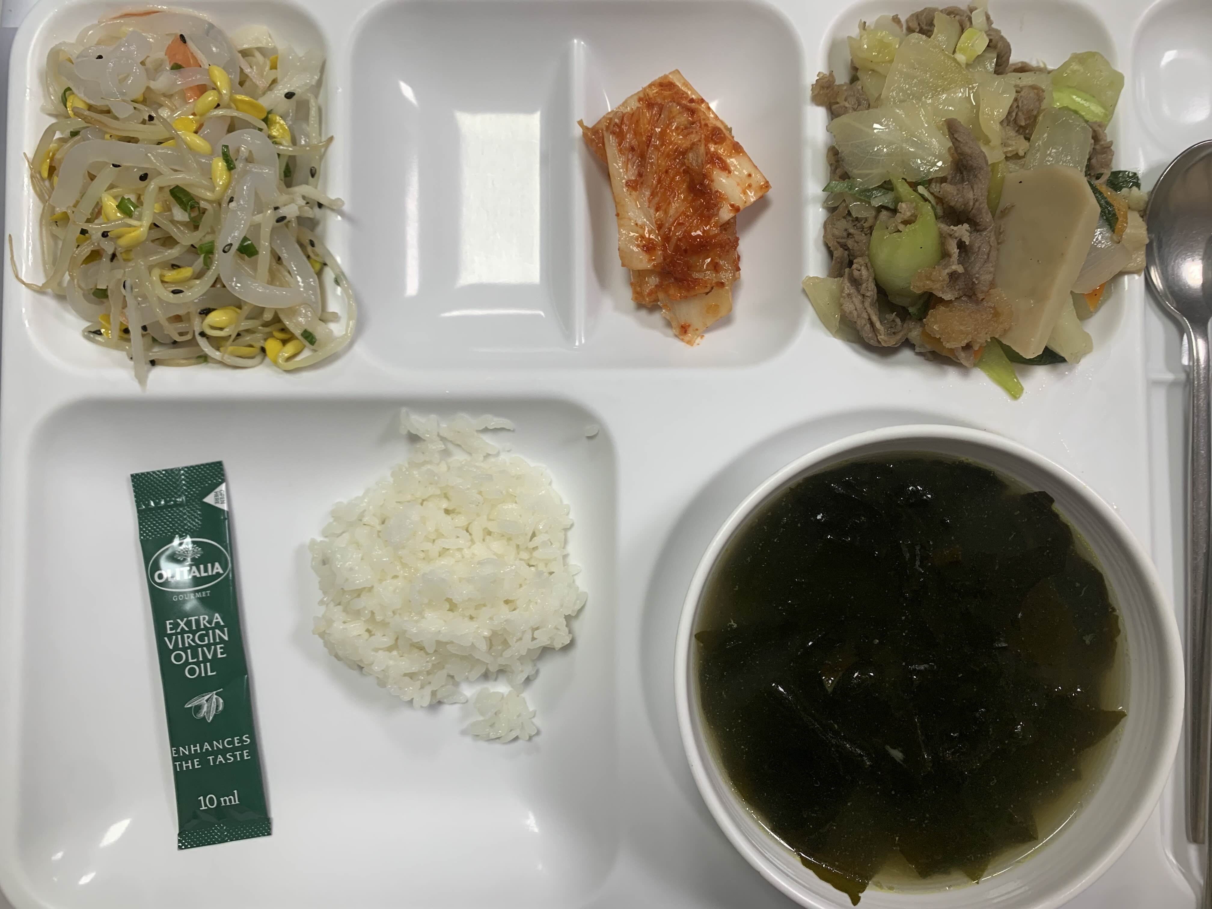 곤약면콩나물무침, 소고기청경채볶음, 조갯살미역국, +올리브오일