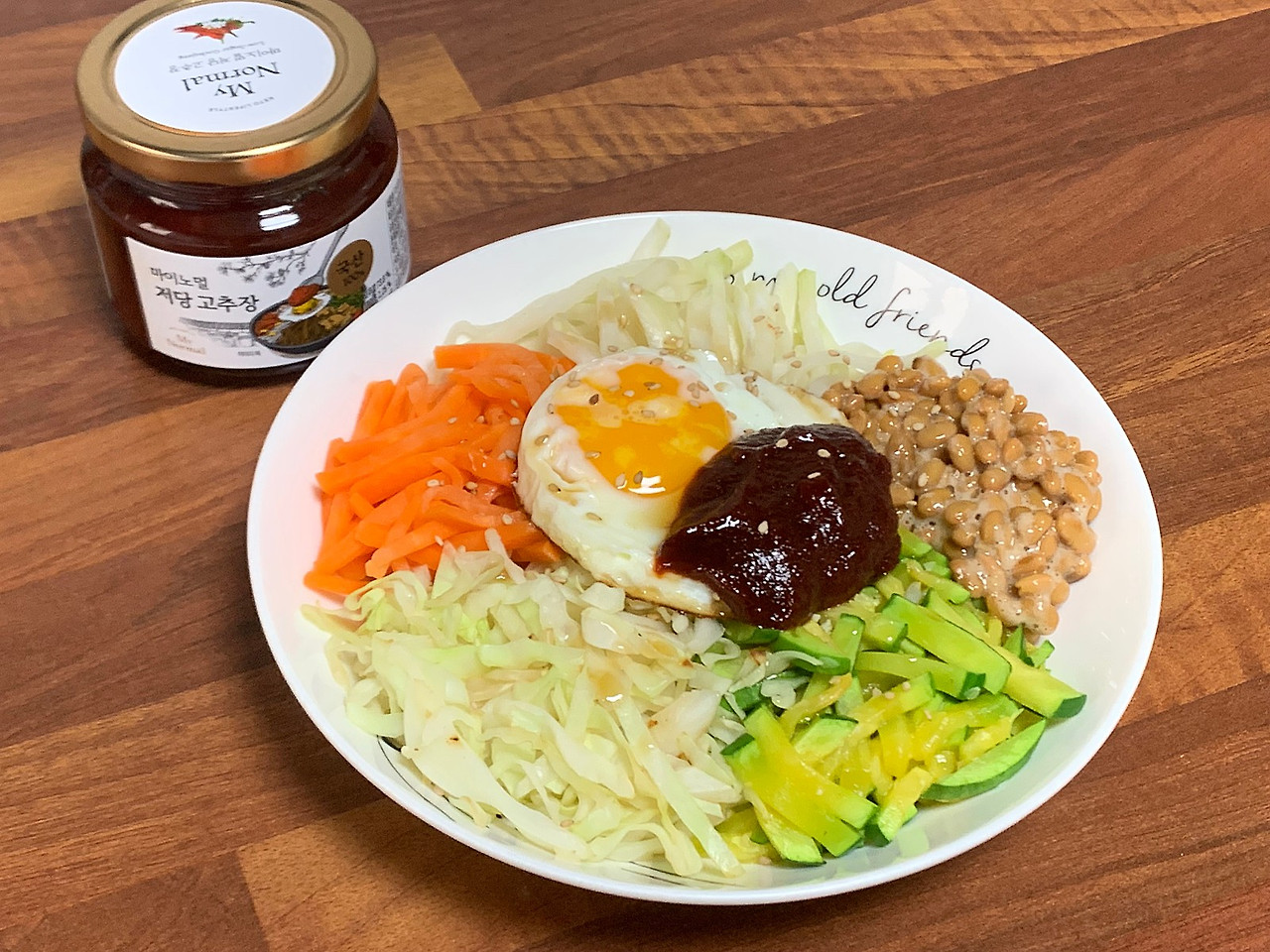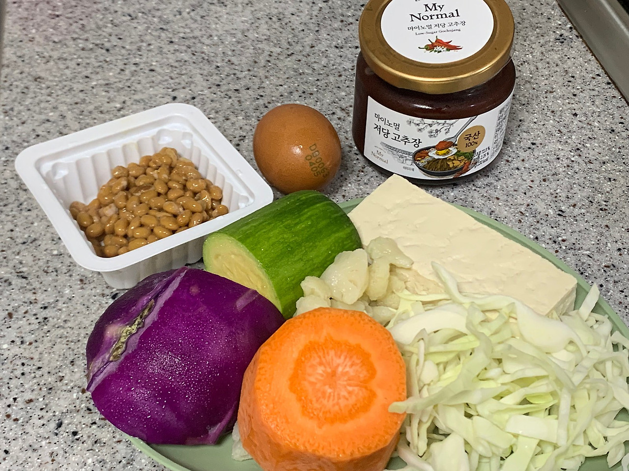 당근, 애호박, 양배추, 계란, 콜라비, 낫또, 들기름, 고추장, 깨소금