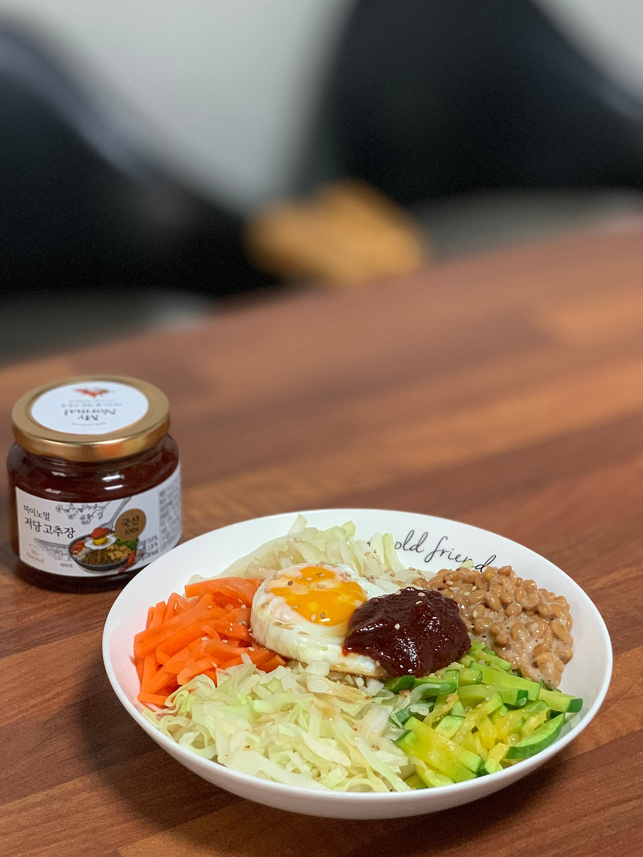 두부, 낫또, 계란후라이로 단백질은 듬뿍, 야채로 식이섬유 가득, 들기름으로 건강한 지방채우고, 마이노멀 저당고추장으로 당 걱정 없는. 완벽한 맛있는 건강한끼입니다.