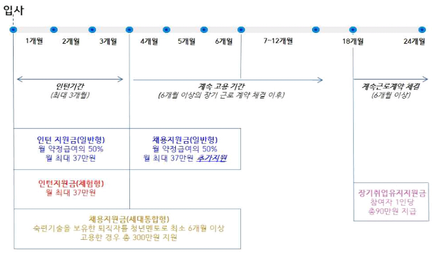 인턴 종료 후 6개월 이상 계속근로계약 체결 시 참여자 1인당 최대3개월간 월약정급여의 50%(월 최대 37만원)을 추가지원합니다.