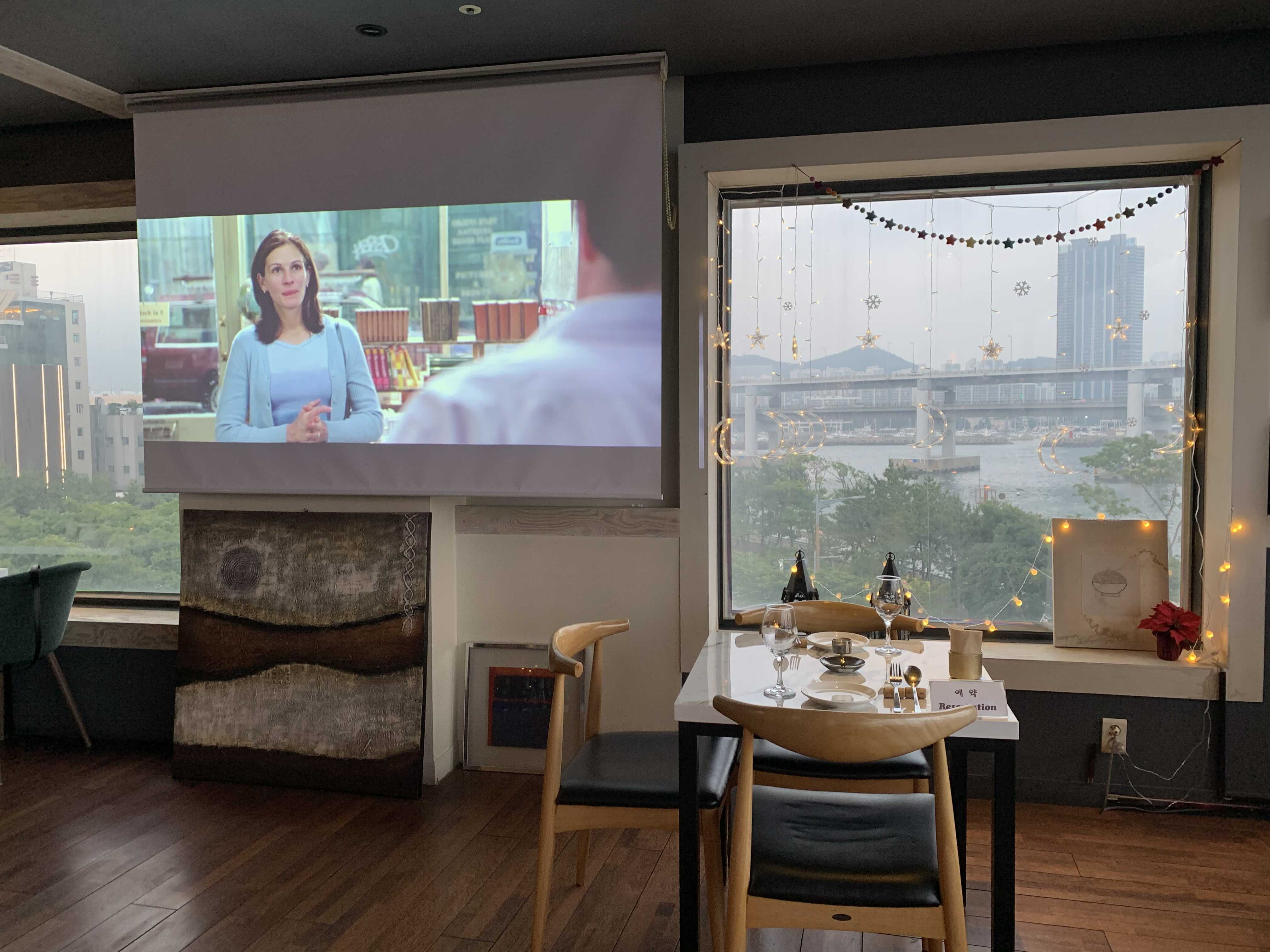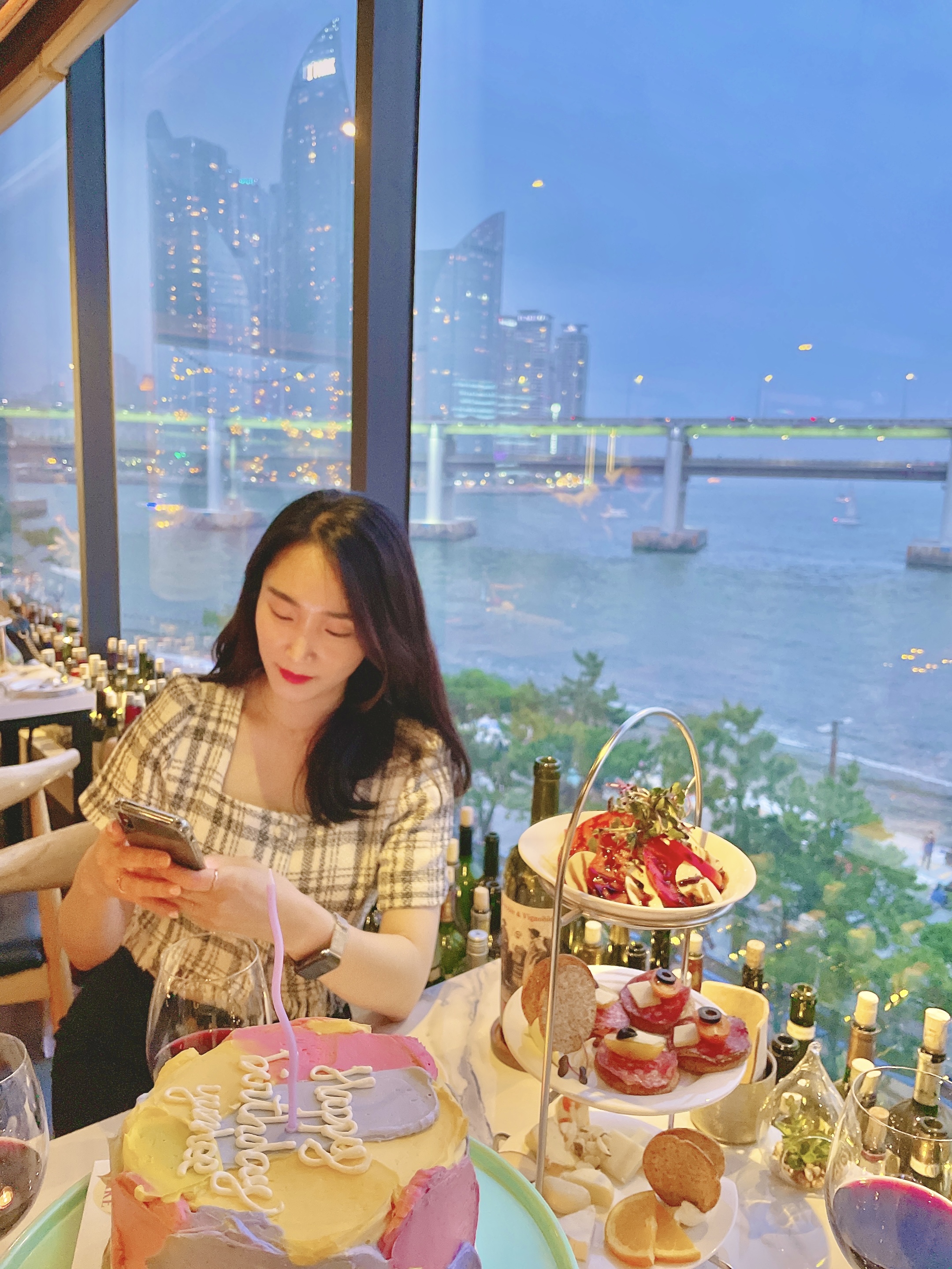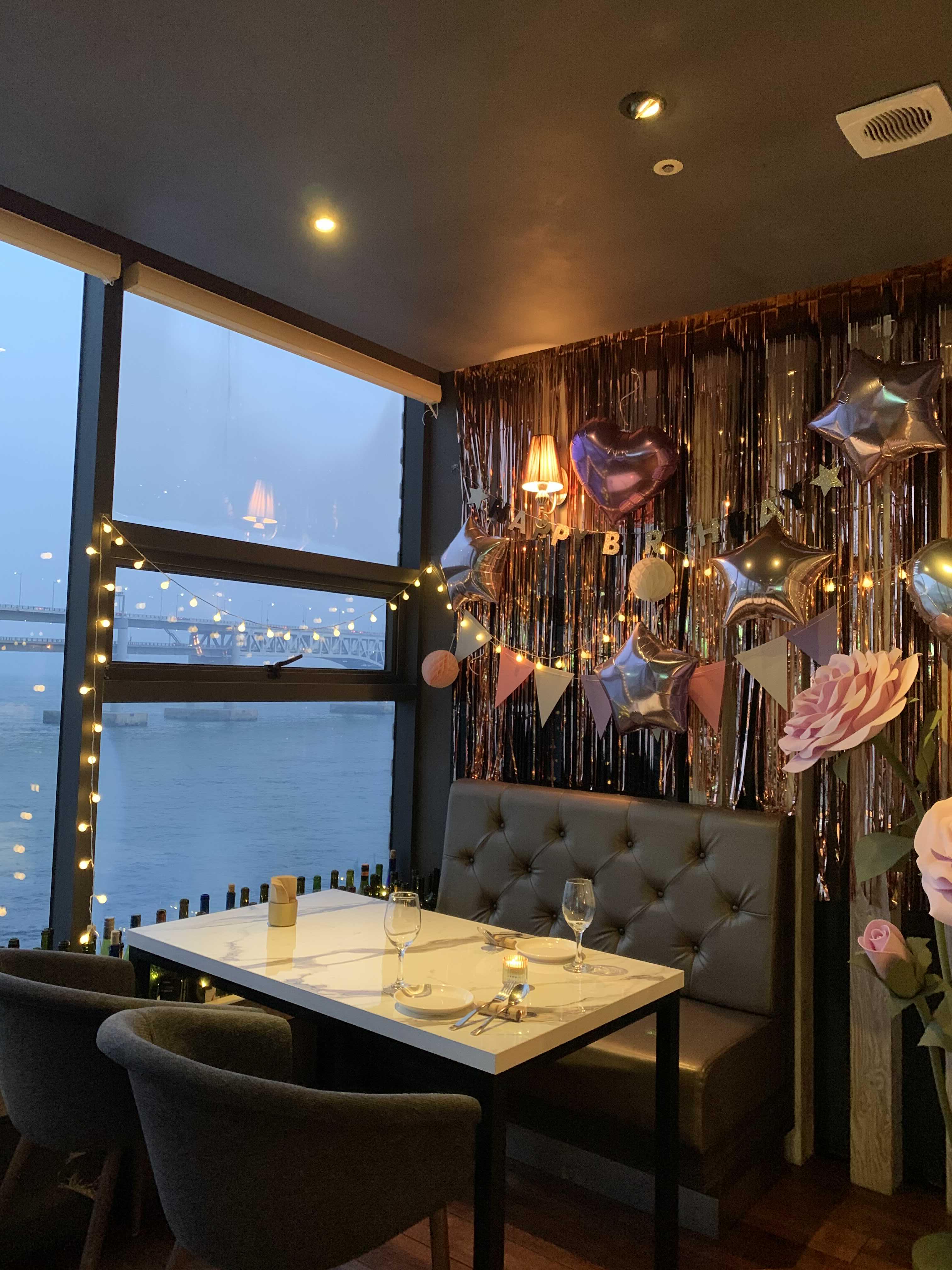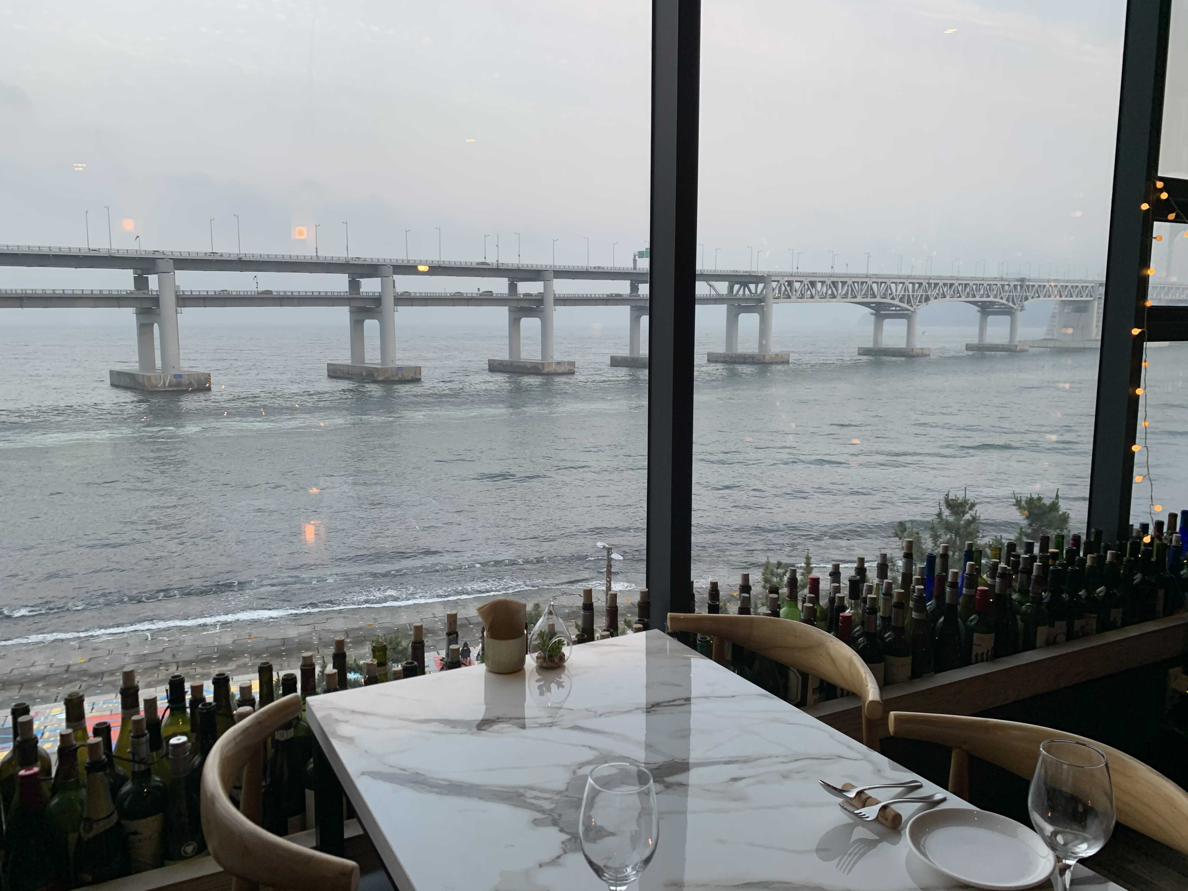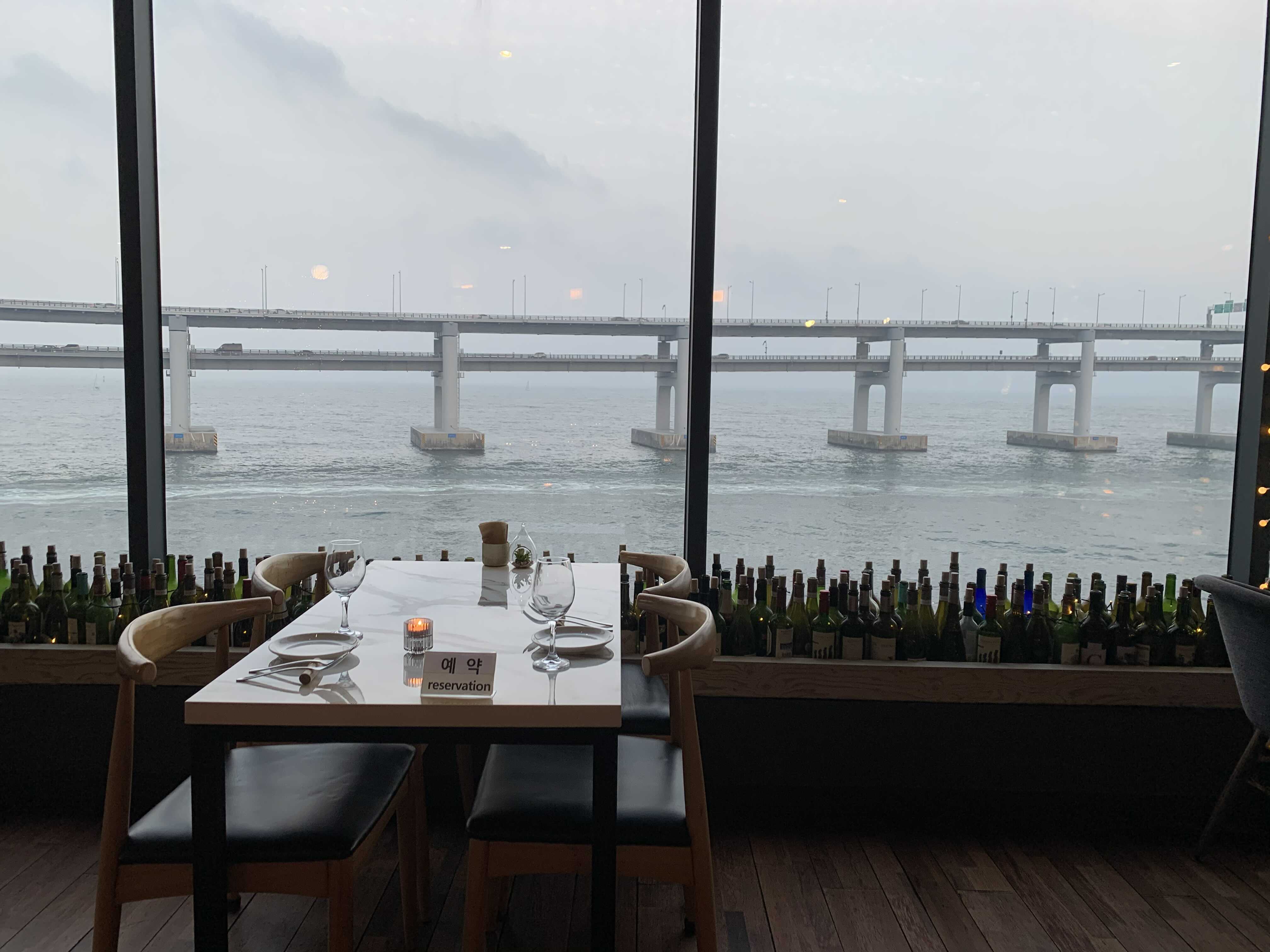 토요일이라 그런지 방문일 3주 전에 예약했음에도 불구하고 광안리 뷰가 제일 멋지게 보인다는 명당자리는 이미 예약되어서 아쉬운 대로 바로 옆의 창가석에 앉게 되었습니다. 하지만 여기서 보고 저기서 봐도 뷰가 너무 멋져서 전혀 아쉽지 않았습니다.