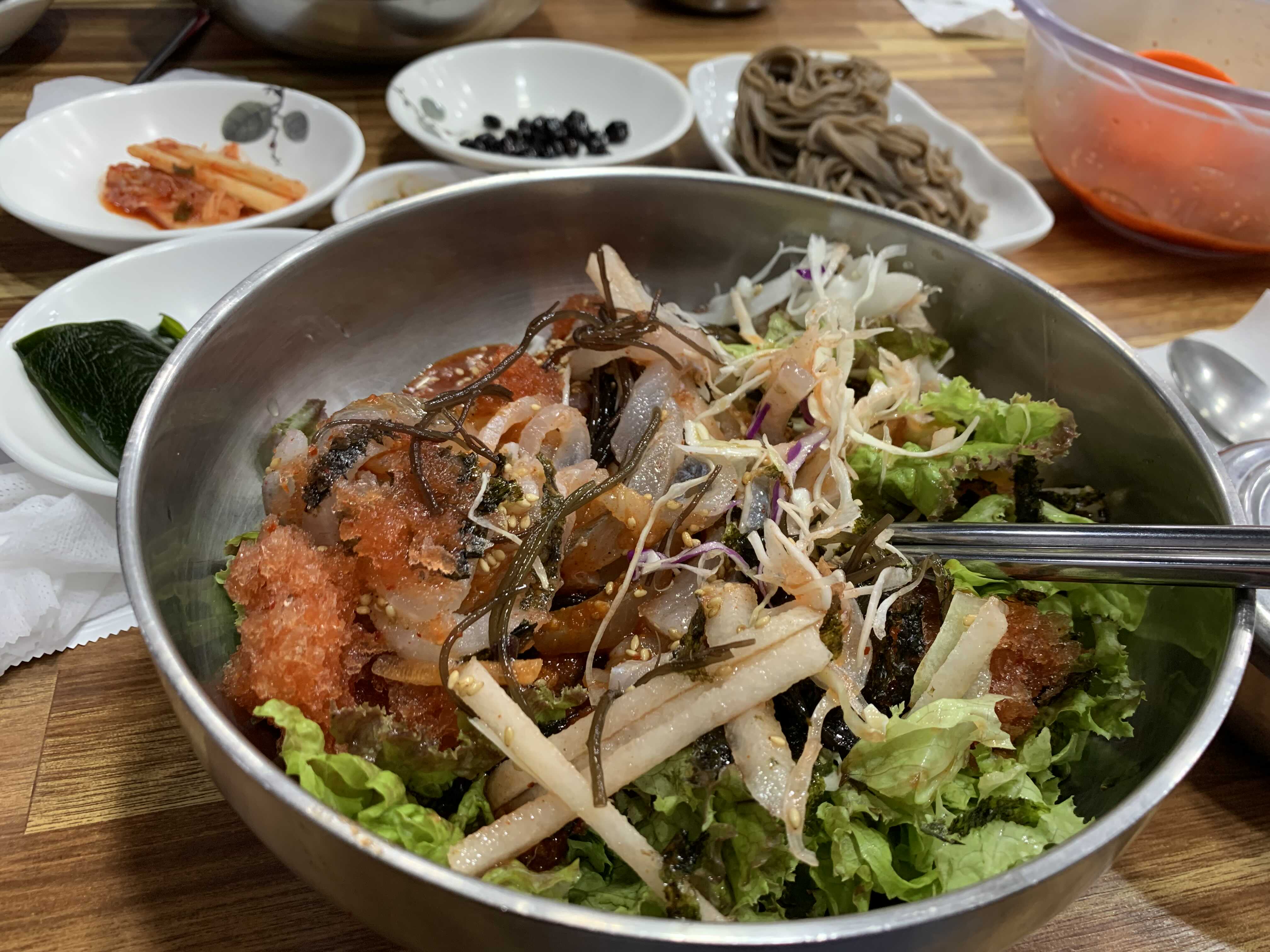신선한 야채에 새콤 달콤 매콤 육수에 회 양은 또 어찌나 많은지.. 회 별로 좋아하지 않는 친구도 연신 코 박고 퍼먹었습니다.