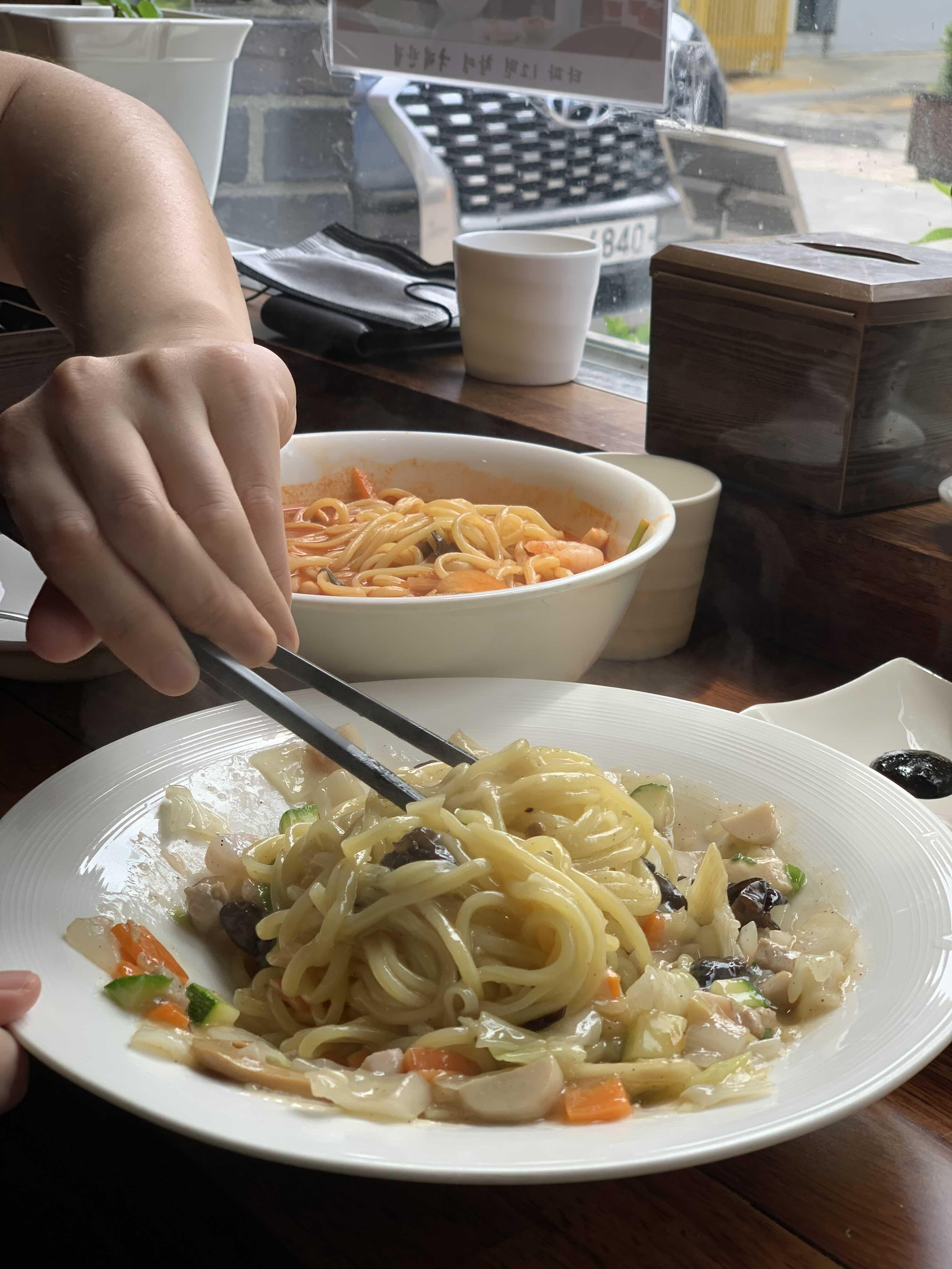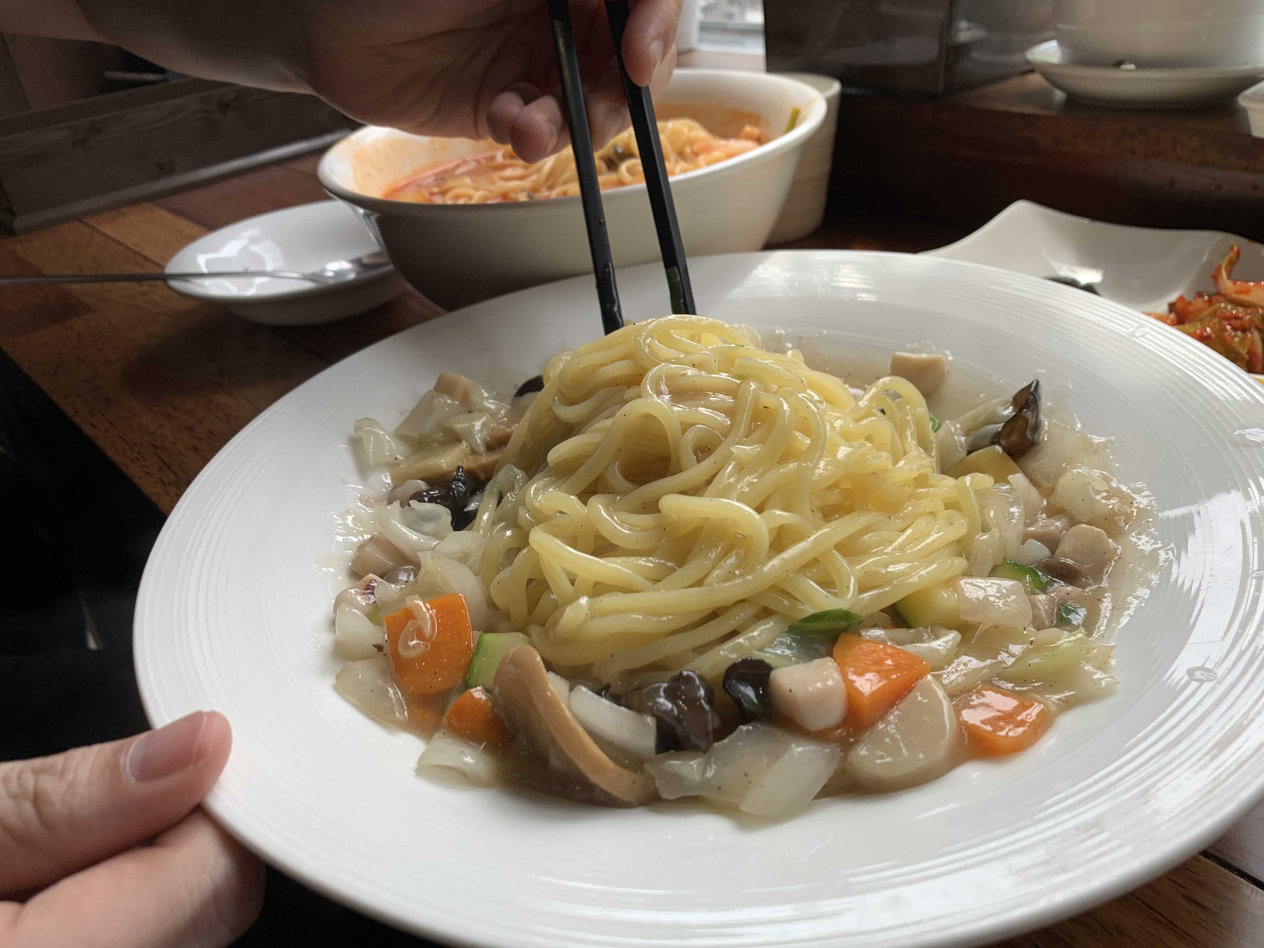 꾸덕한 소스에 각종 야채가 함께 있습니다. 물짜장이라고 해서 짜장맛이 나는 것은 아니었고, 유산슬 같은 전분 소스에 야채들을 볶은 볶음면 느낌입니다. 처음엔 심심한 듯했지만 먹을수록 담백하니 계속 당기는 맛입니다.