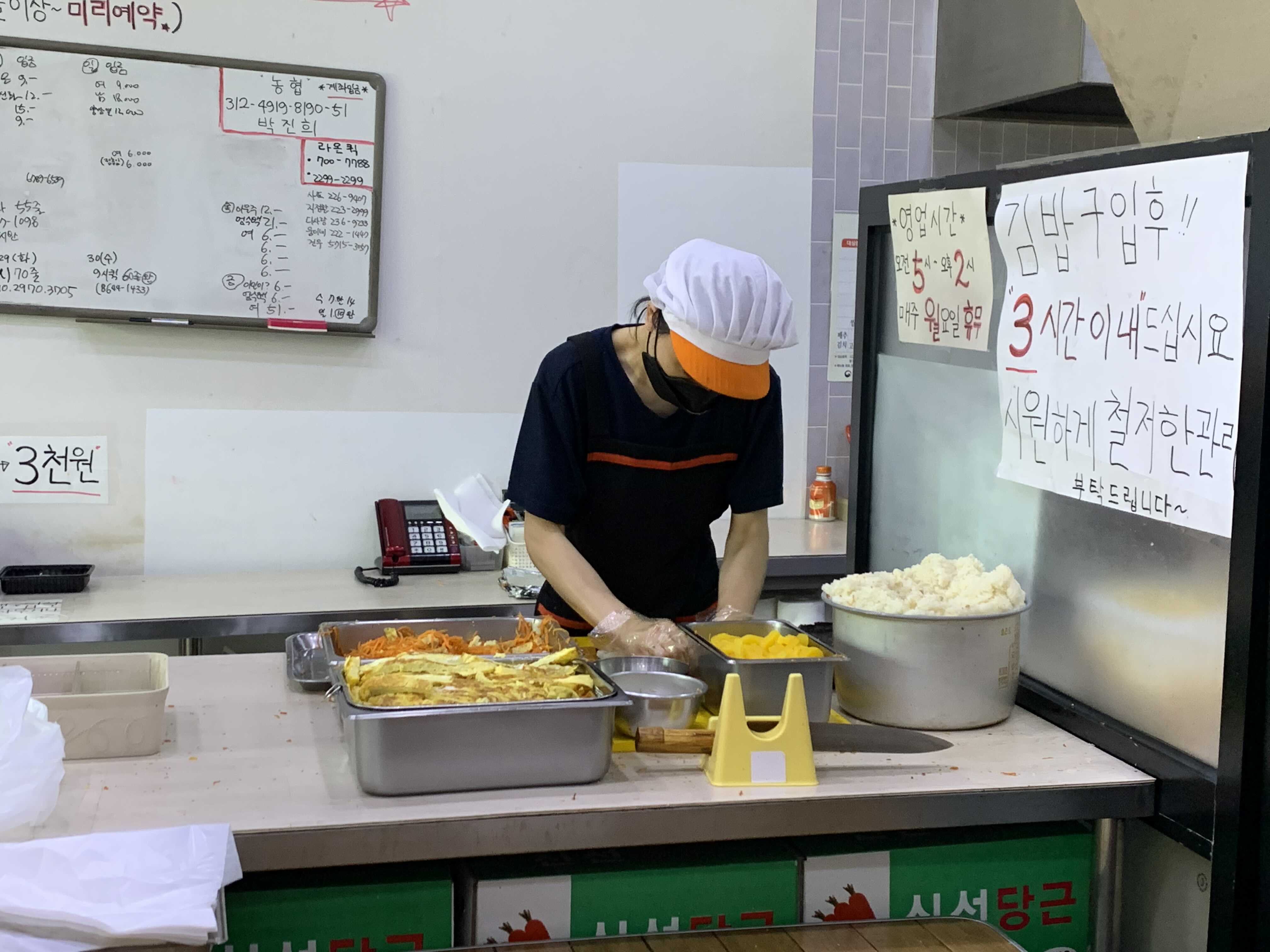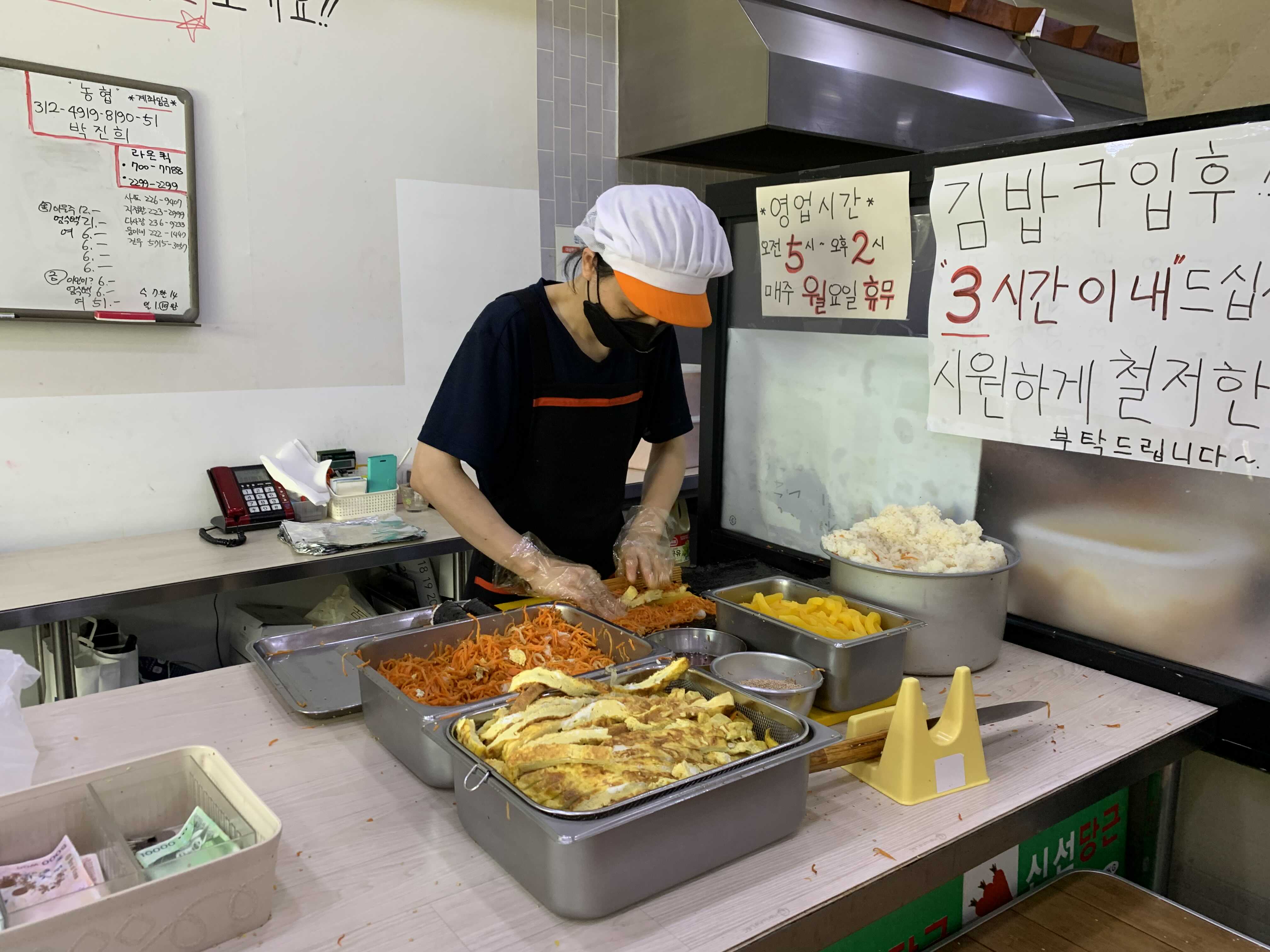 일요일 오전에 방문했는데 이미 줄이 길었습니다. 밖에서 한분, 유리벽 안쪽에서 한분 이렇게 두 분이서 김밥을 기계처럼 말고 계십니다.