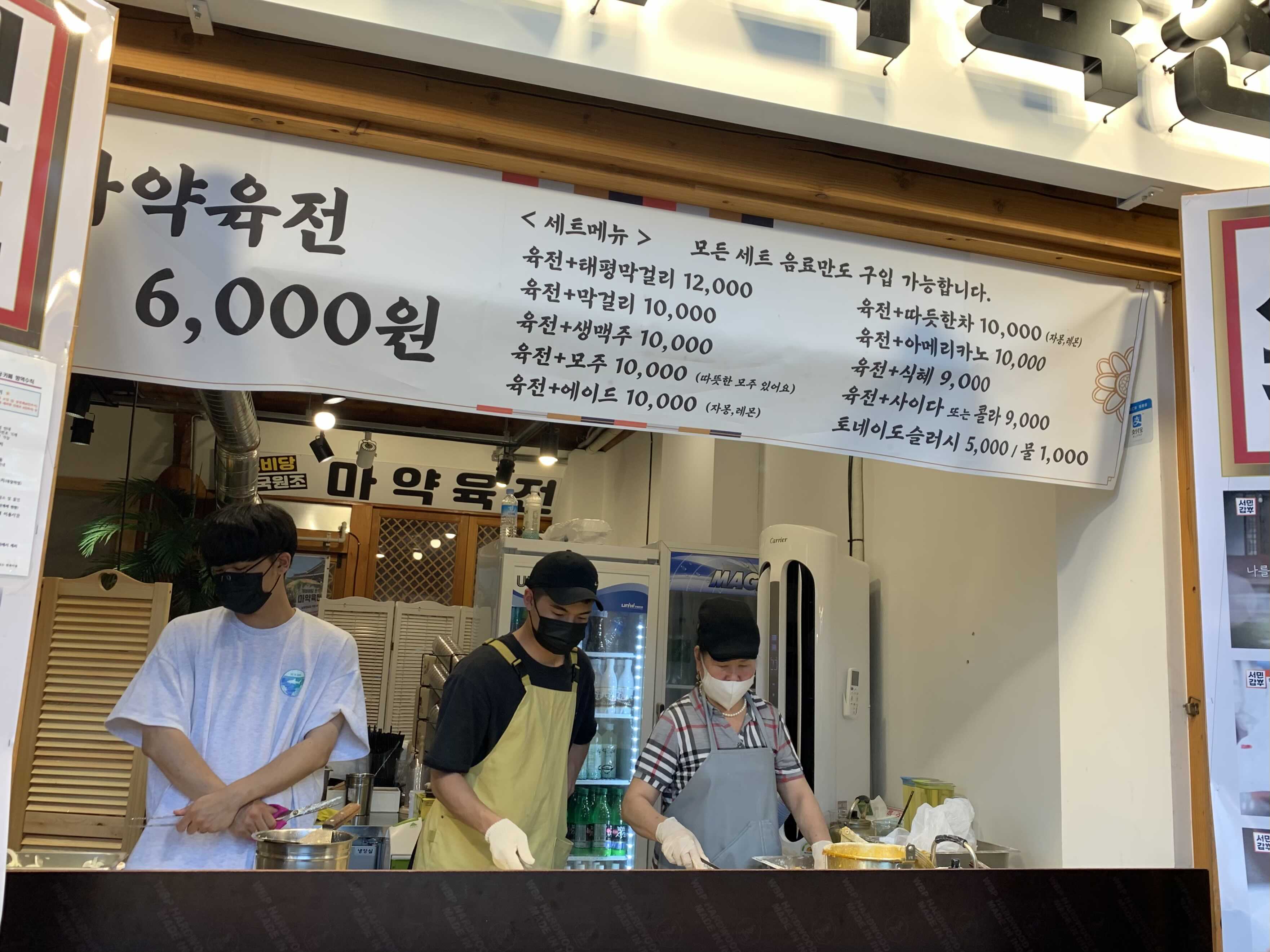 입구 쪽에서 육전을 구워내고 있고, 안쪽에 5~6개의 좌석이 있습니다. 저는 따뜻하게 바로 먹을 거라 자리를 잡았습니다.