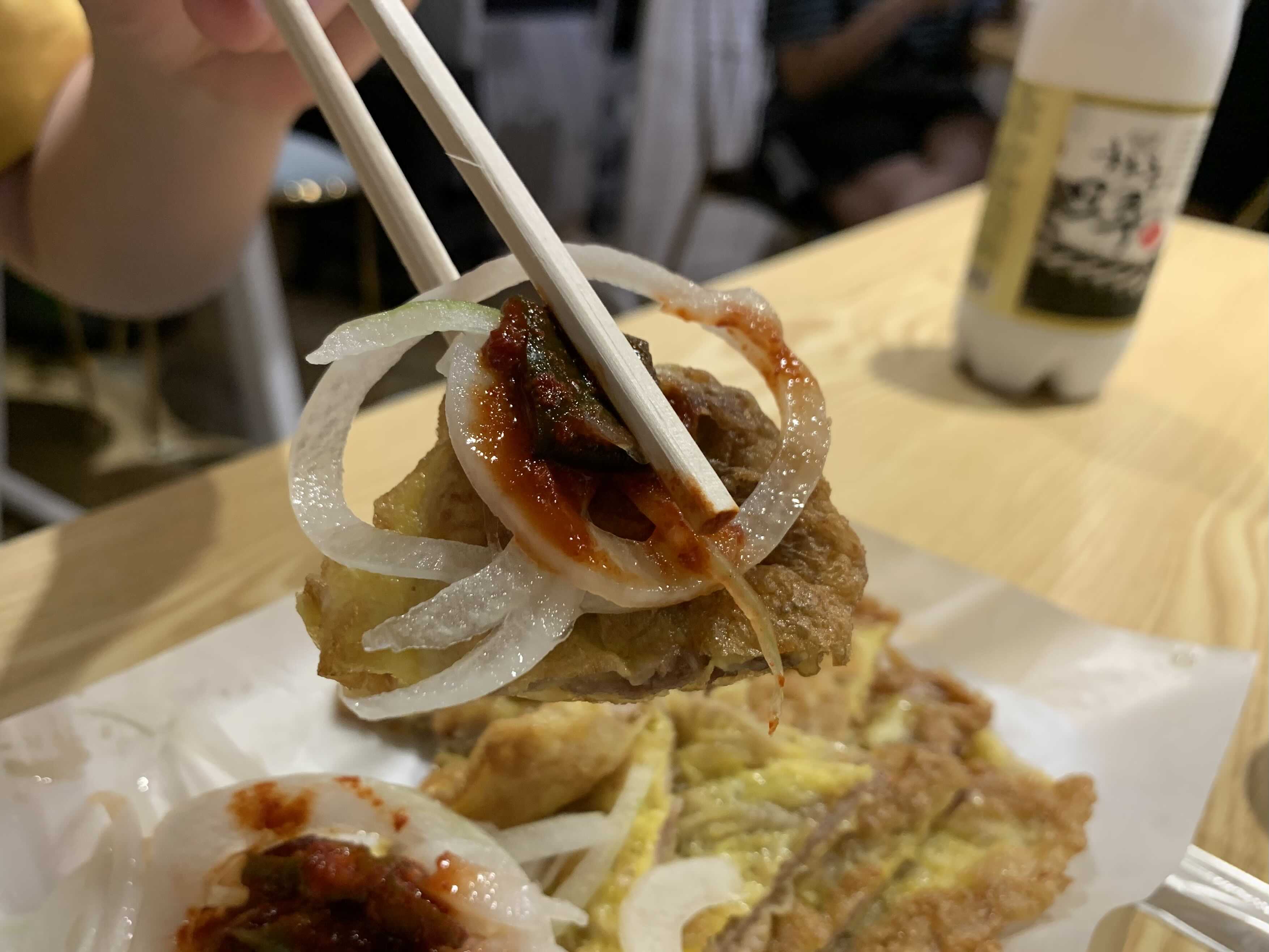 같이 나오는 특제 양념장이 이 집 육전의 일등공신입니다. 기름에 부친 전에 양파와 청양고추를 같이 올려서 먹으니 느끼함을 잡아주고 계속 먹을 수 있을 것 같습니다.