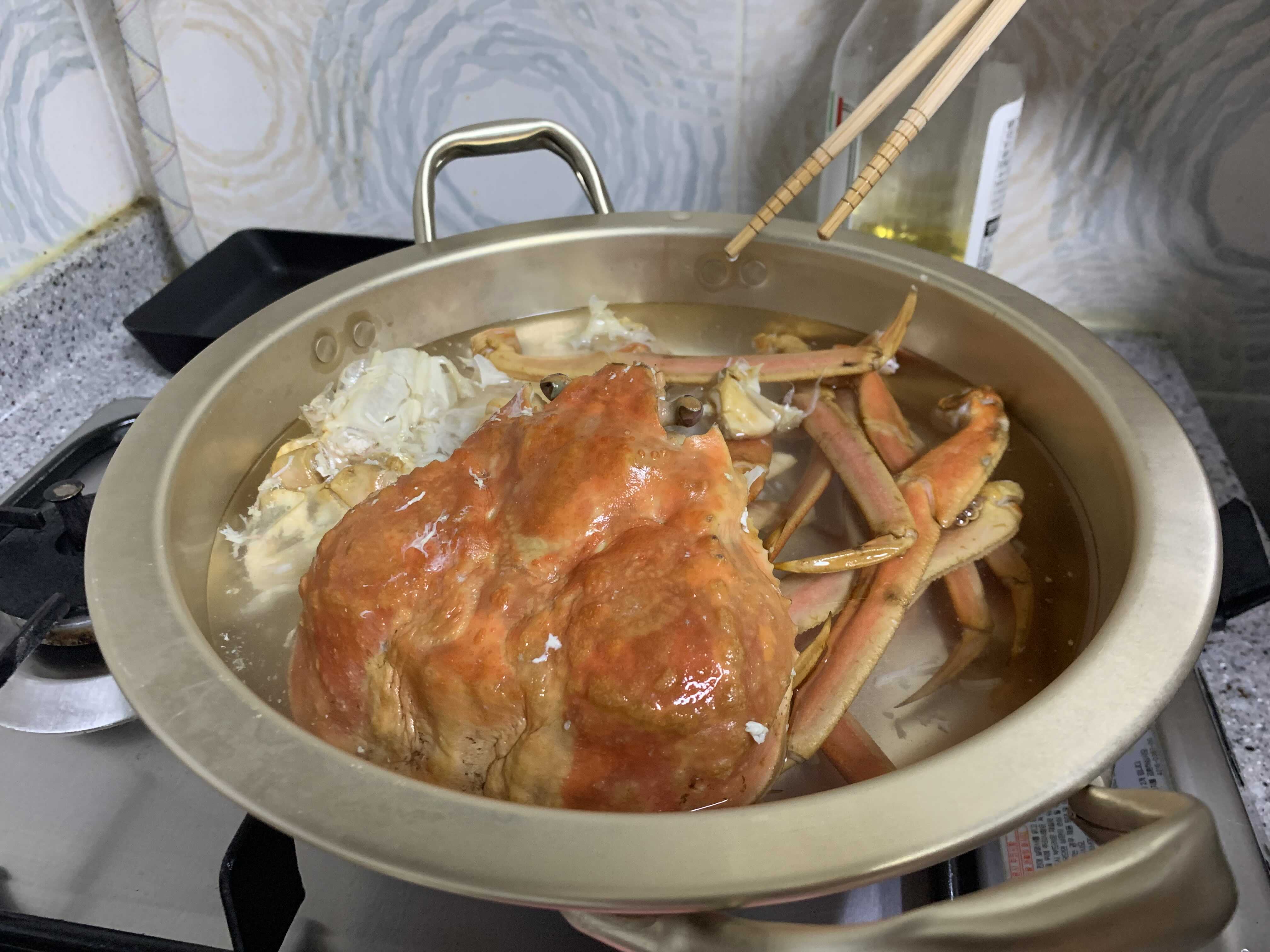 대게 다리, 등껍질, 수프를 넣고 국물을 충분히 우려 줍니다.