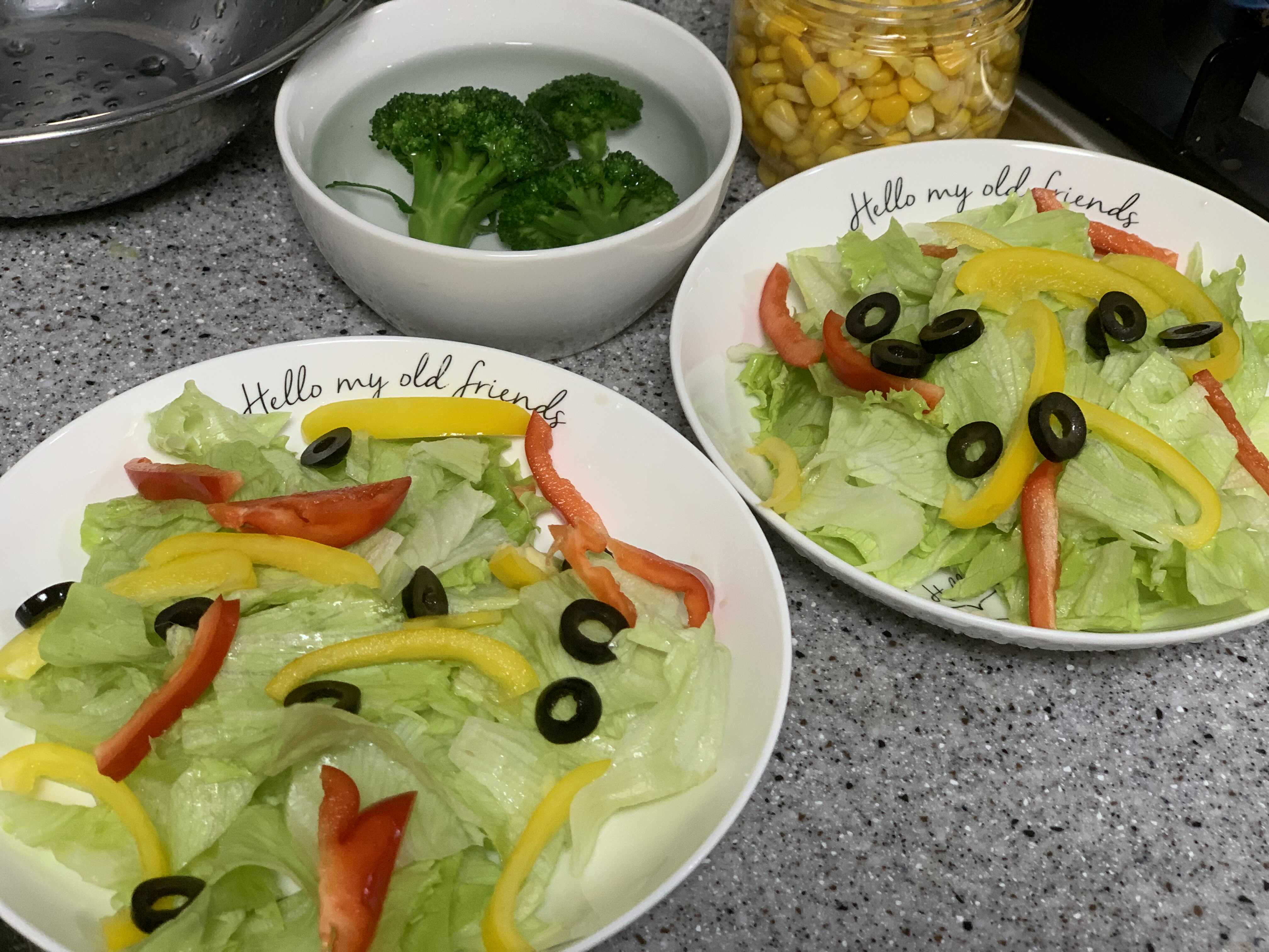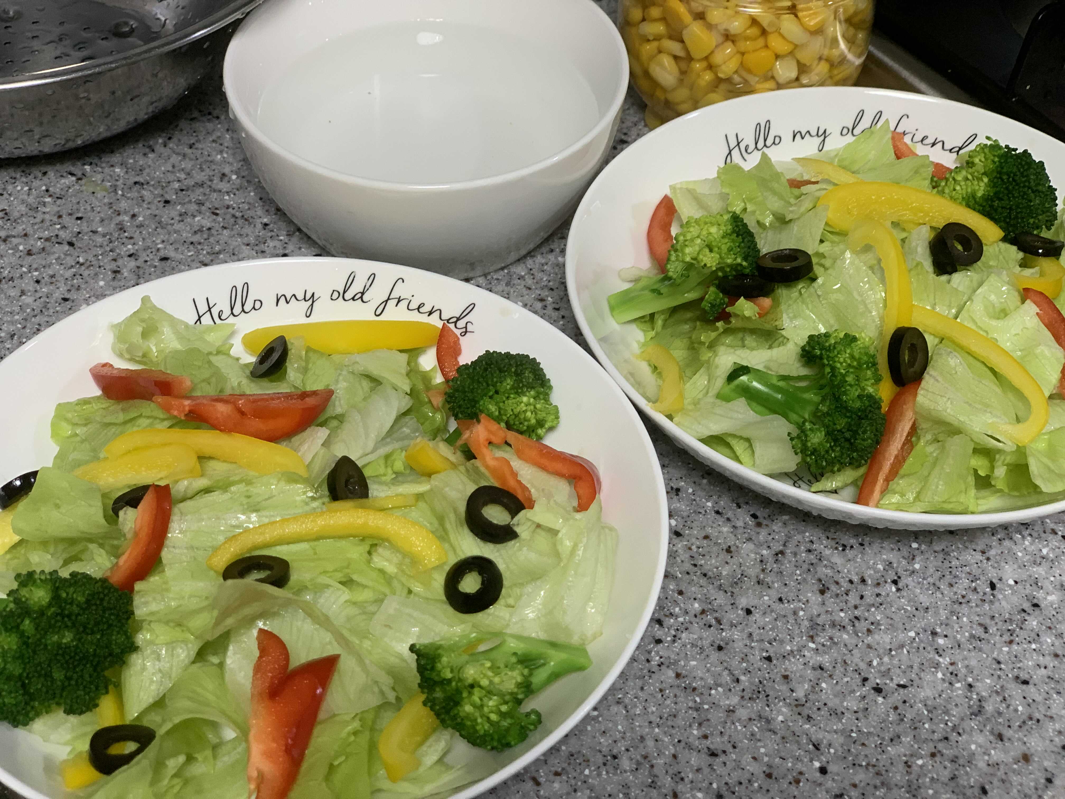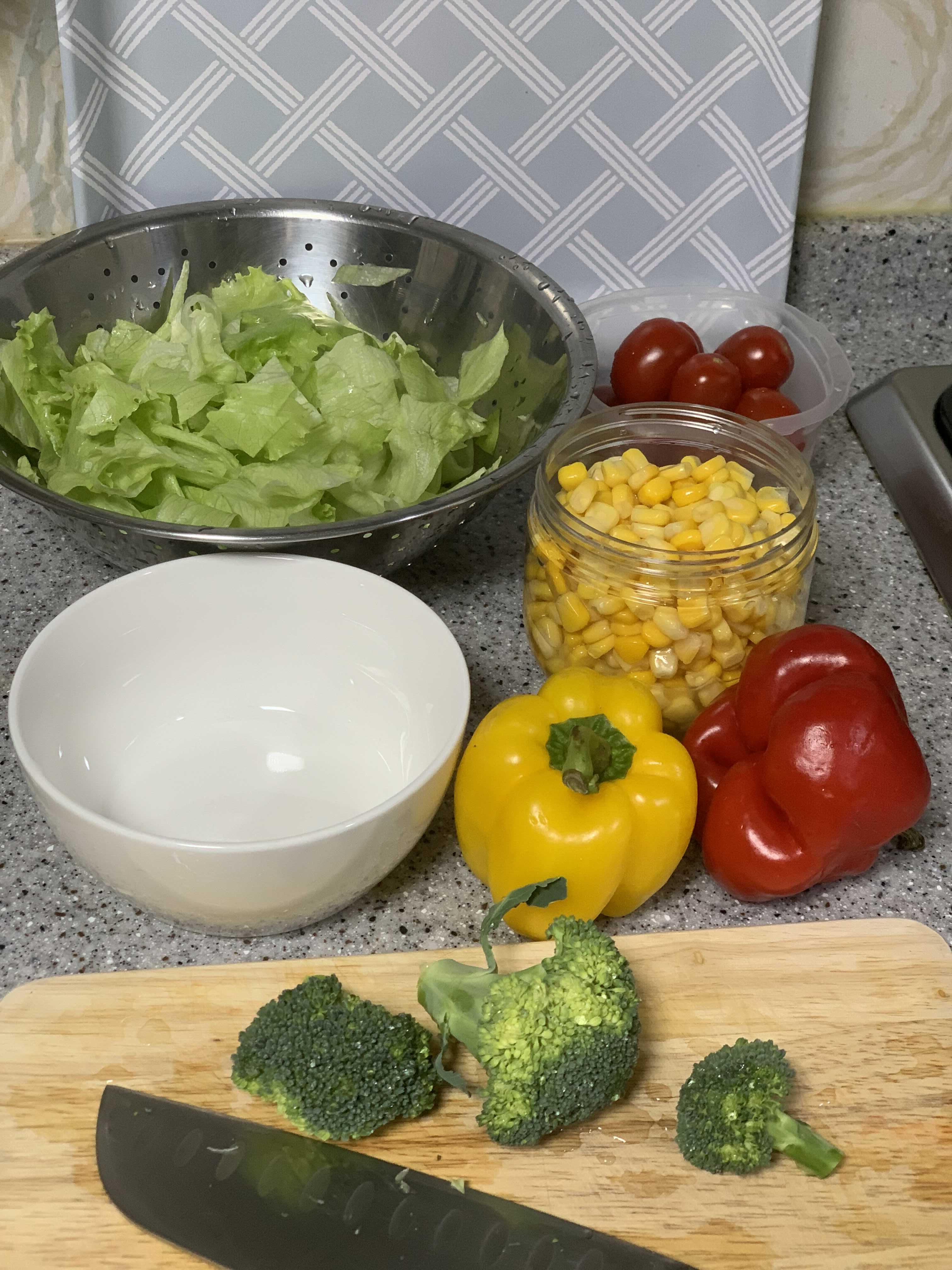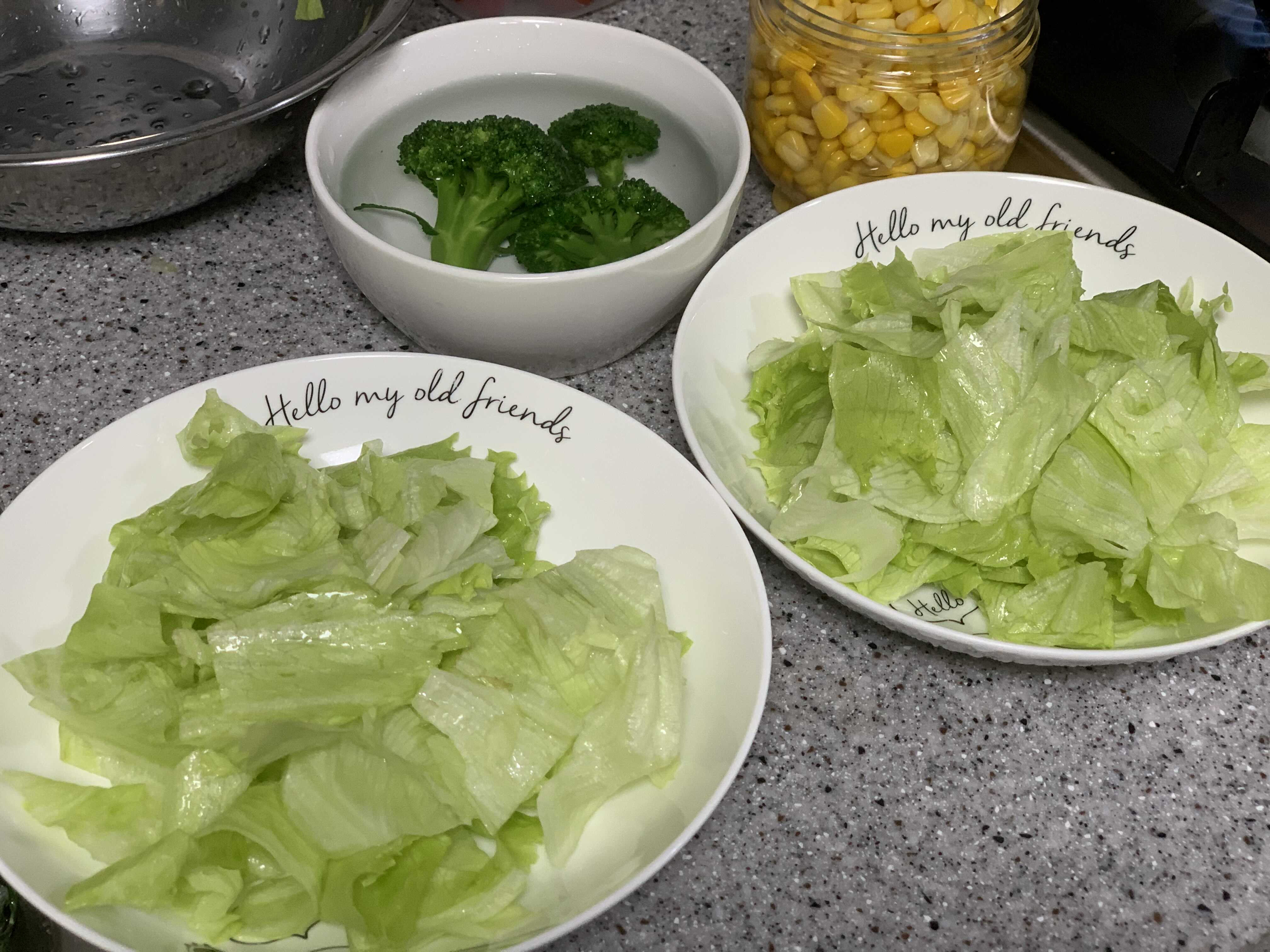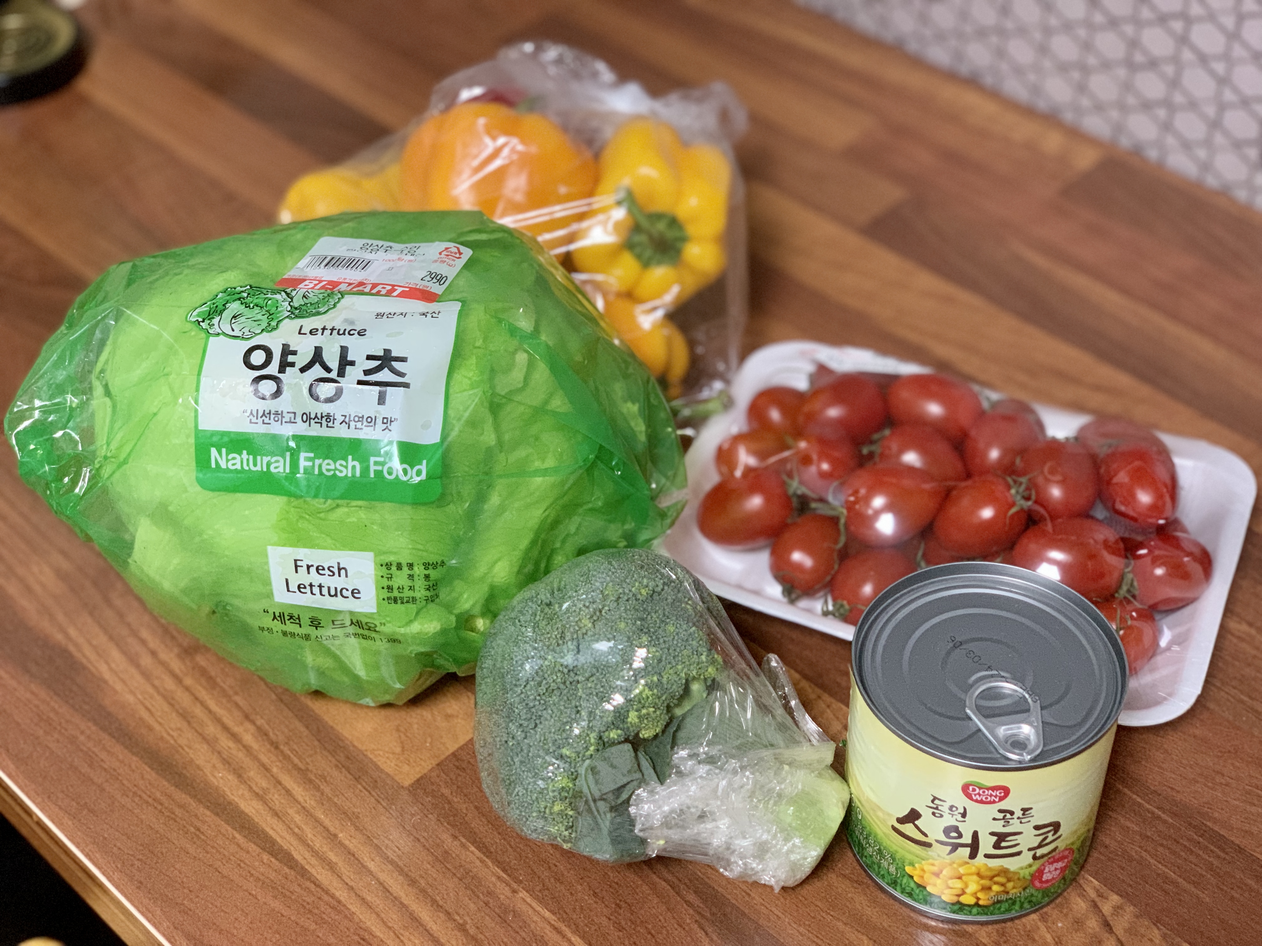 양상추가 메인이고 다른 재료들은 상황에 맞게 있어도 그만 없어도 그만입니다. 너무 탄수화물이 없으면 정신 못 차리고 라면 끓일까 봐 옥수수콘도 추가합니다.