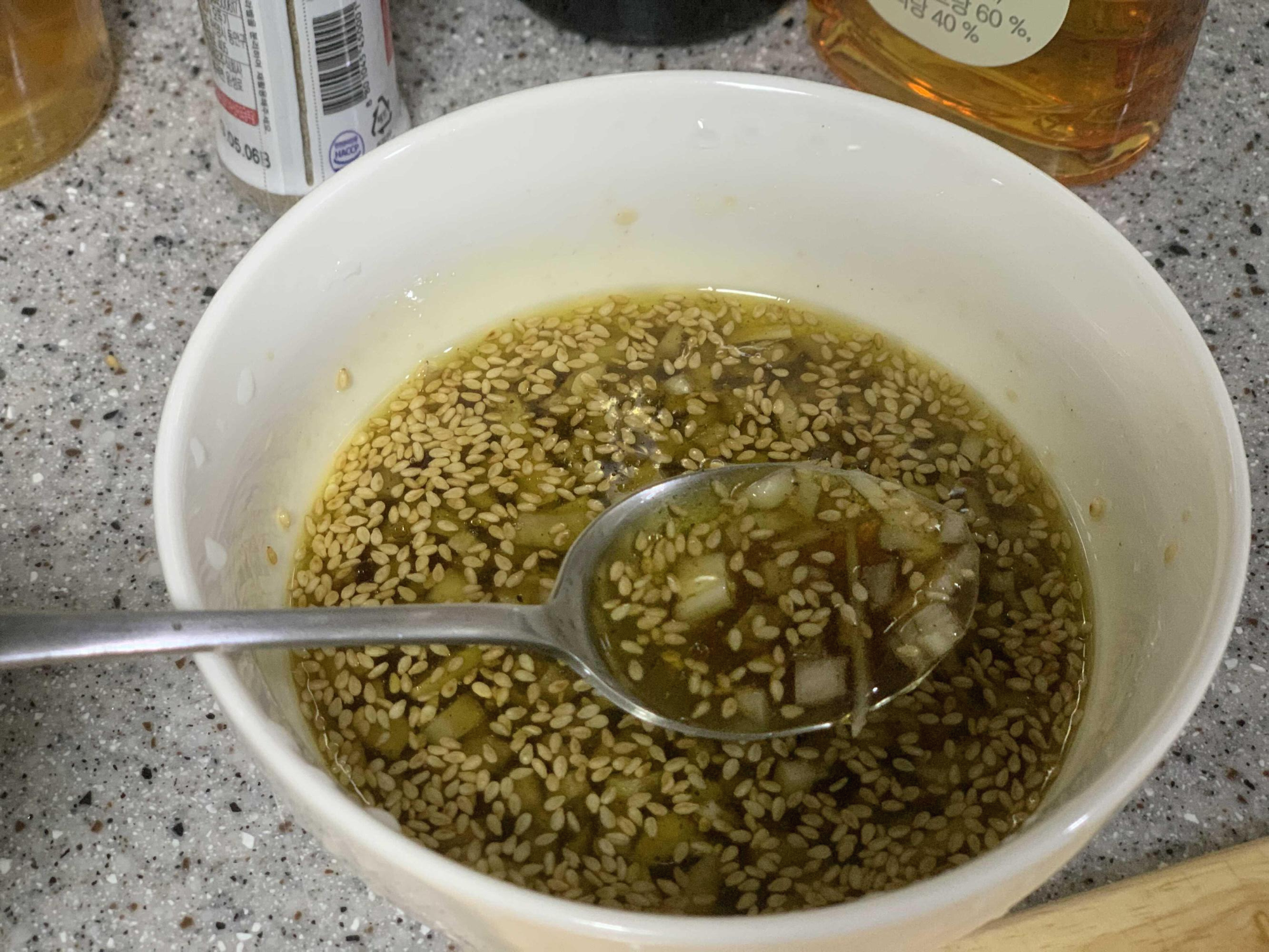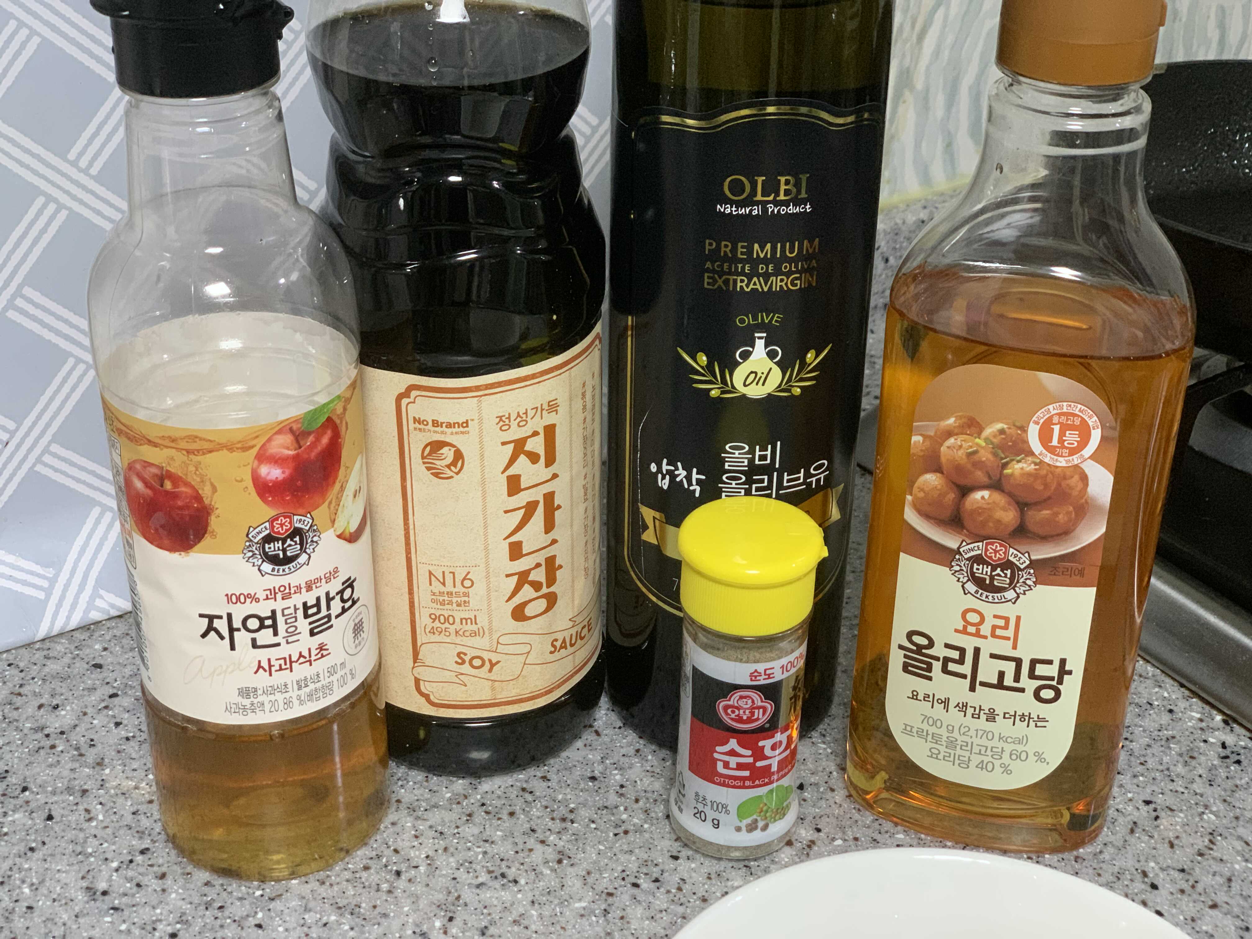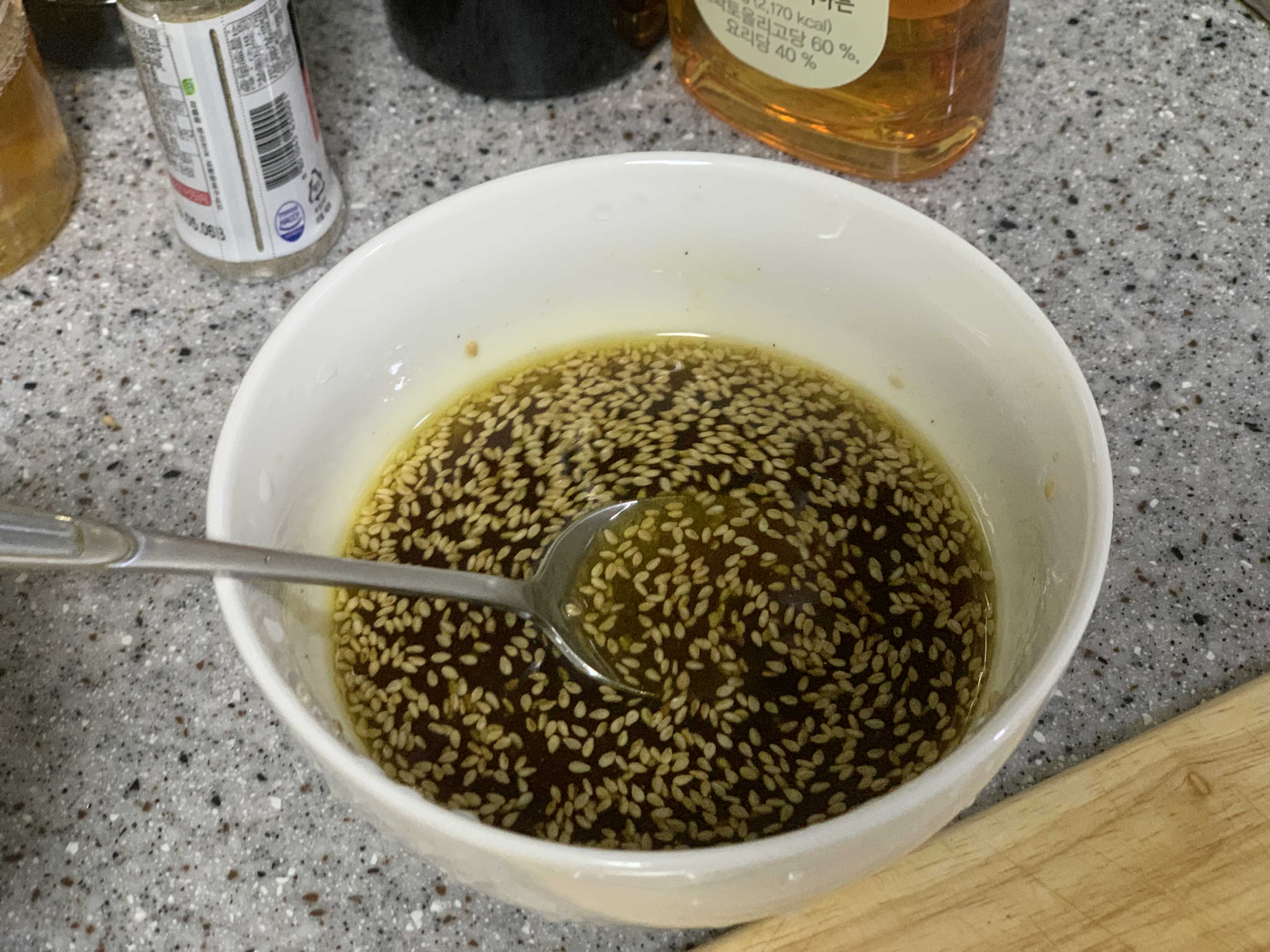1. 간장 2, 식초 2, 올리브 오일 3, 올리고당 2의 비율로 후추 약간 통깨 약간을 넣고 섞어준다.
