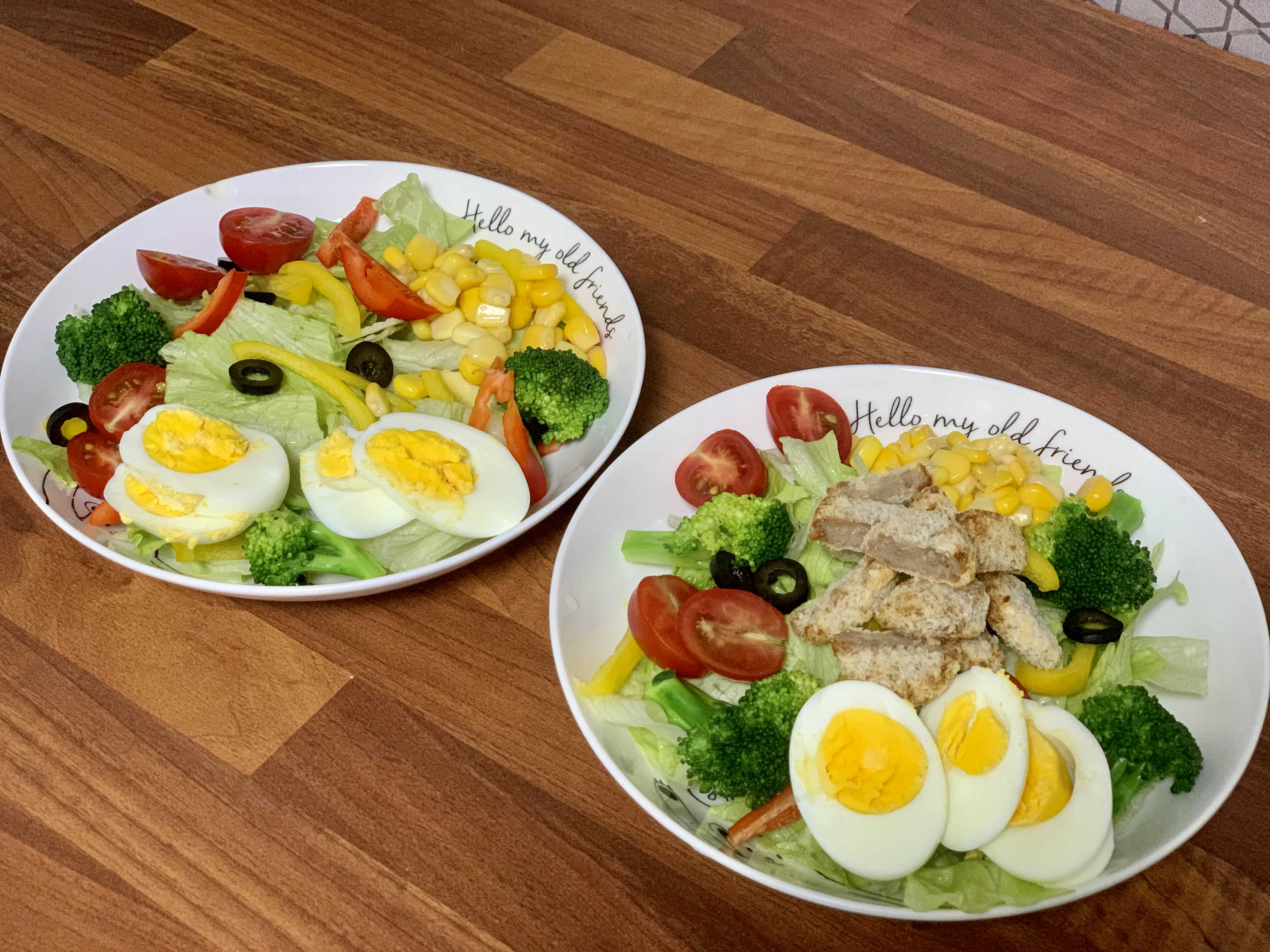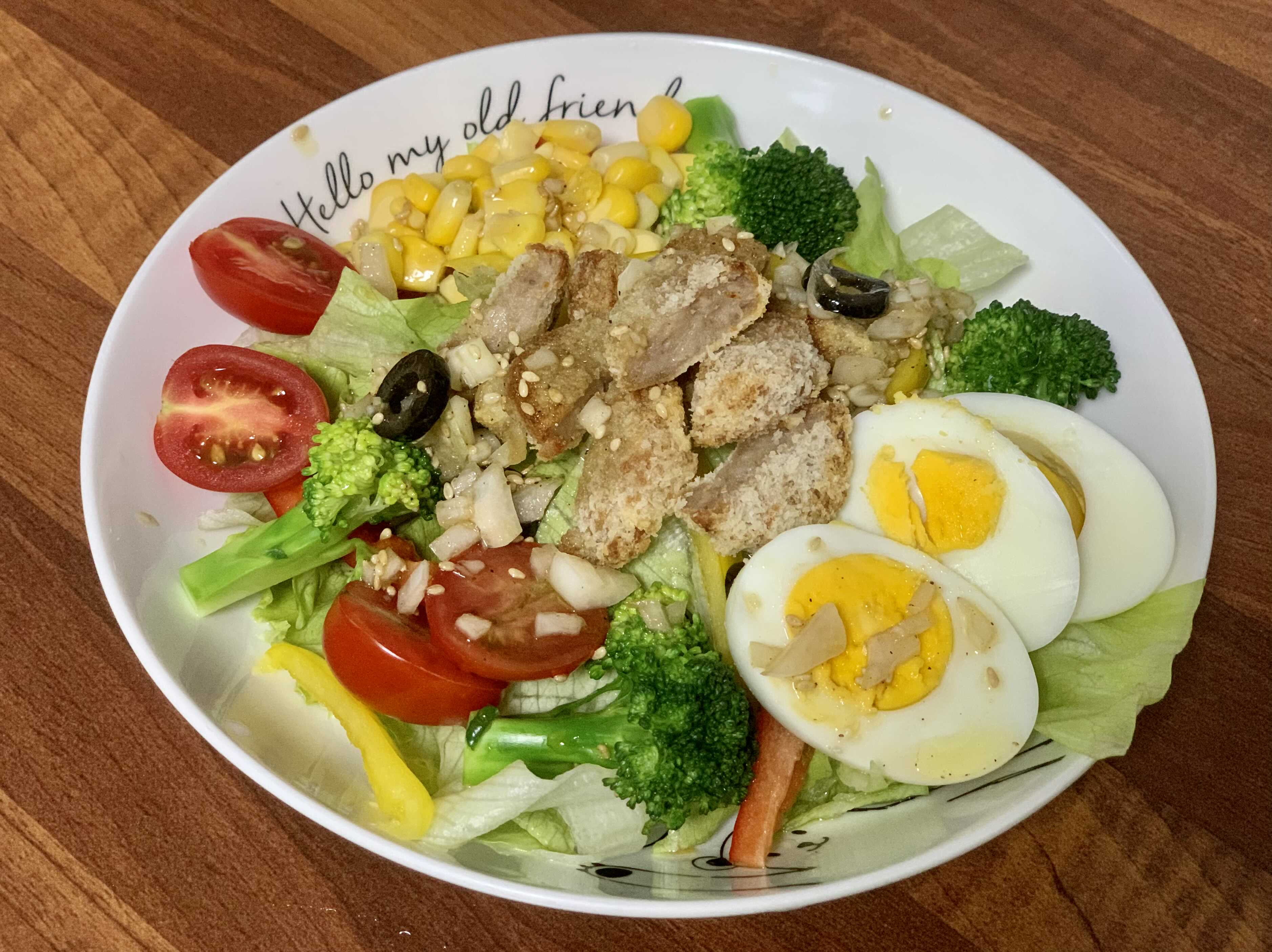 오늘 바로 먹을 샐러드는 돈가스를 소복하게 올렸습니다.