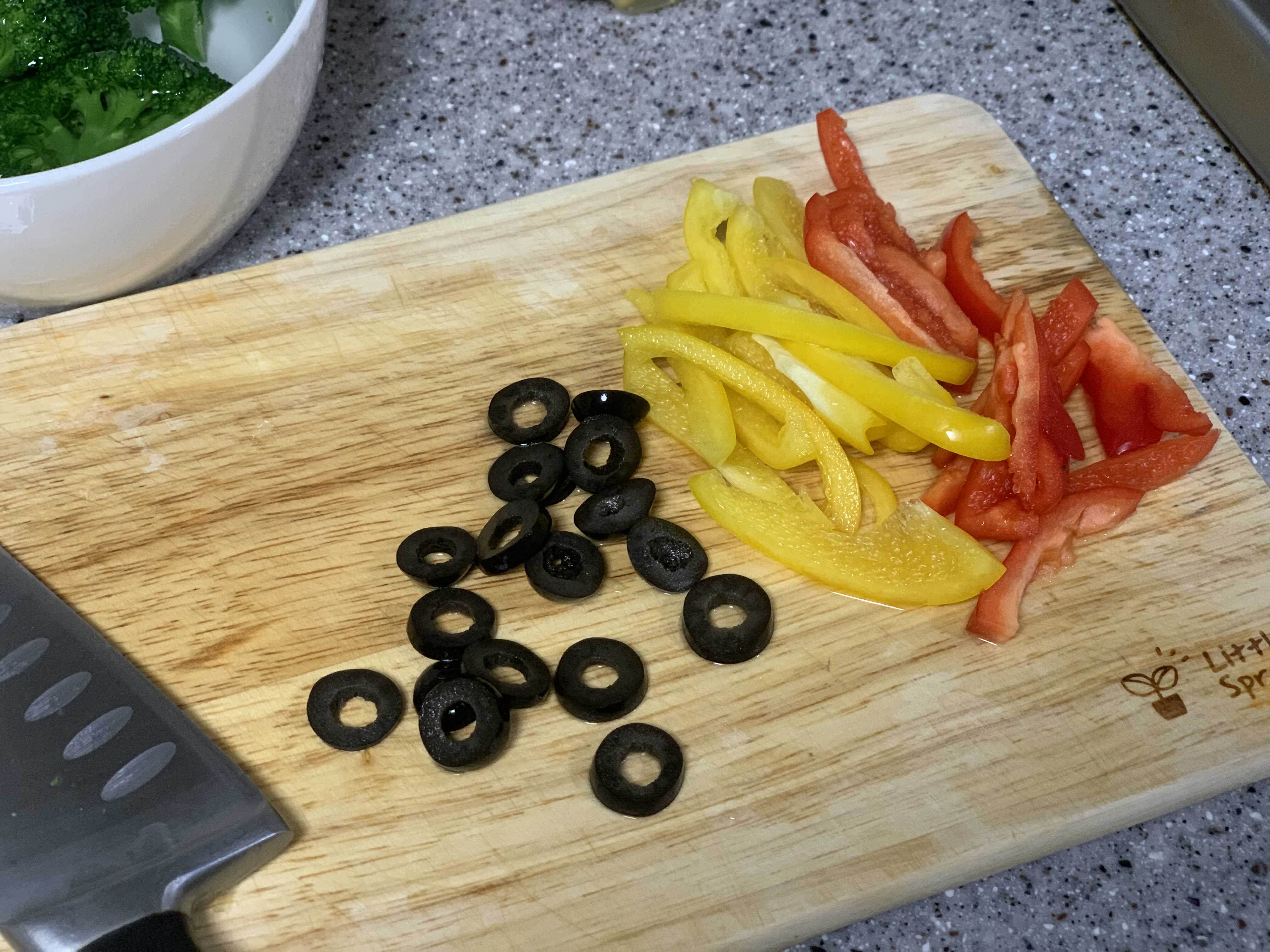 파프리카와 블랙올리브도 썰어서 준비합니다. 한국인에게 생소한 블랙 올리브는 파스타, 샐러드, 볶음밥 등 은근히 쓰임새가 많습니다. 유통기한도 길어서 한 병쯤 구매할 만합니다.