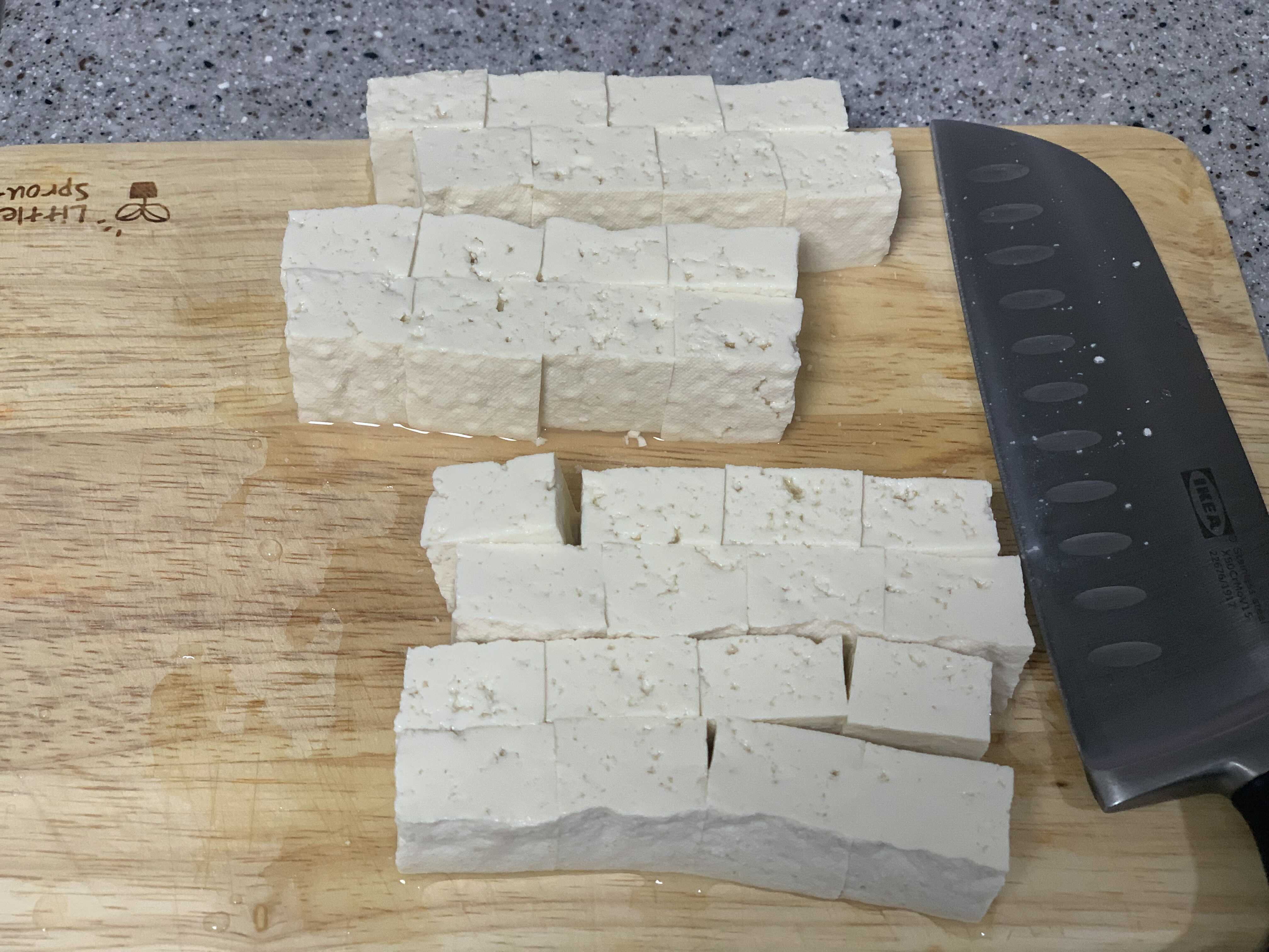 먼저 두부 한모를 정사각형 모양으로 깍둑썰기 해 줍니다.