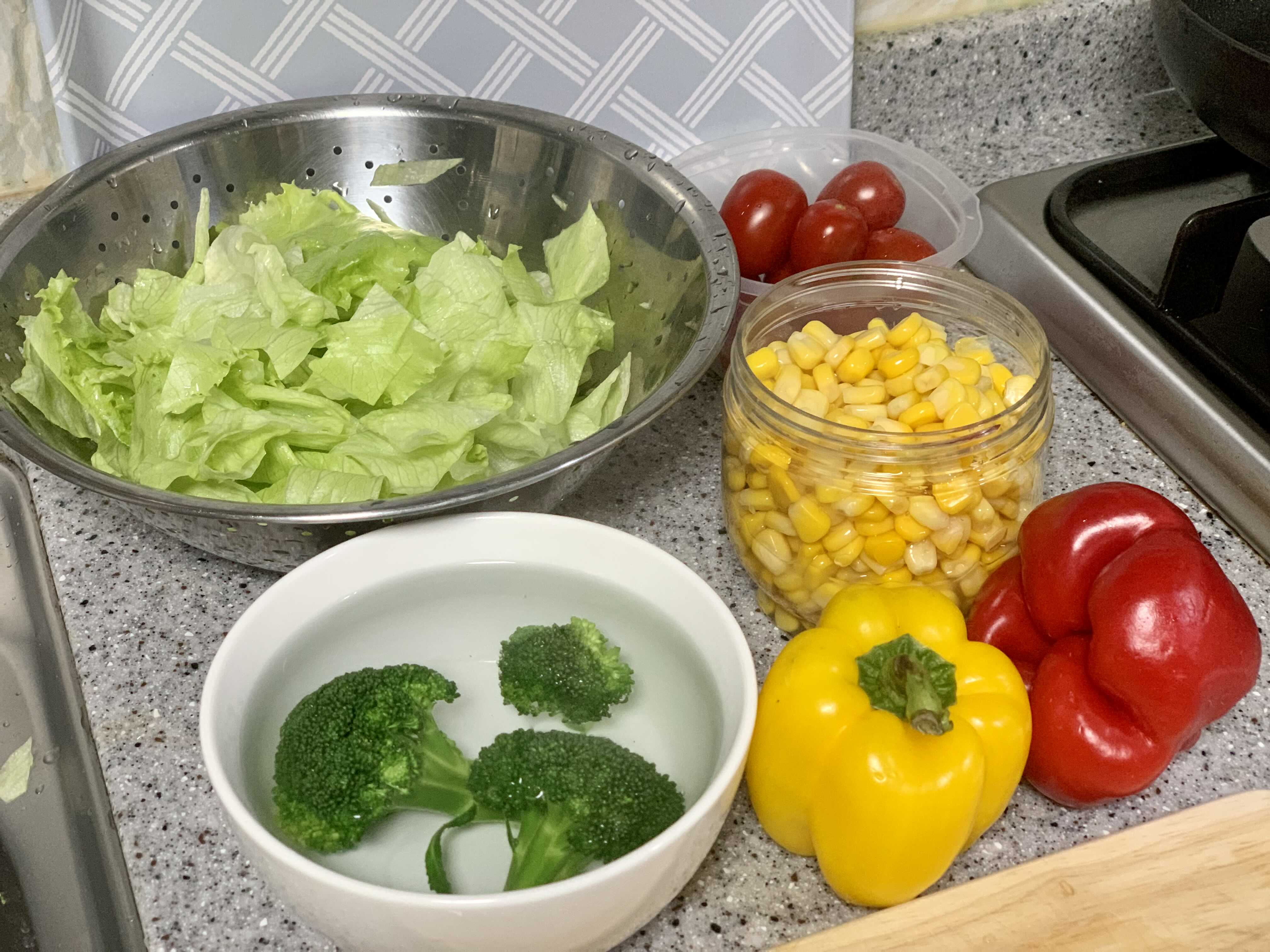 두부가 구워지는 동안 샐러드 야채를 손질합니다.