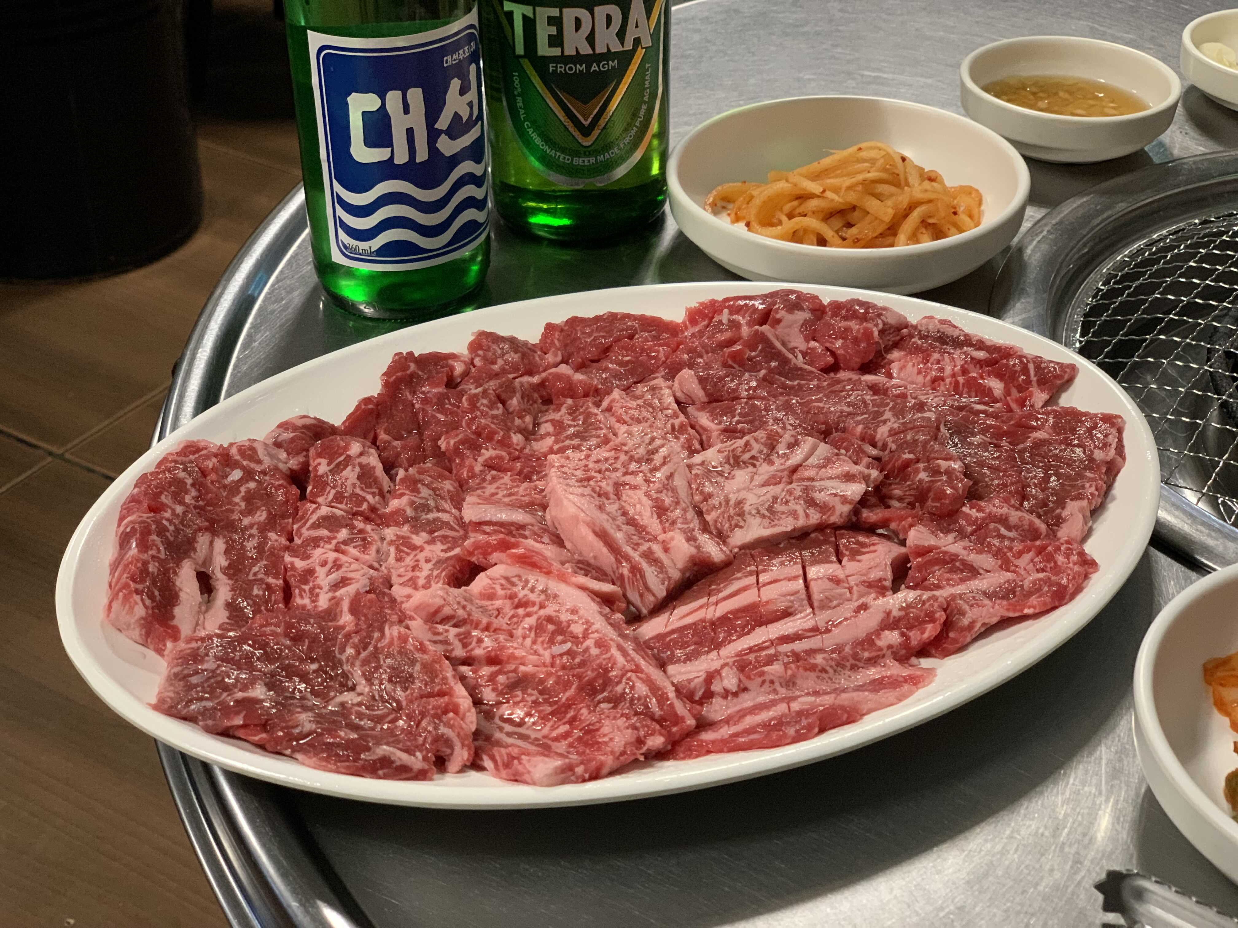 마블링도 적당한 것이 고기 빛이 좋습니다. 빛깔만 봐도 벌써부터 맛있어 보입니다. 불금을 즐기기 위한 소주, 맥주도 셋팅 완료!