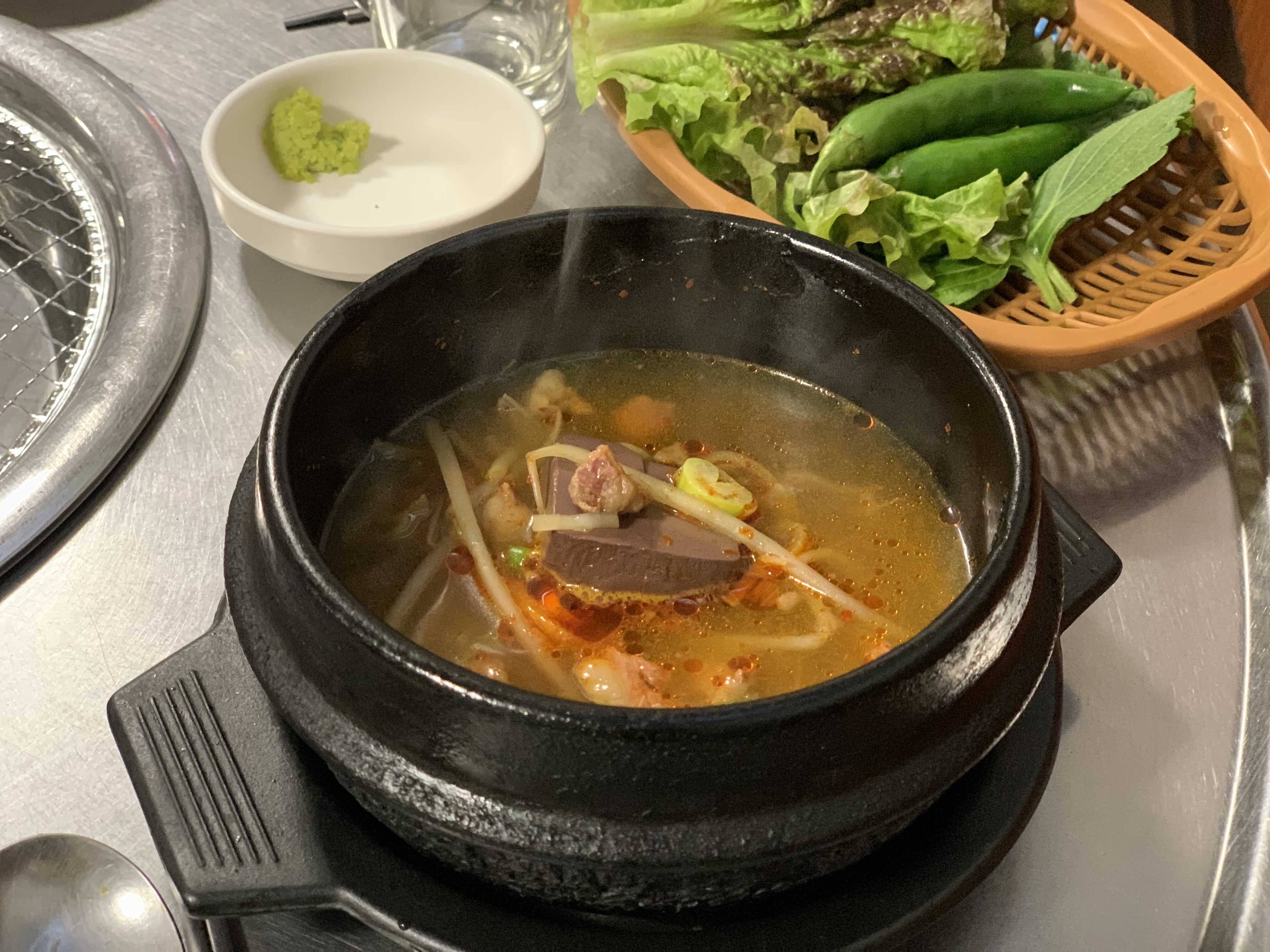 삼부자황제갈비살에는 기본 안주로 선지국이 제공됩니다. 이 선지국으로만 소주 한 병은 거뜬히 먹을 수 있을 것 같습니다.