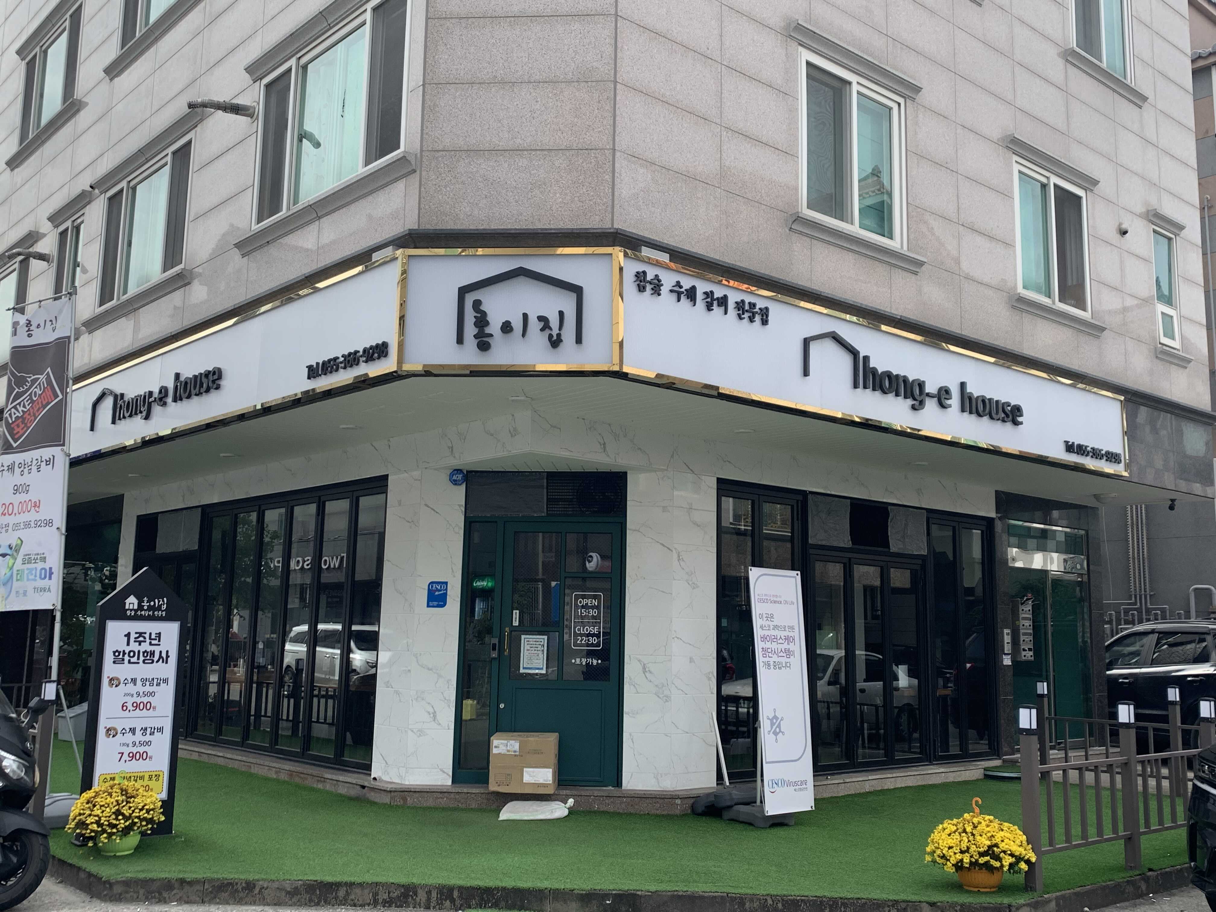 석산 택지에 위치한 홍이집은 카페 같은 깔끔하고 모던한 외관이 특징입니다.