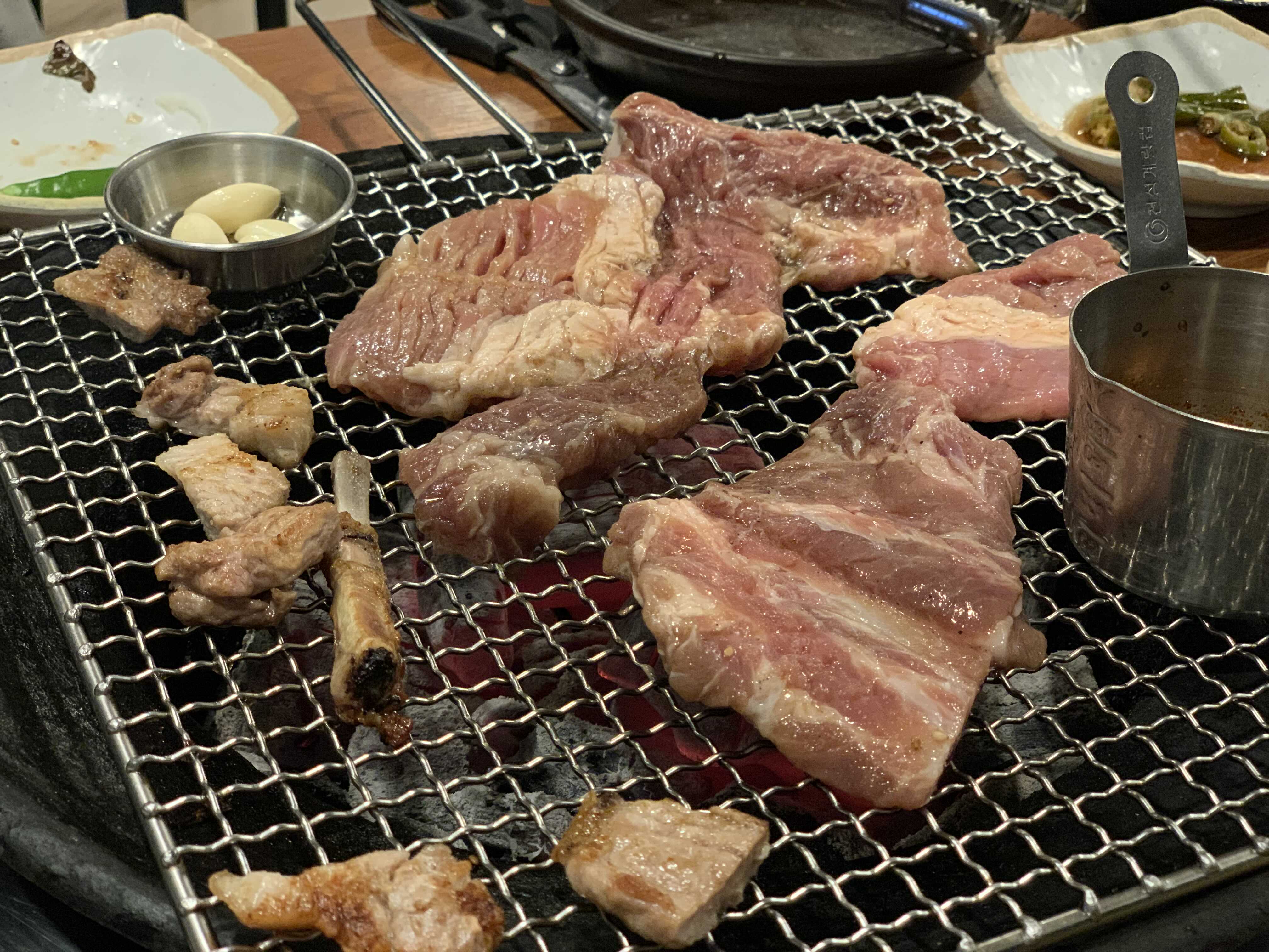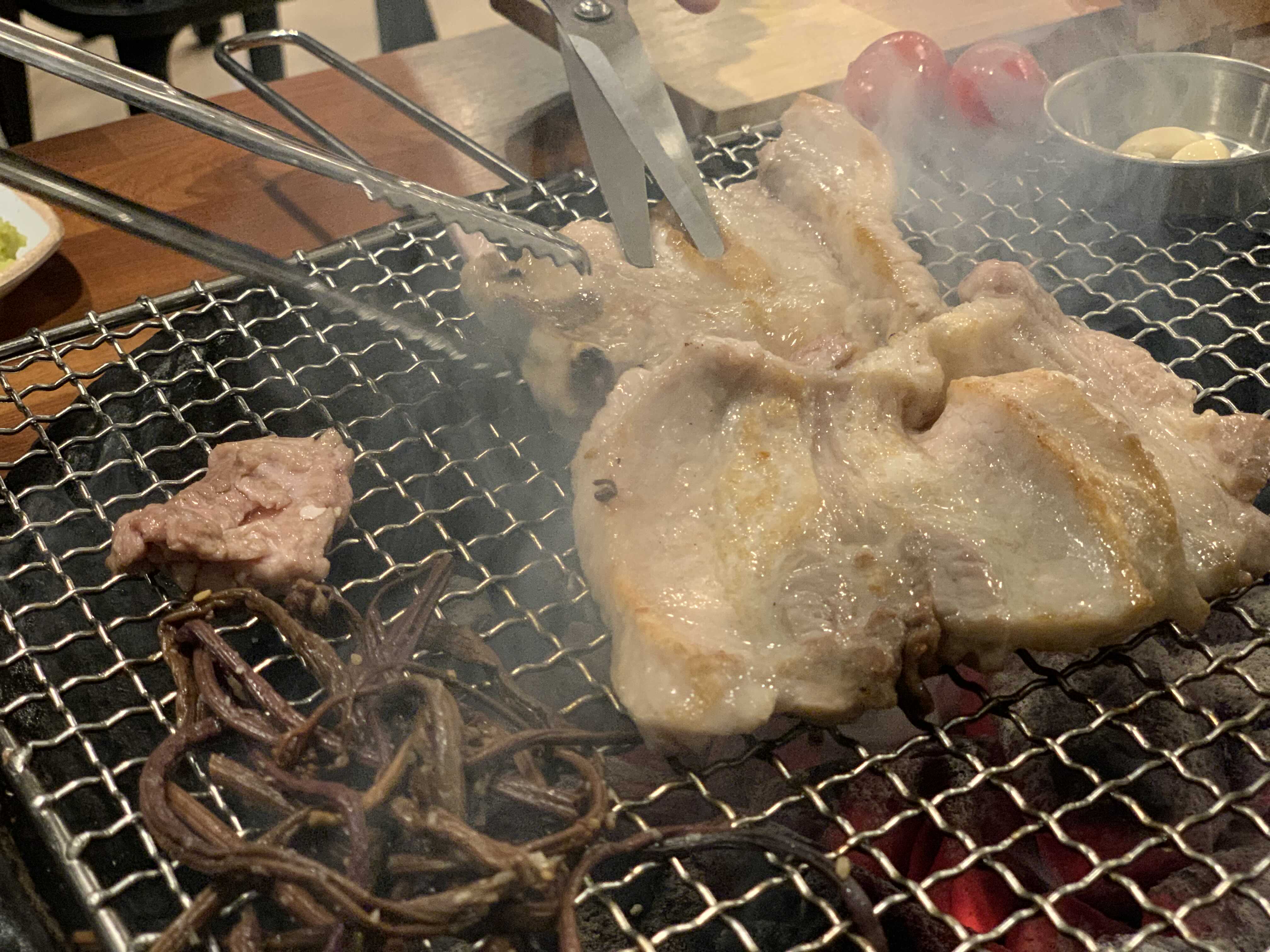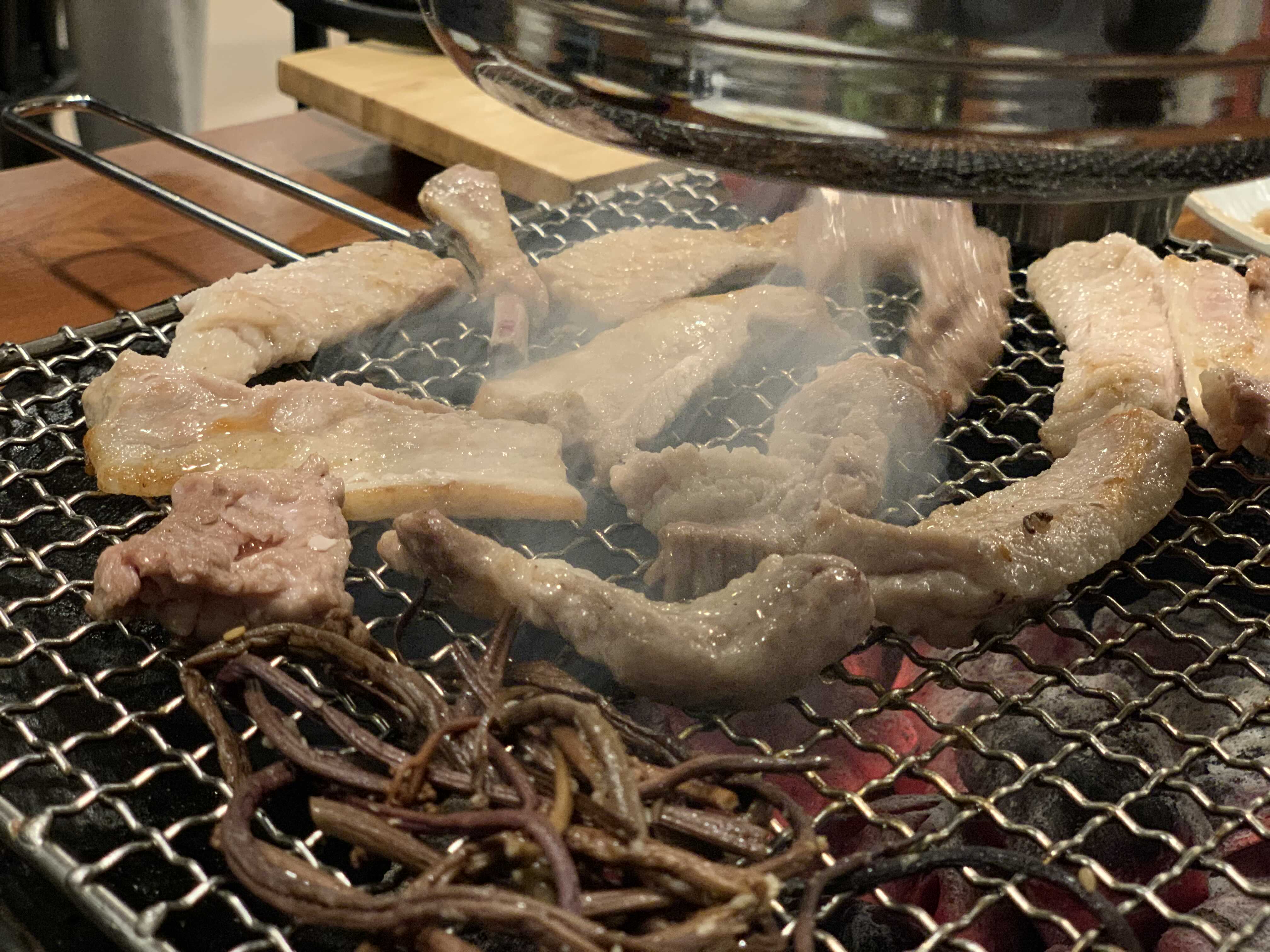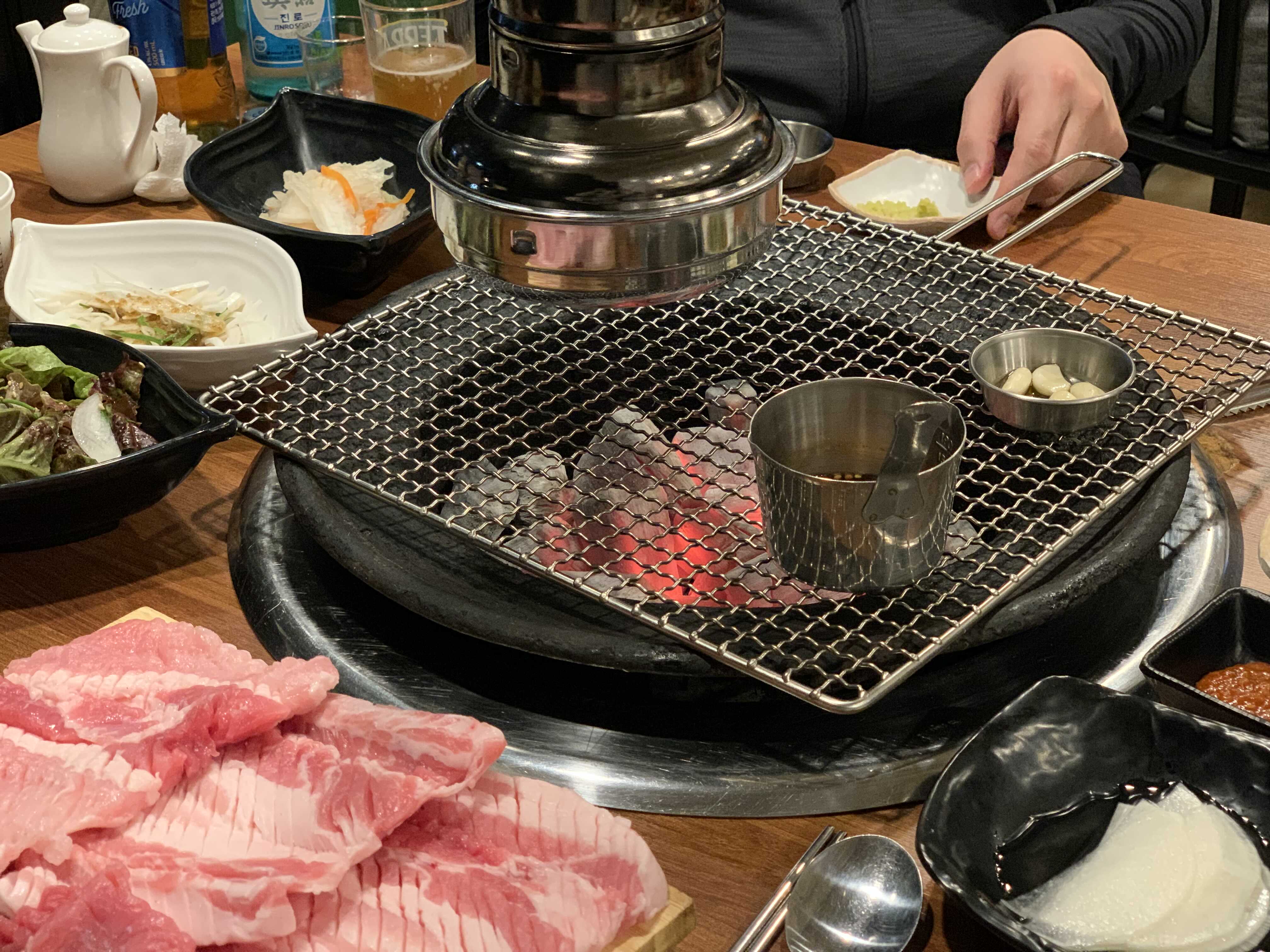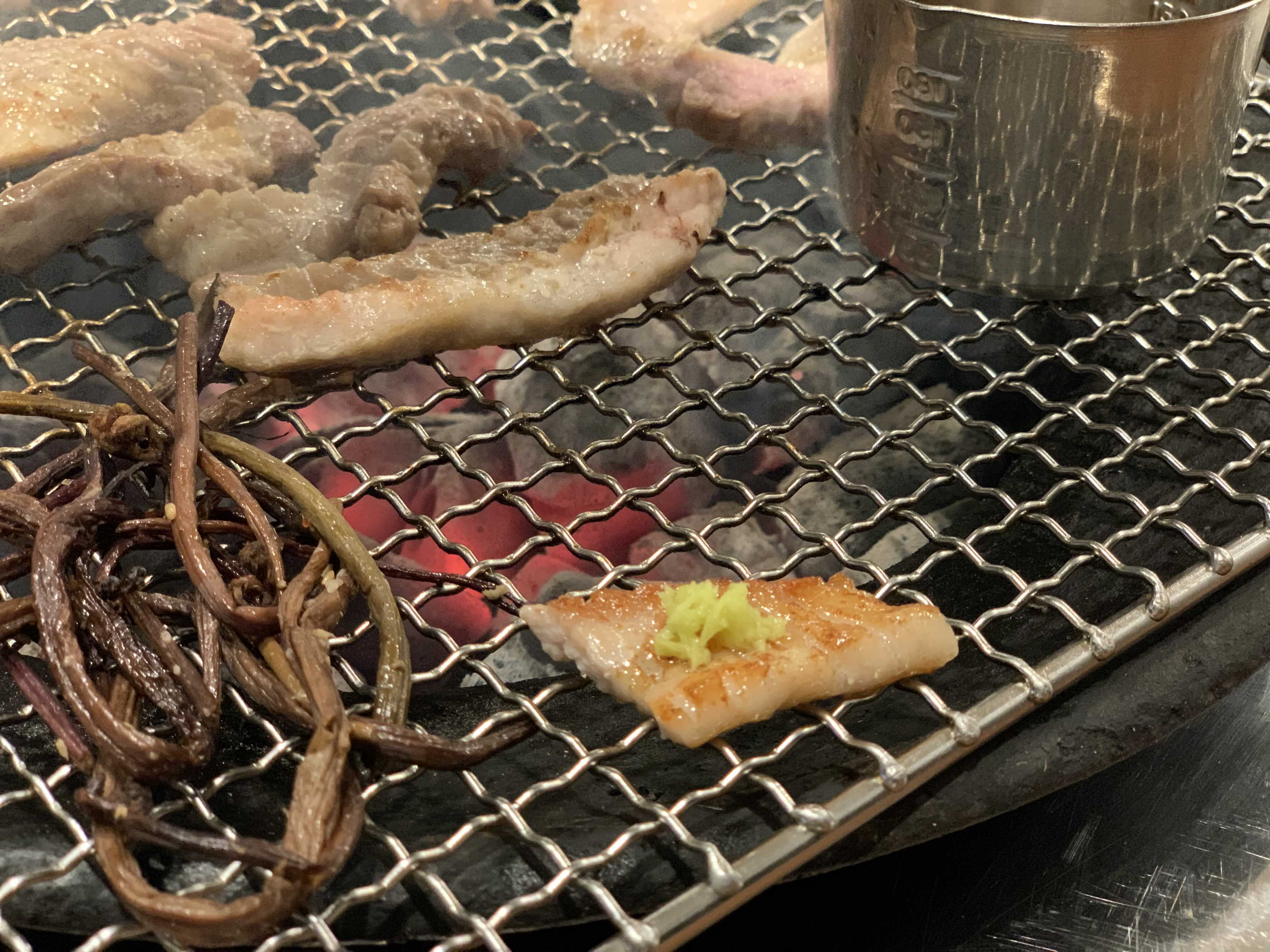참숯이 세팅되고 젓갈도 석쇠에 같이 올라갑니다.