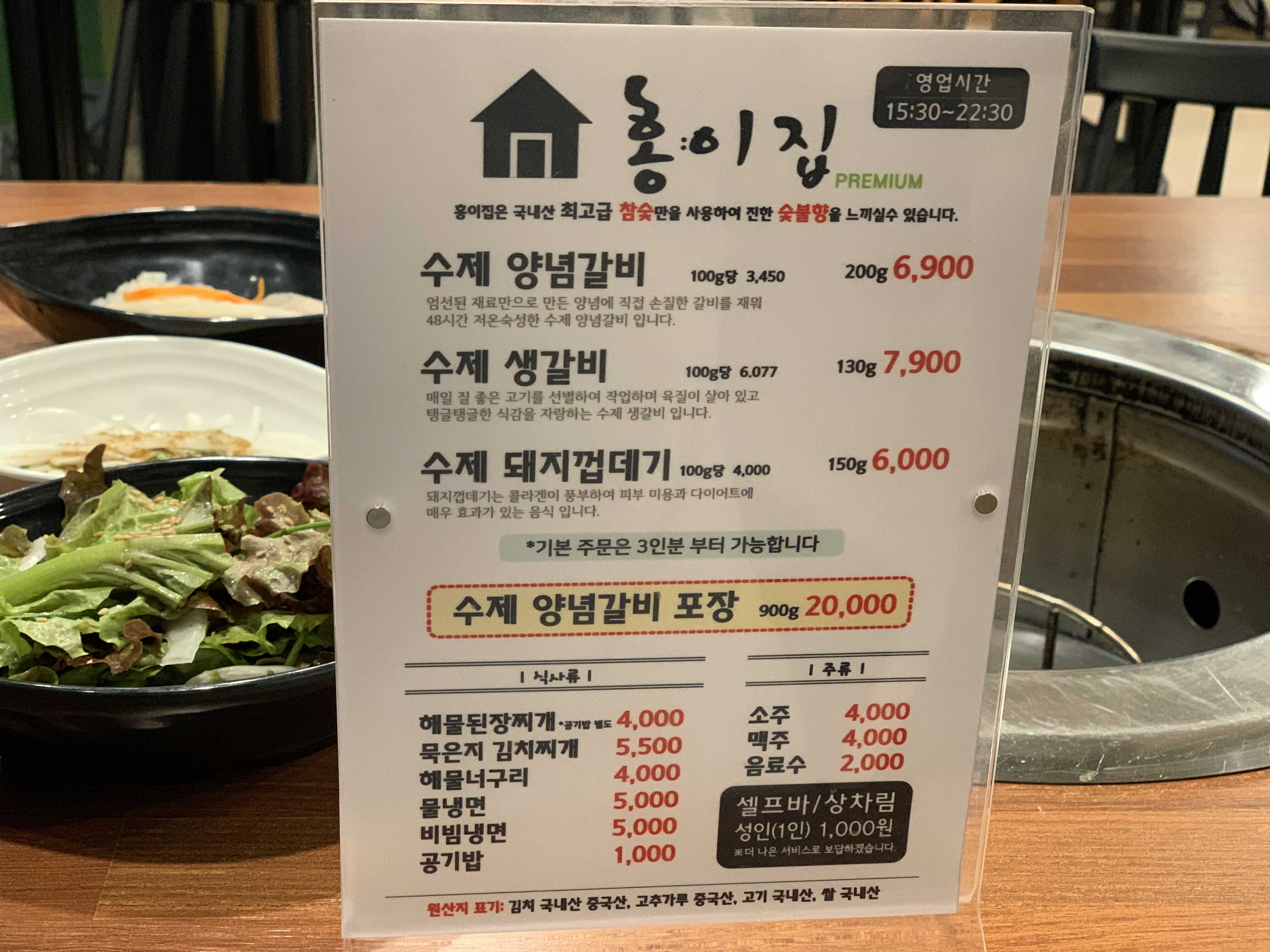 메뉴판입니다. 참숯을 사용하는데도 갈비 가격이 저렴해서 고기 원산지를 살펴봤더니 국내산 돼지고기를 사용하고 있었습니다.