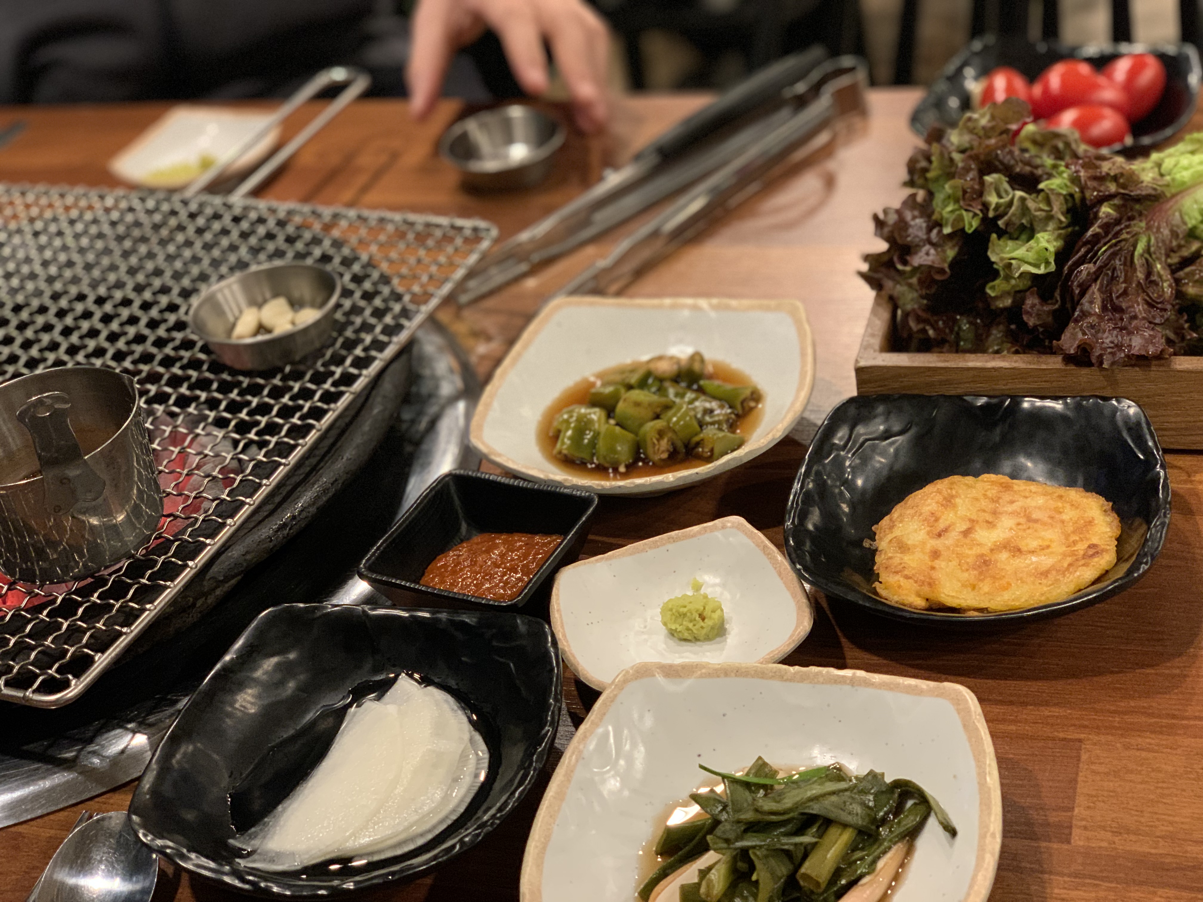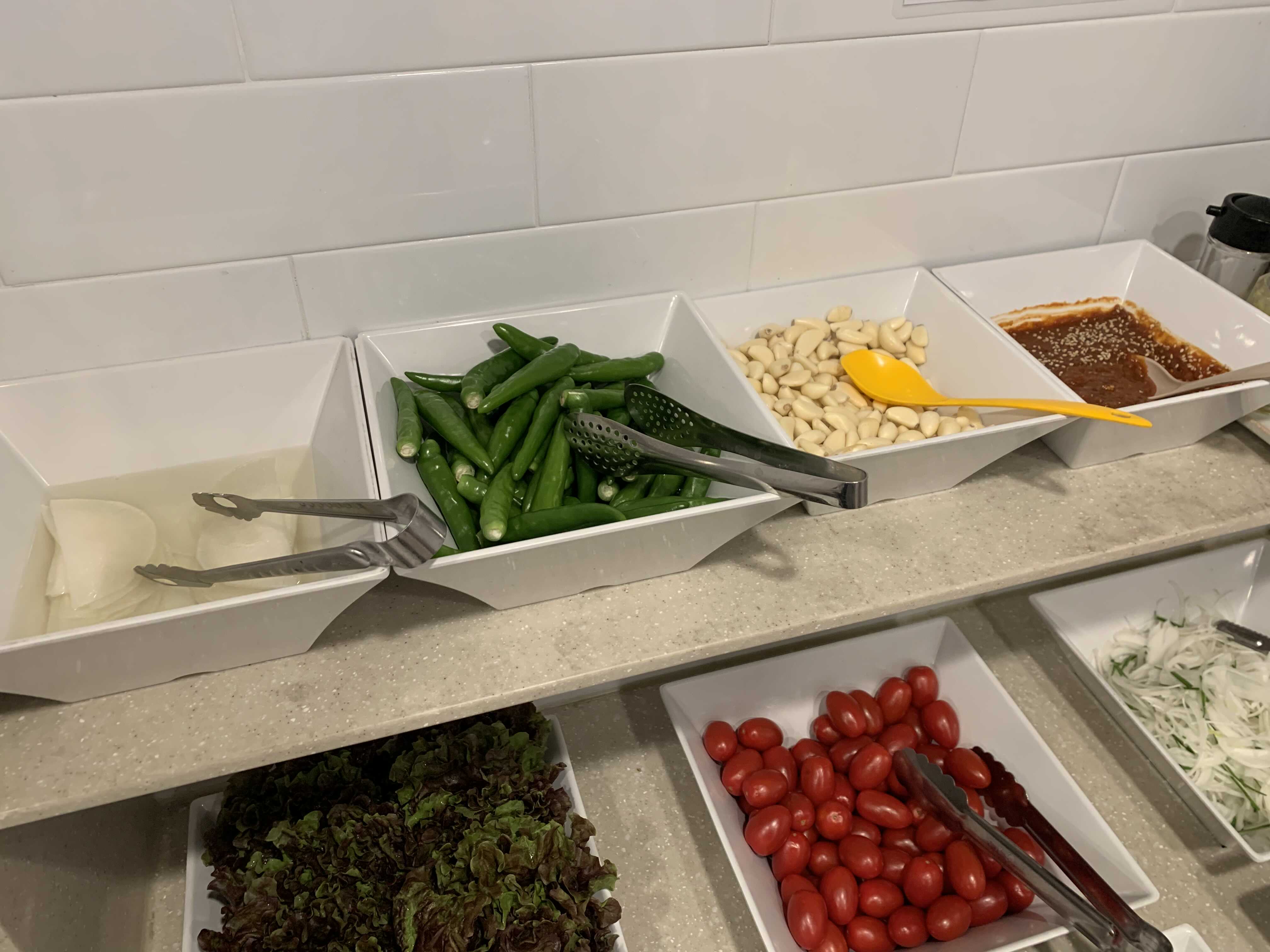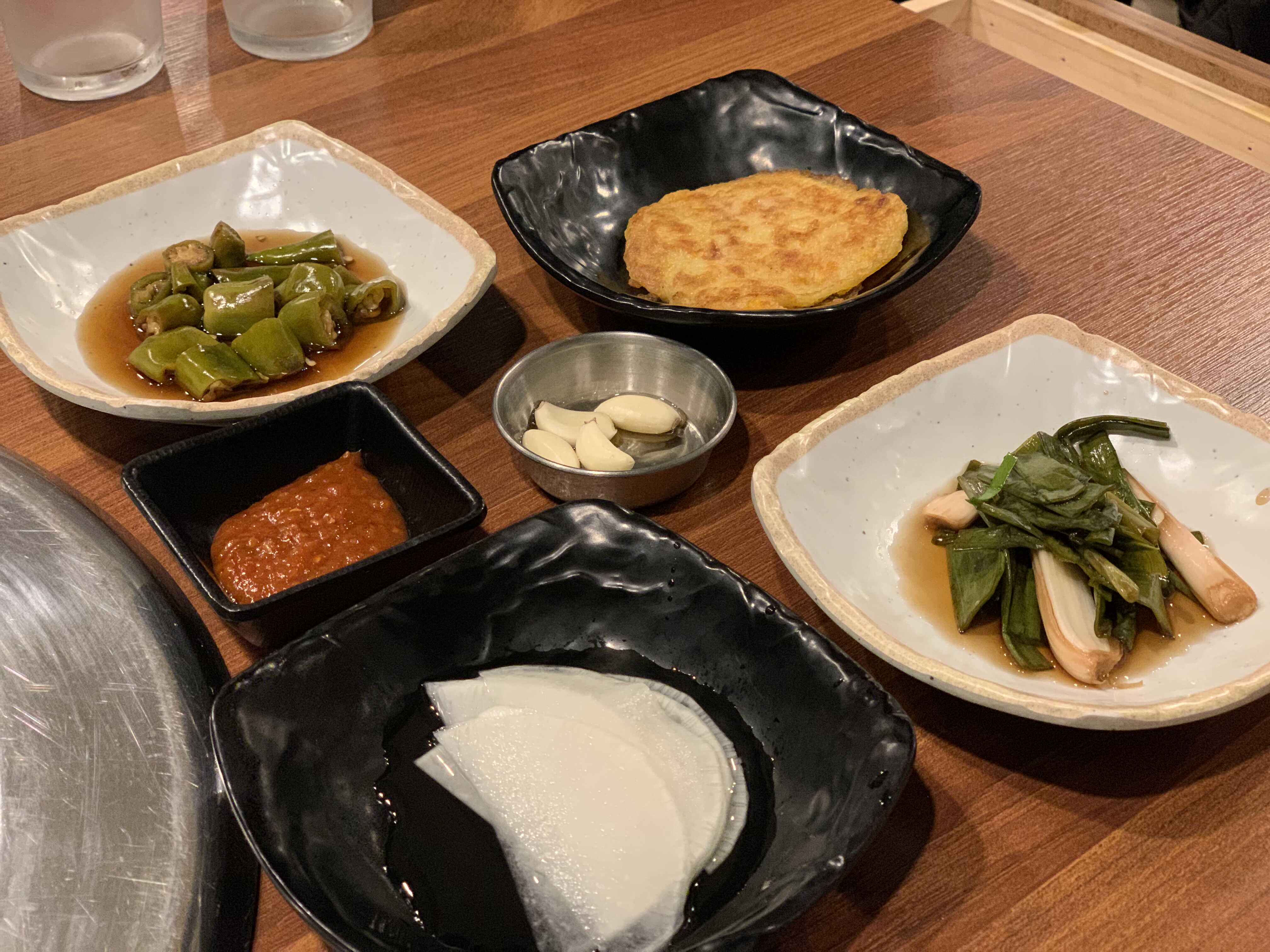 기본 반찬들이 세팅됩니다. 쪽파 장아찌, 고추 장아찌 등 고기와 함께 곁들여 먹으면 좋은 깔끔한 반찬들입니다.