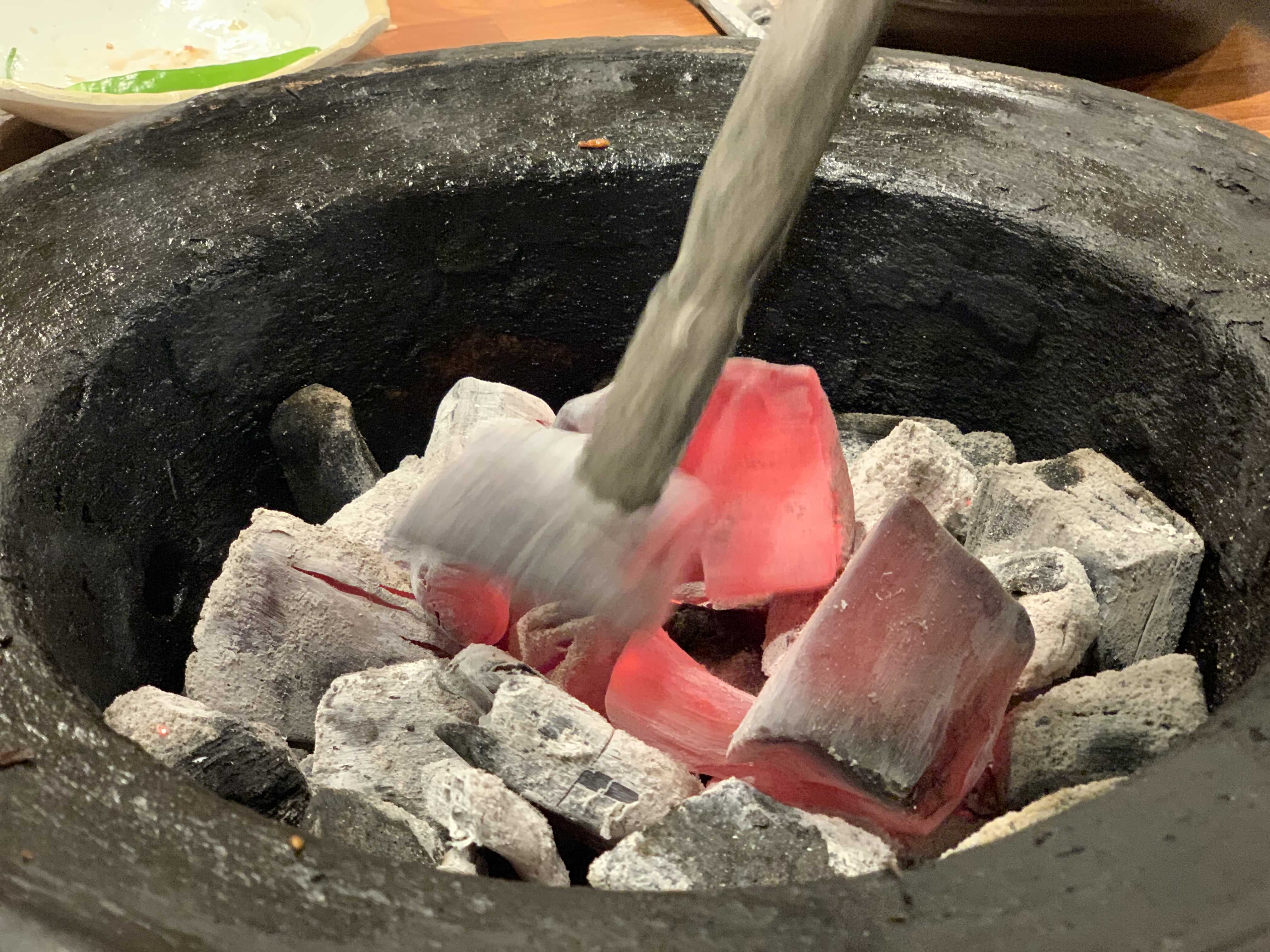 불이 약해진 것을 보고 숯을 추가로 넣어 주십니다.