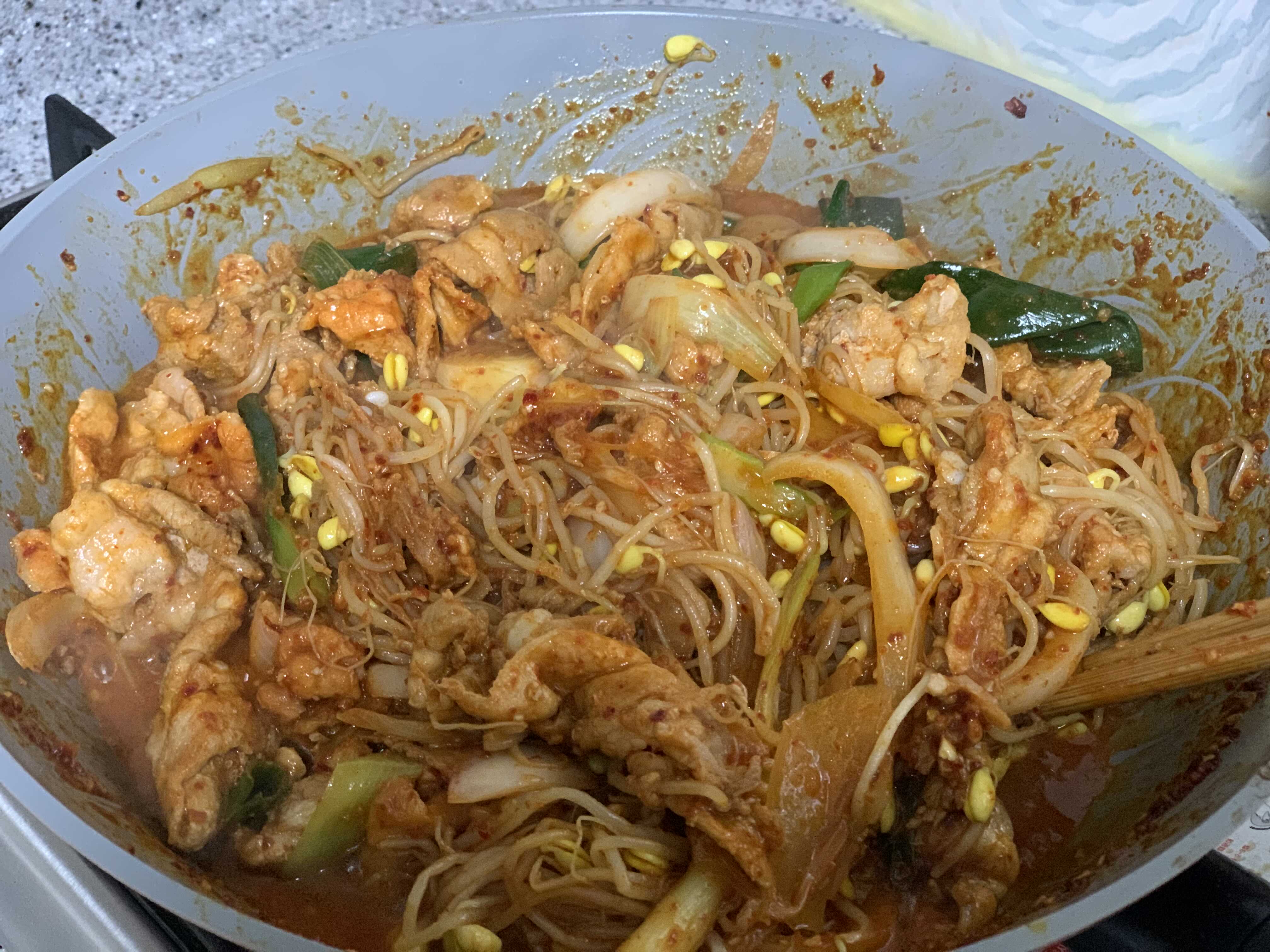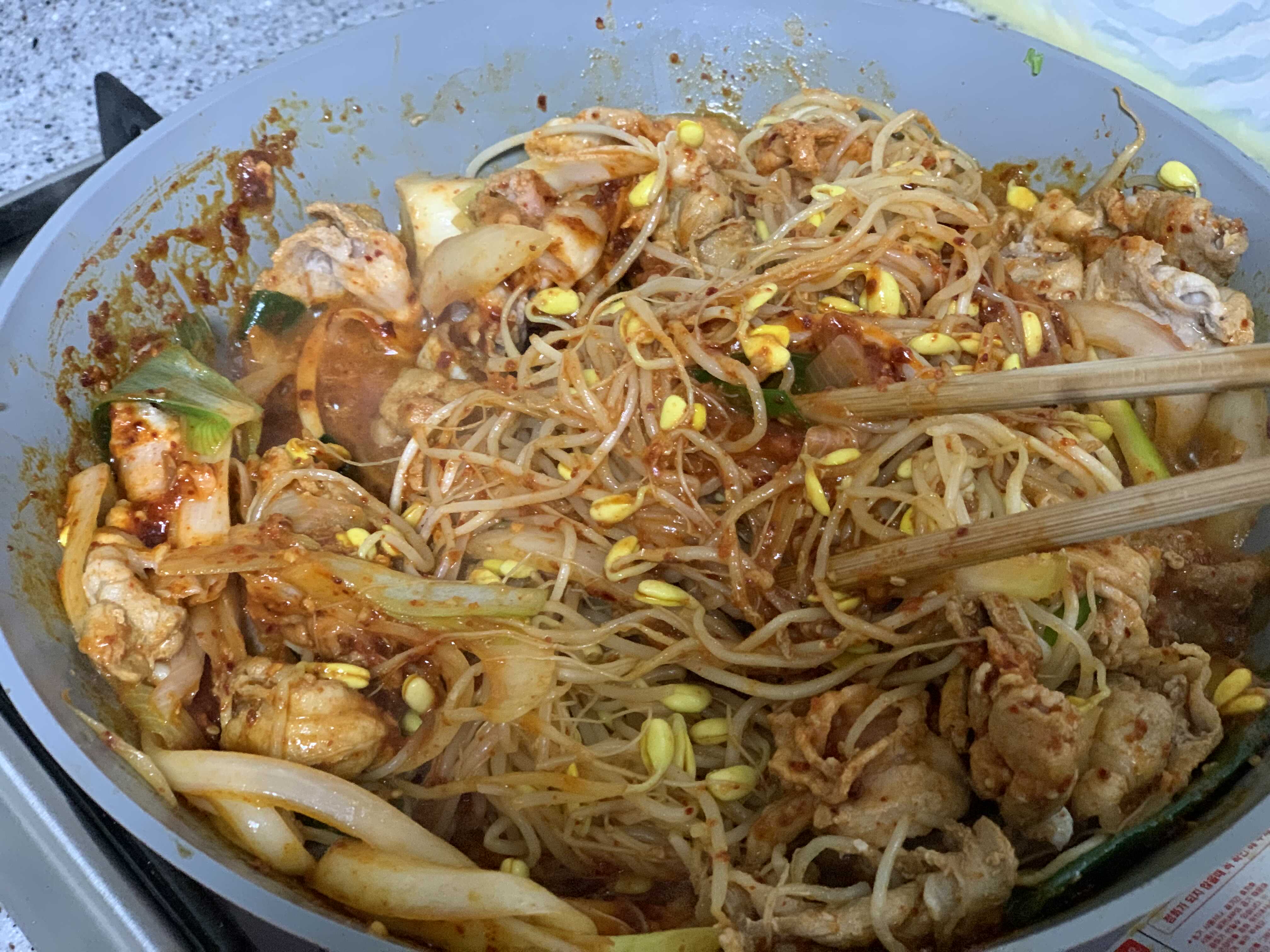 대패 삼겹살이기 떄문에 금방 고기가 익어서 너무 오래 끓이지 않아도 됩니다. 이제 슬슬 콩불 비주얼이 나옵니다.