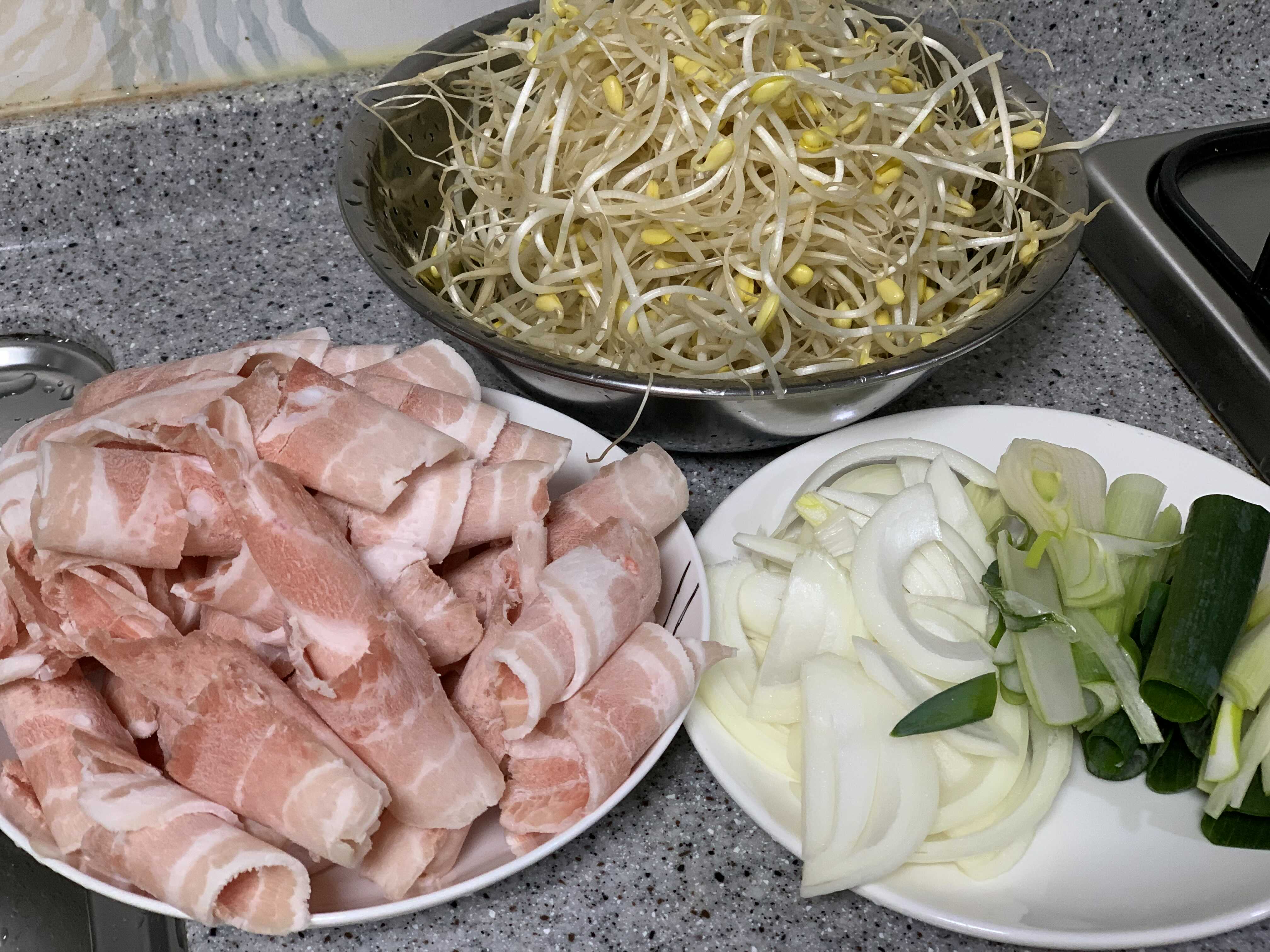 콩나물 300g, 대패삼겹살 400g, 대파 한단, 양파반개(생략가능)