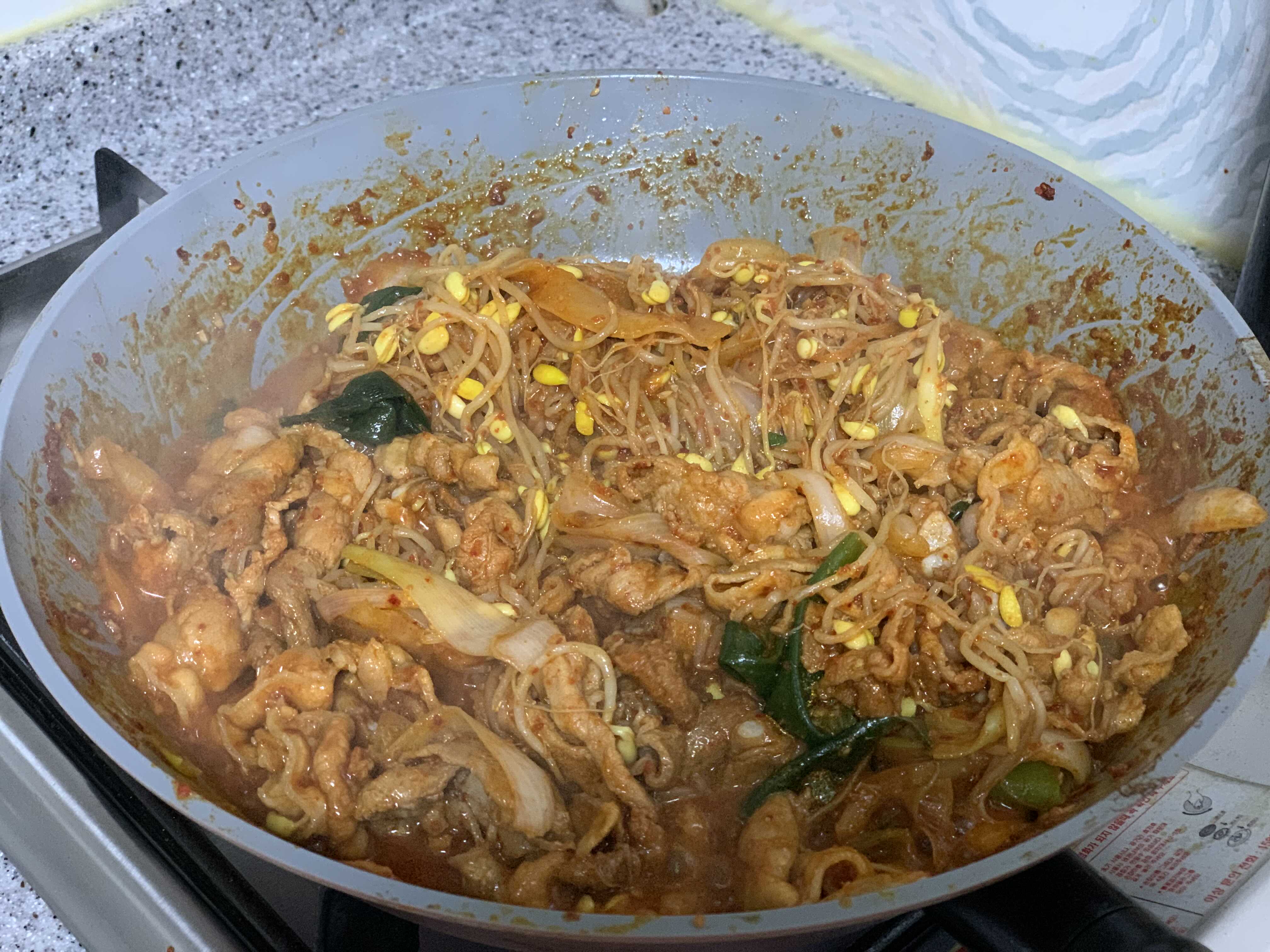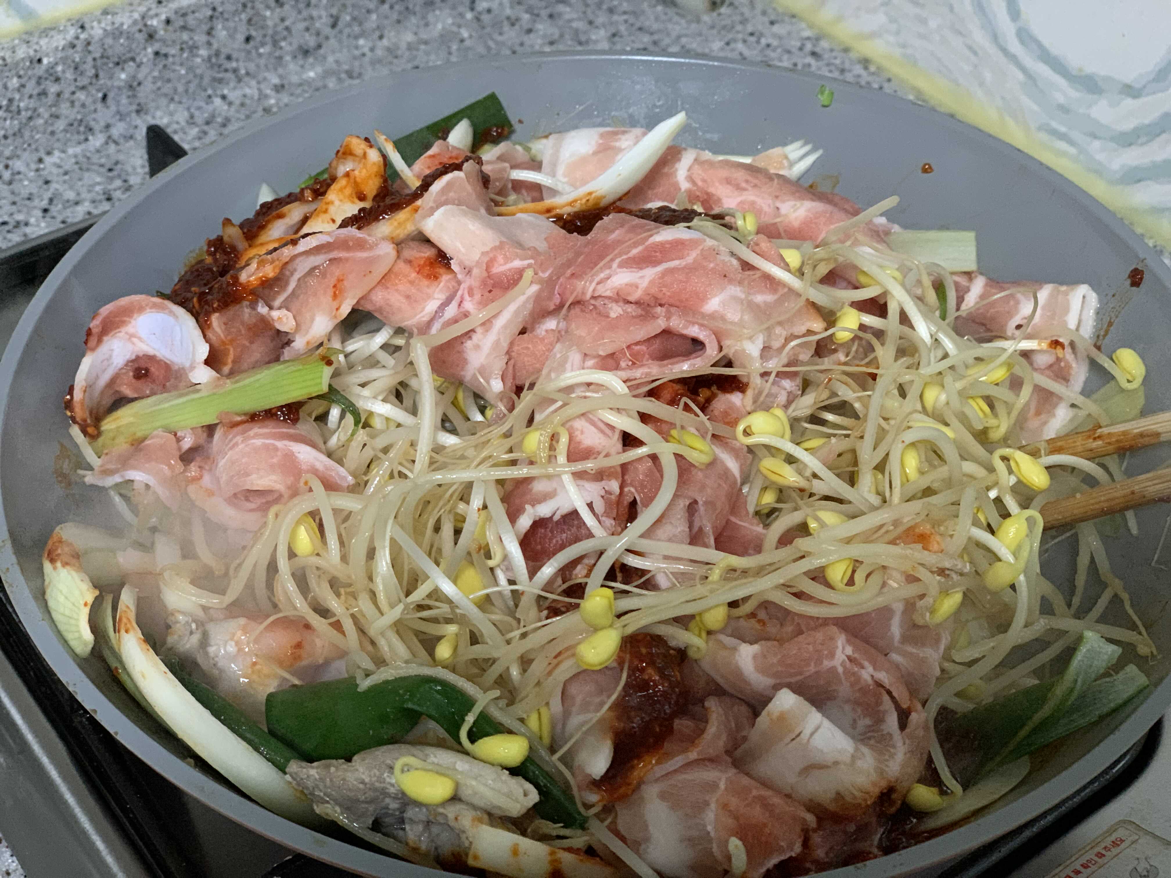 콩불(콩나물 불고기) 레시피를 소개합니다. 콩불은 간단한 재료에 집에 흔히 있는 양념으로 뚝딱 만들 수 있는 요리입니다. 팬에 재료 가득 올리고 양념 호로록 부어서 끓여주면 되는 너무 쉽지만 맛있는 요리입니다.