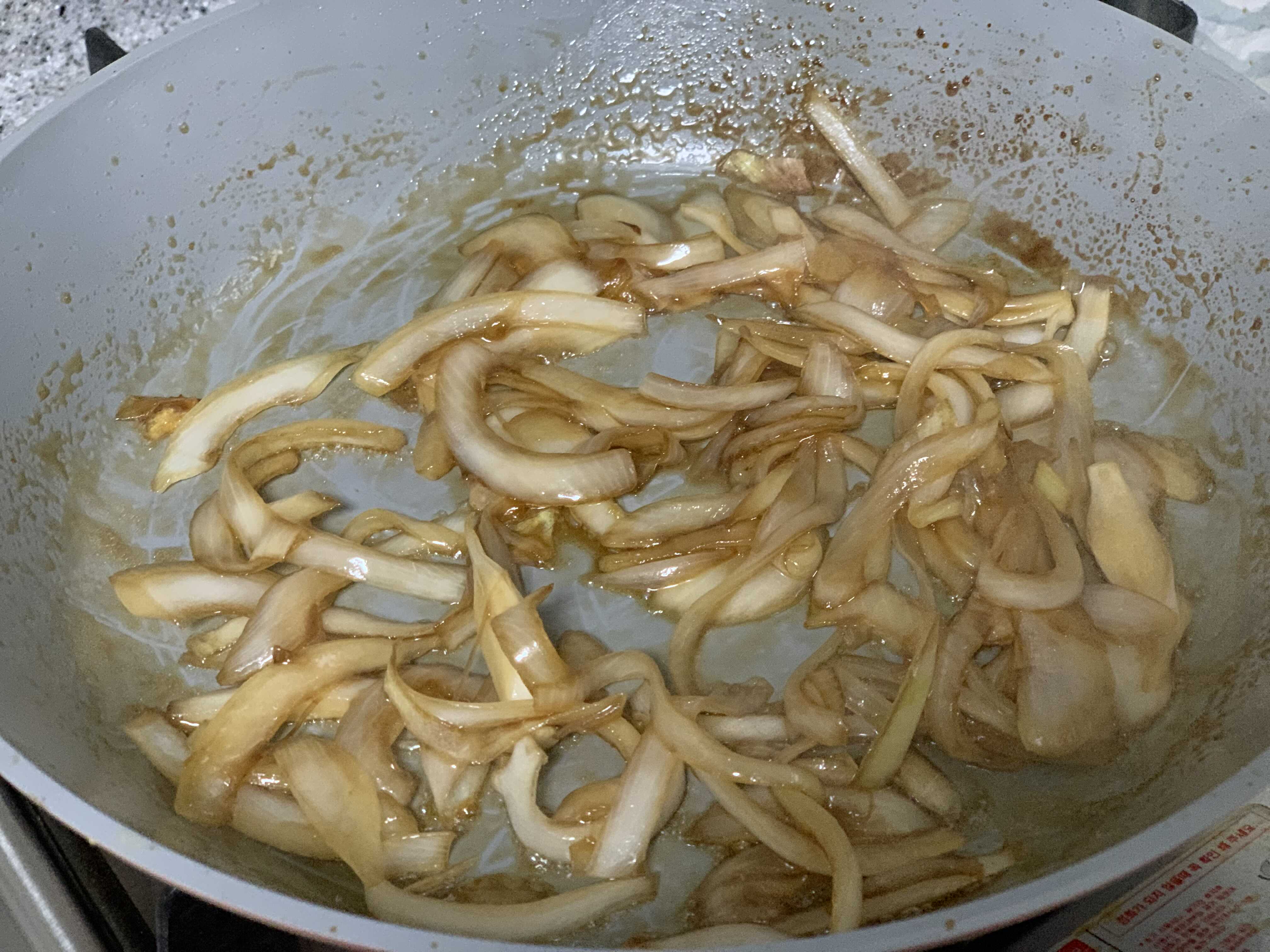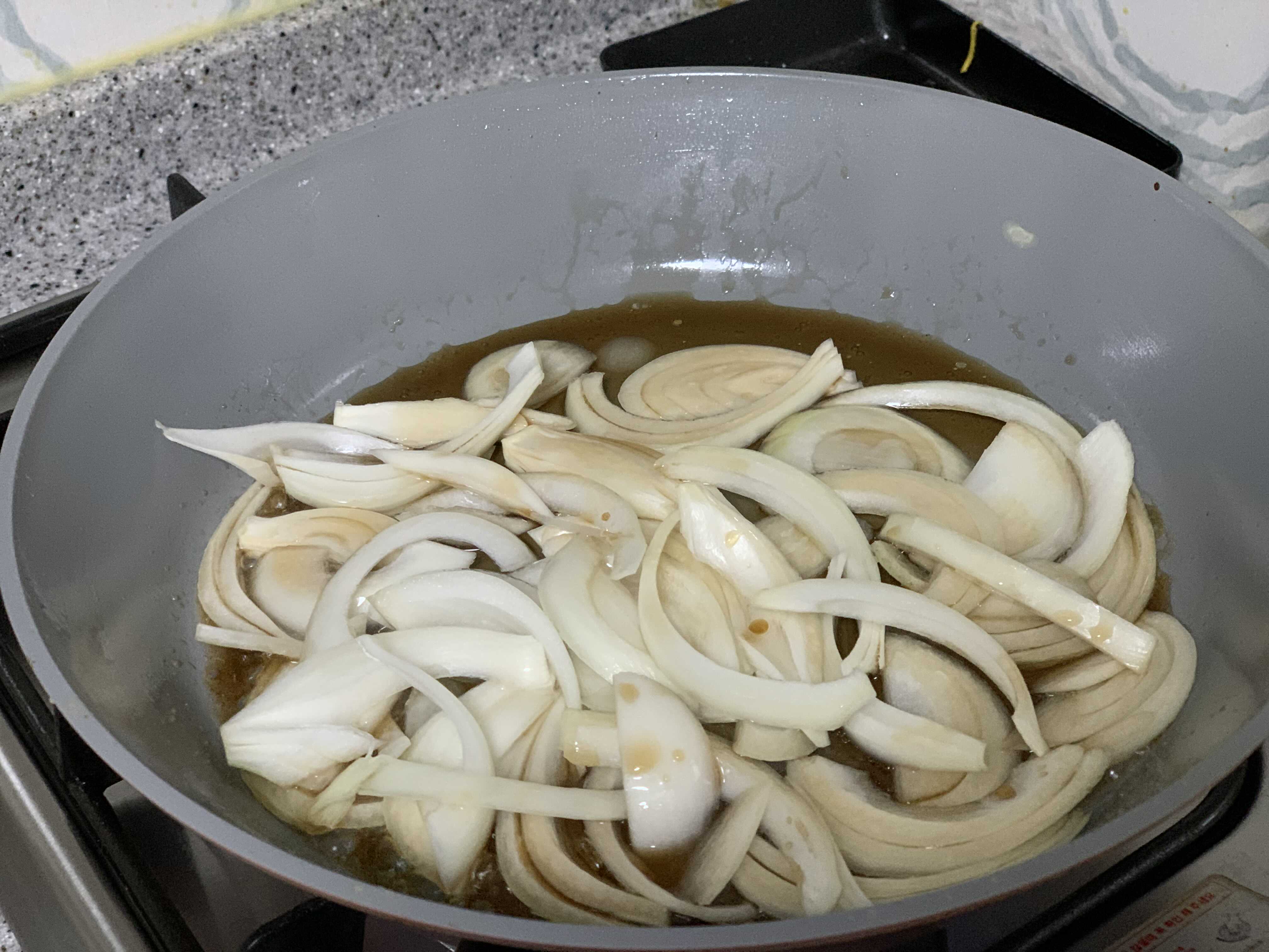 이제 팬에 기름을 두르고 아까 만들어 놓았던 간장 소스와 함께 양파를 넣고 조려줍니다.