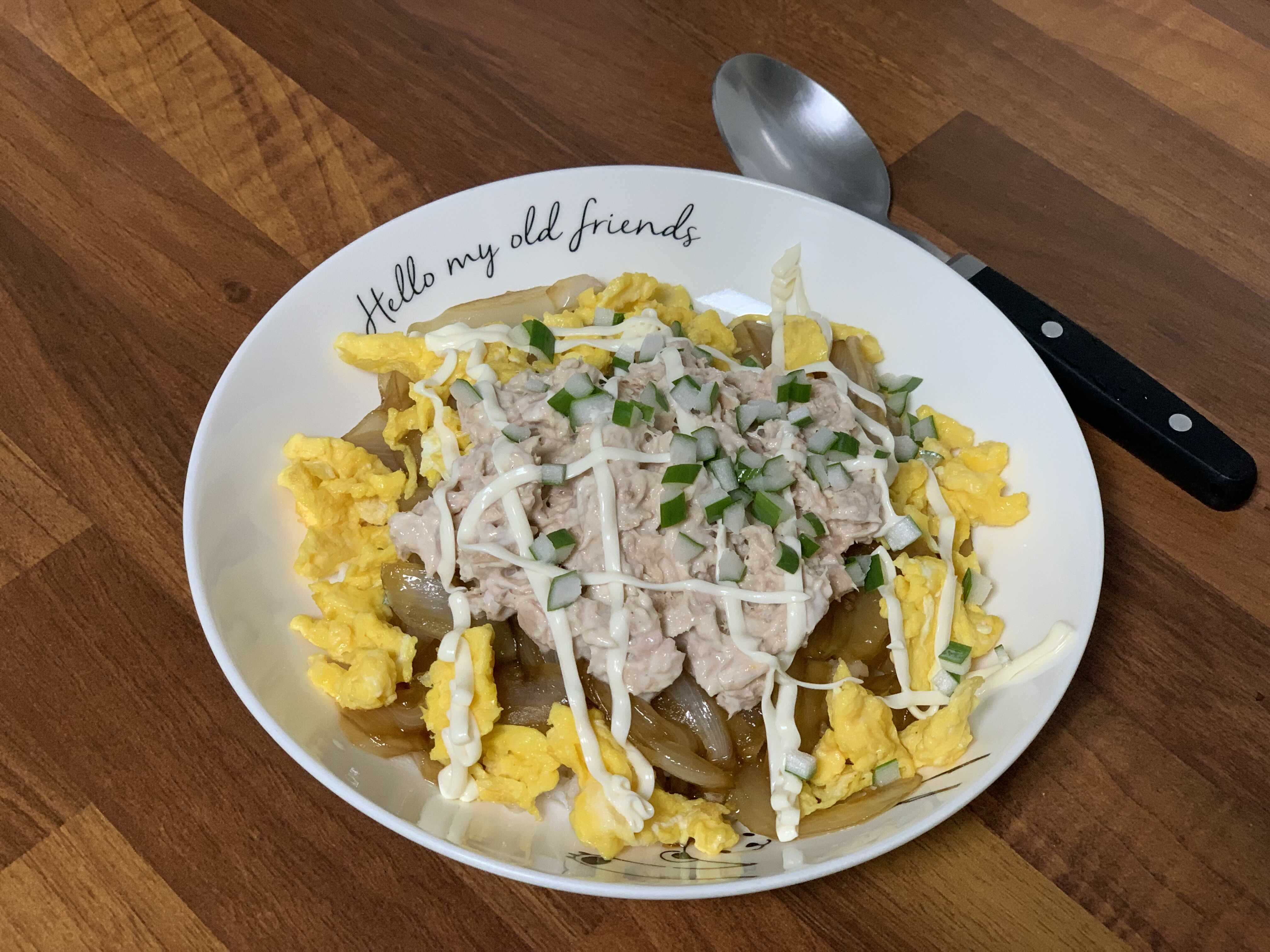 참치마요덮밥은 양파 없이 간장 소스만 졸여서 끼얹어 먹어도 되지만 양파를 넣으면 참치의 비린맛도 잡아주고 훨씬 맛있습니다.