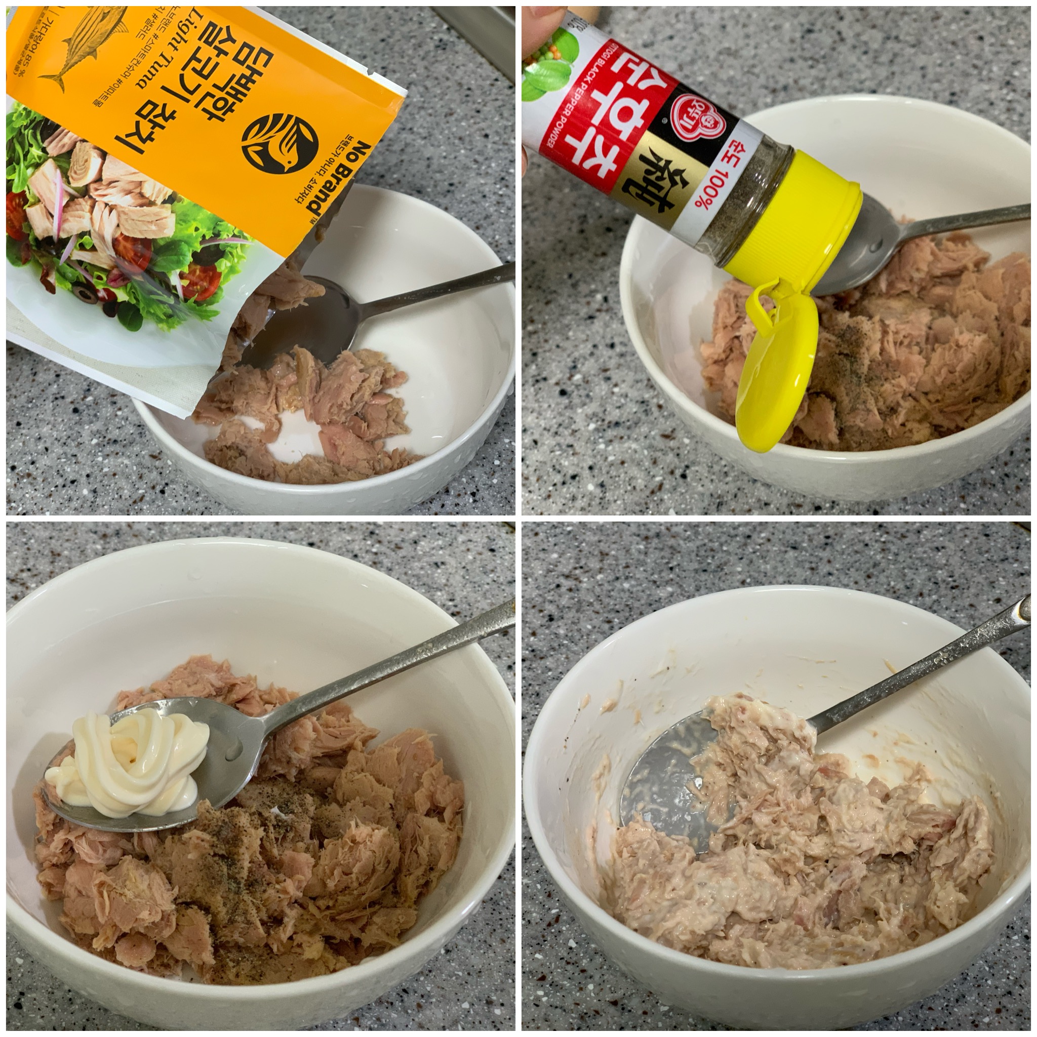 참치는 기름을 꼬옥 짜서 준비하고 후추 약간 마요네즈 3스푼을 넣고 잘 섞어 줍니다. 참치 준비도 끝.